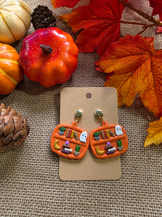 Boucles d'oreilles en argile polymère collection ESPRIT D'AUTOMNE modèle "Bibliocitrouille enchantée" - collection automne