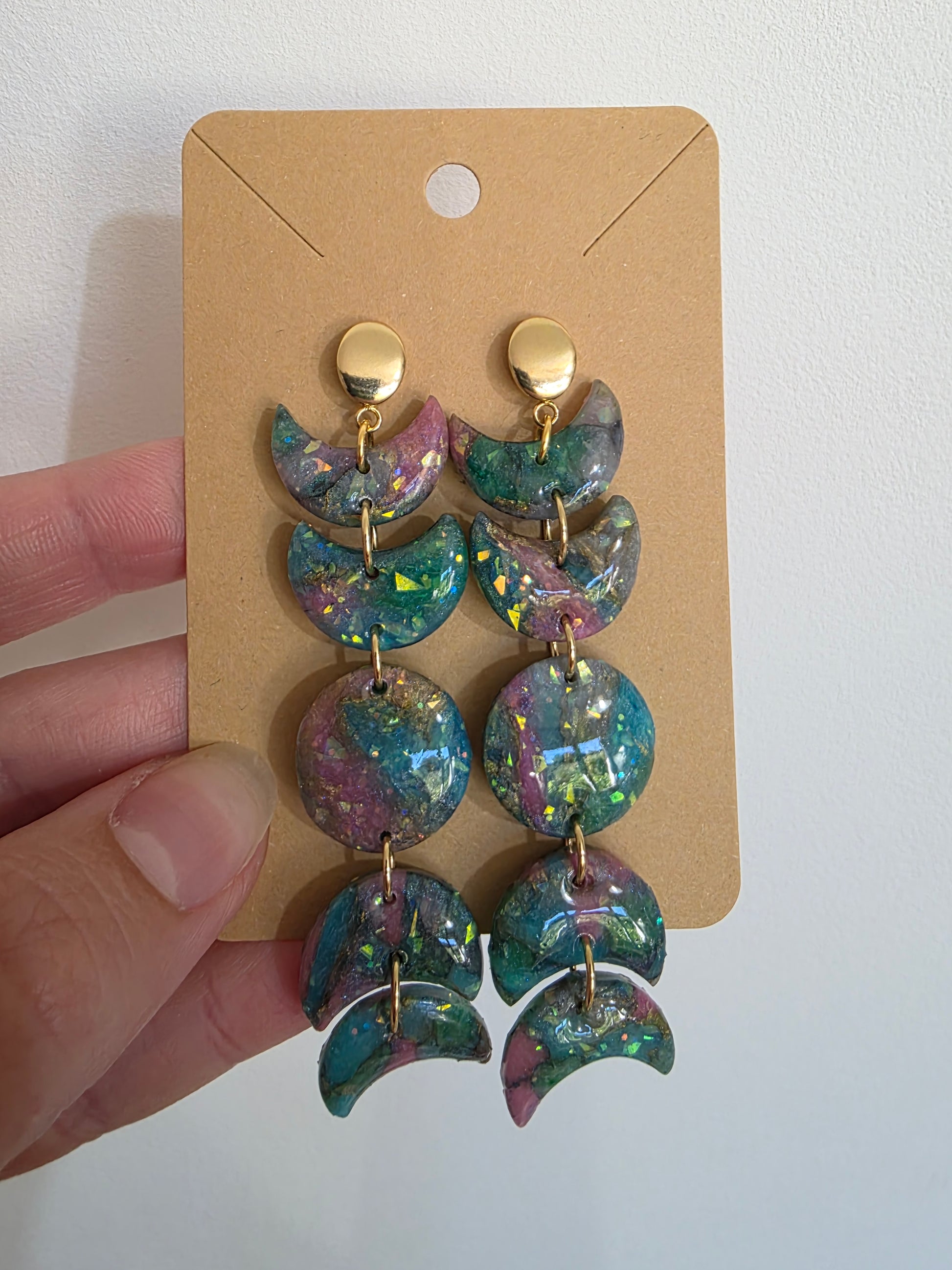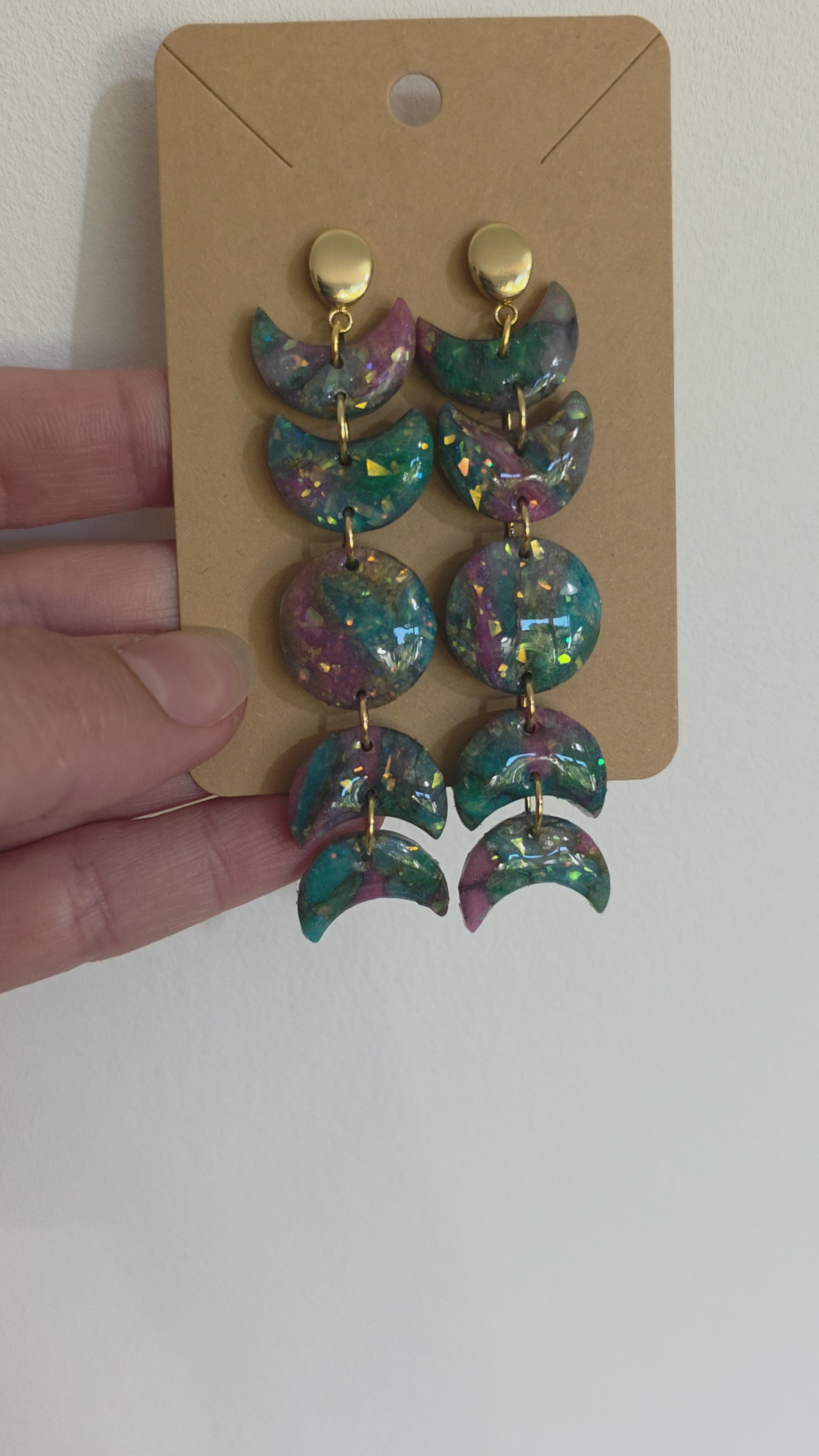 Les boucles d'oreilles sont réalisées en argile polymère, elles sont donc très légères. Elles sont recouvertes d'une fine couche de résine pour les protéger et révéler toutes leurs couleurs. Les tranches des bijoux sont vernies pour un fini soigné.