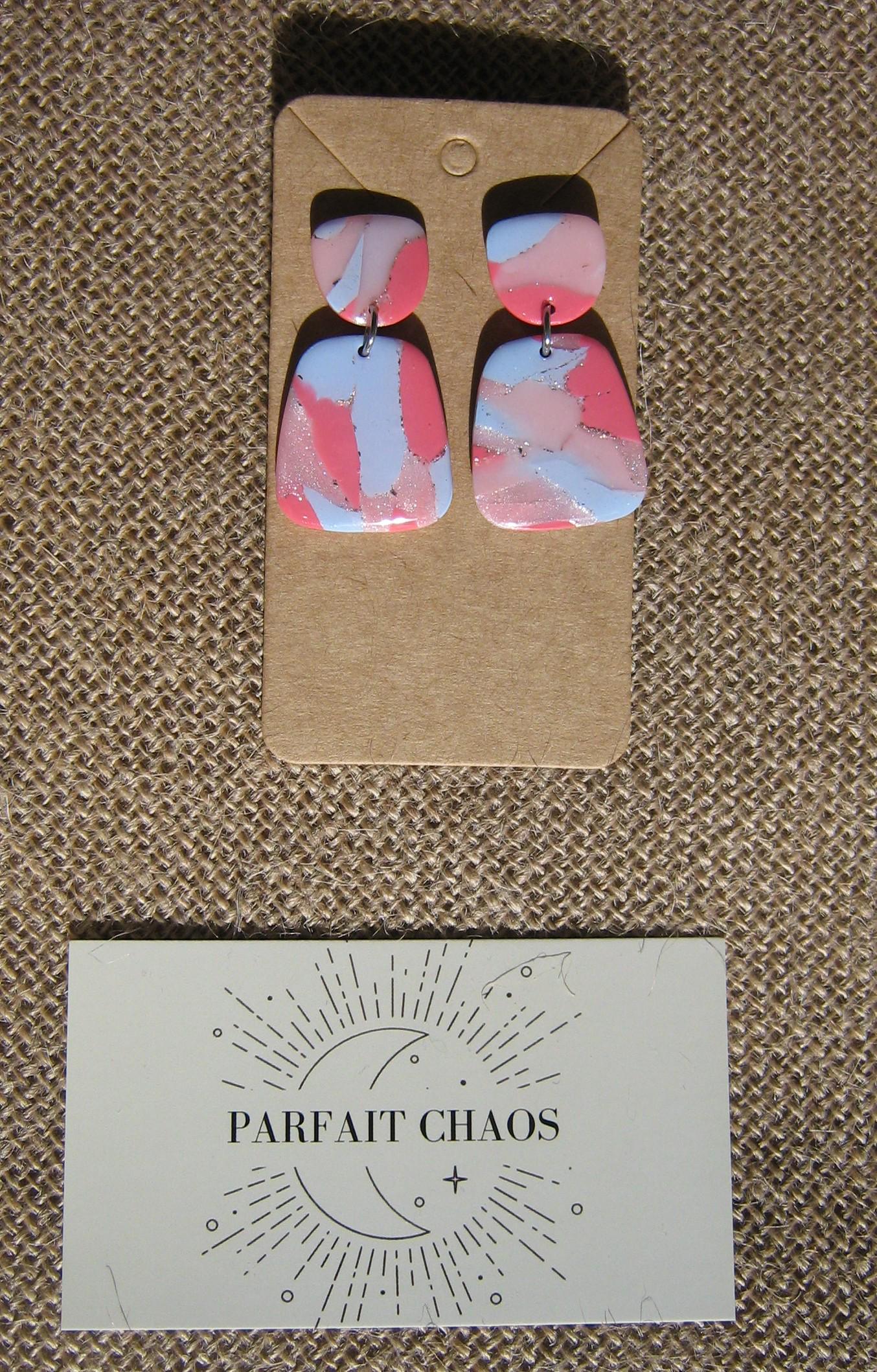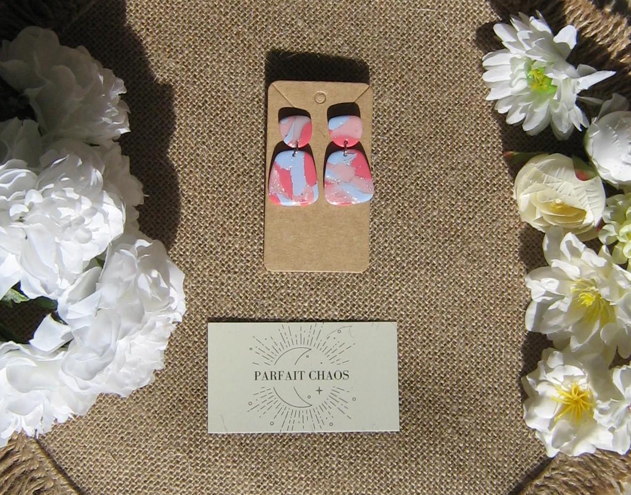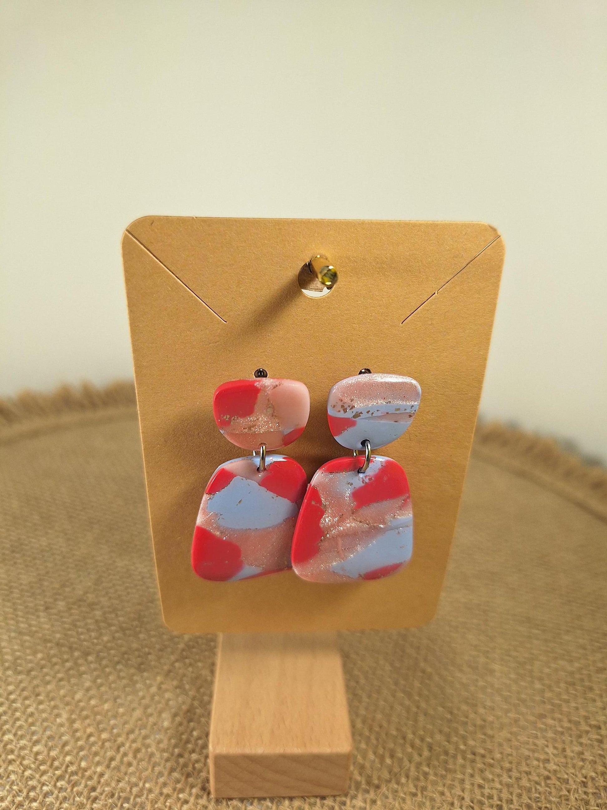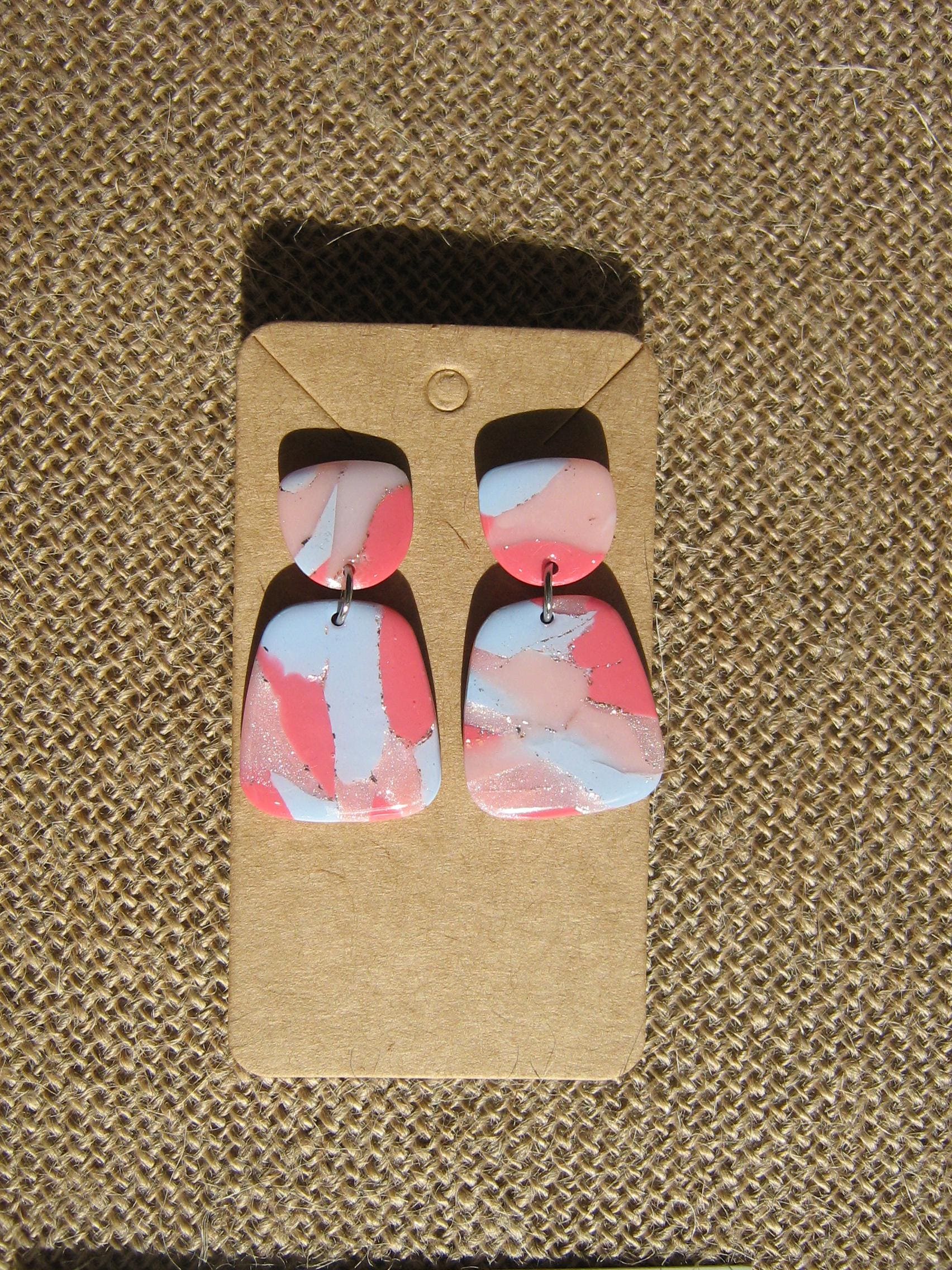 Les boucles d'oreilles sont réalisées en argile polymère, elles sont donc très légères. Elles sont recouvertes d'une fine couche de résine pour les protéger et révéler toutes leurs couleurs. Les tranches des bijoux sont vernies pour un fini soigné.