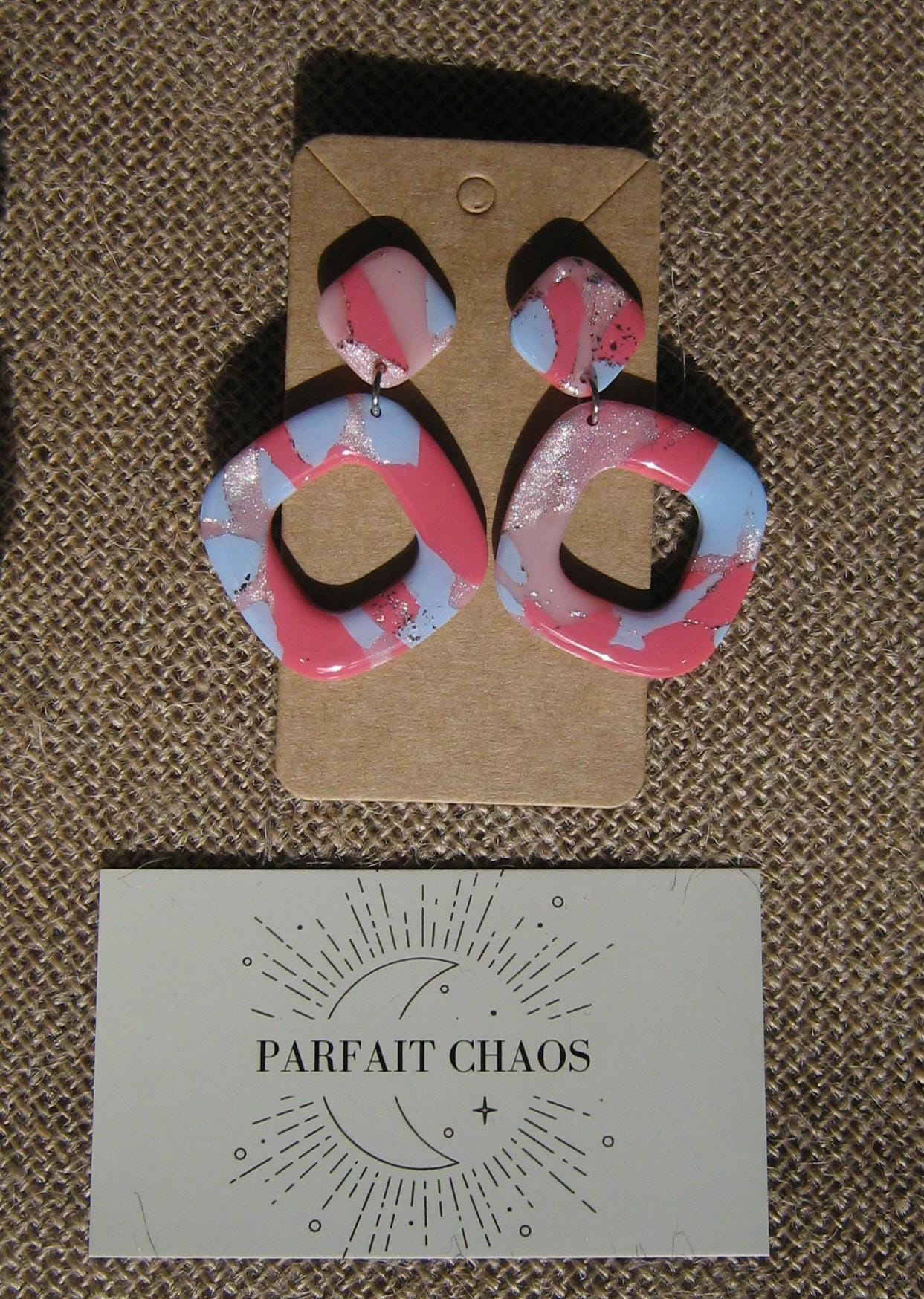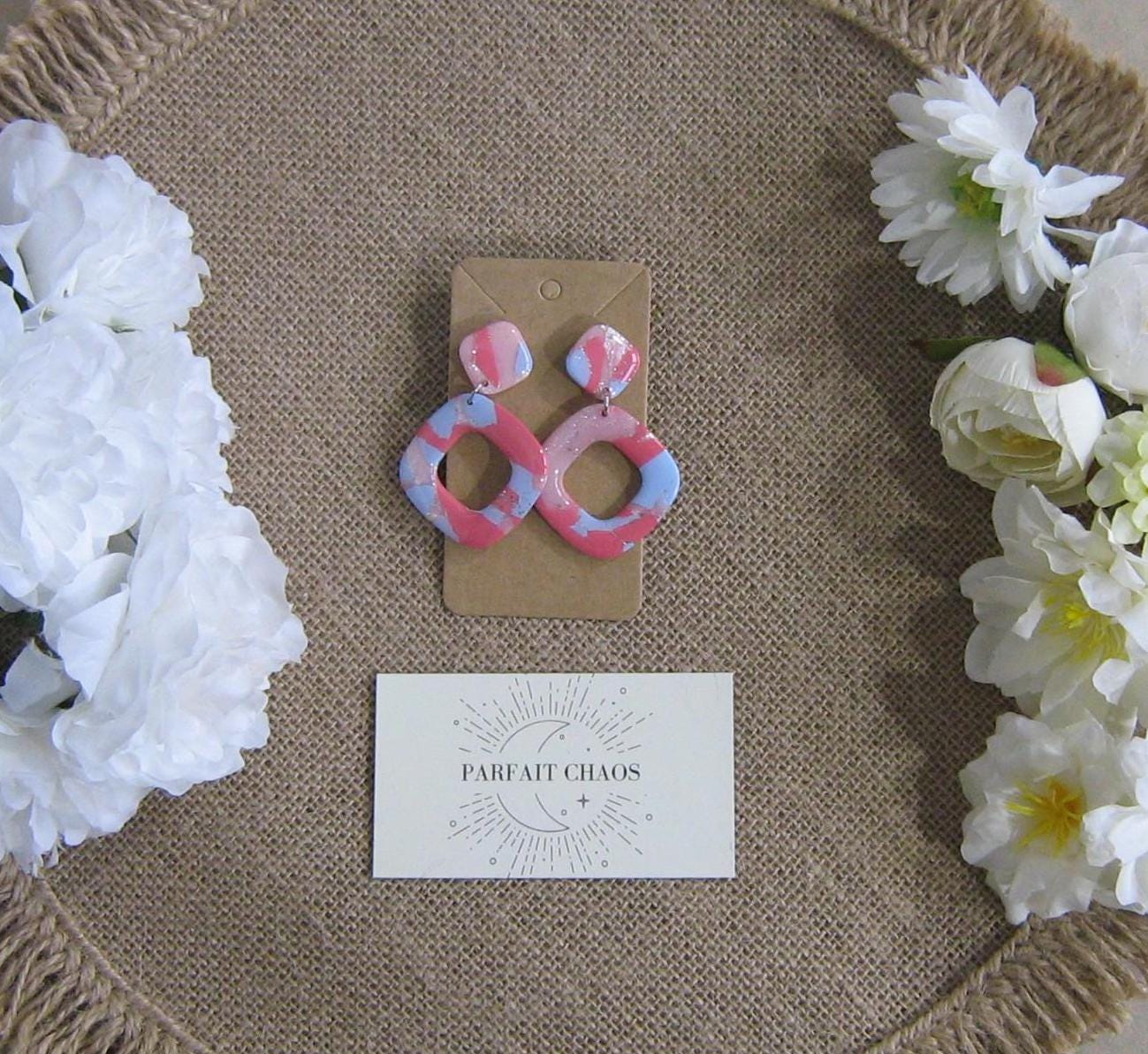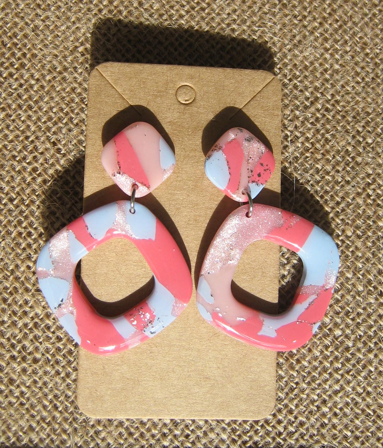 Les boucles d'oreilles sont réalisées en argile polymère, elles sont donc très légères. Elles sont recouvertes d'une fine couche de résine pour les protéger et révéler toutes leurs couleurs. Les tranches des bijoux sont vernies pour un fini soigné.