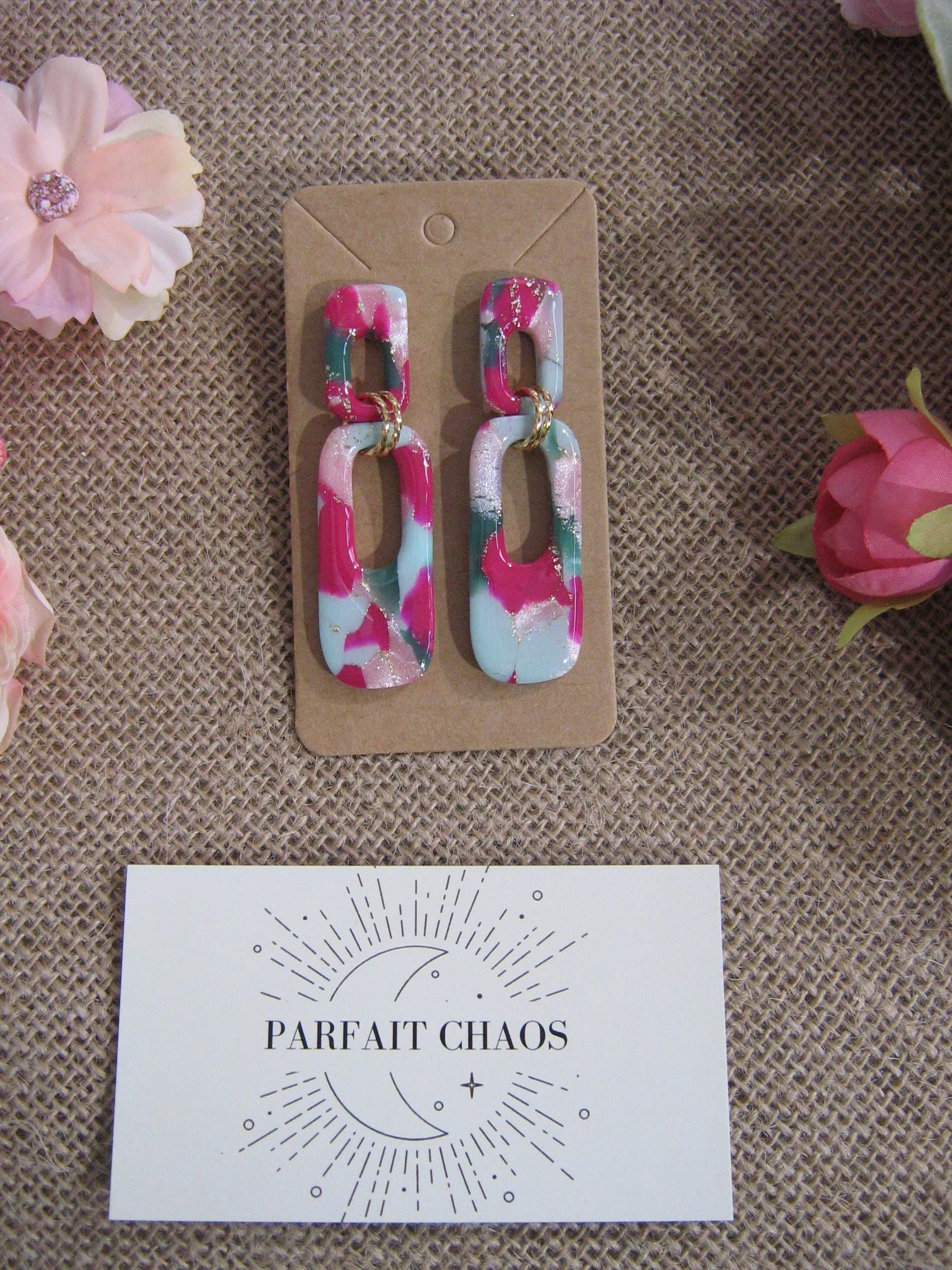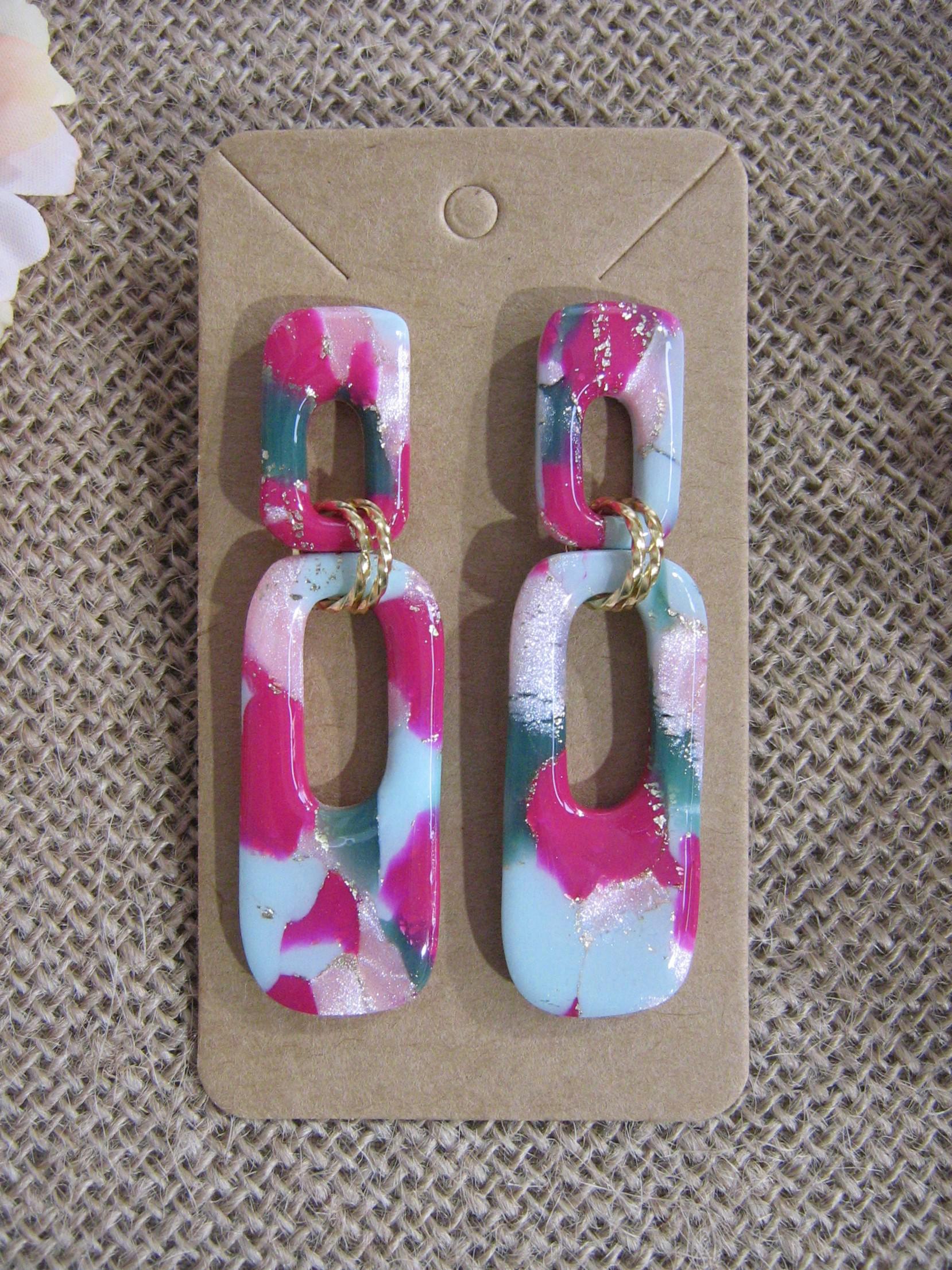 Les boucles d'oreilles sont réalisées en argile polymère, elles sont donc très légères. Elles sont recouvertes d'une fine couche de résine pour les protéger et révéler toutes leurs couleurs. Les tranches des bijoux sont vernis pour un fini soigné.