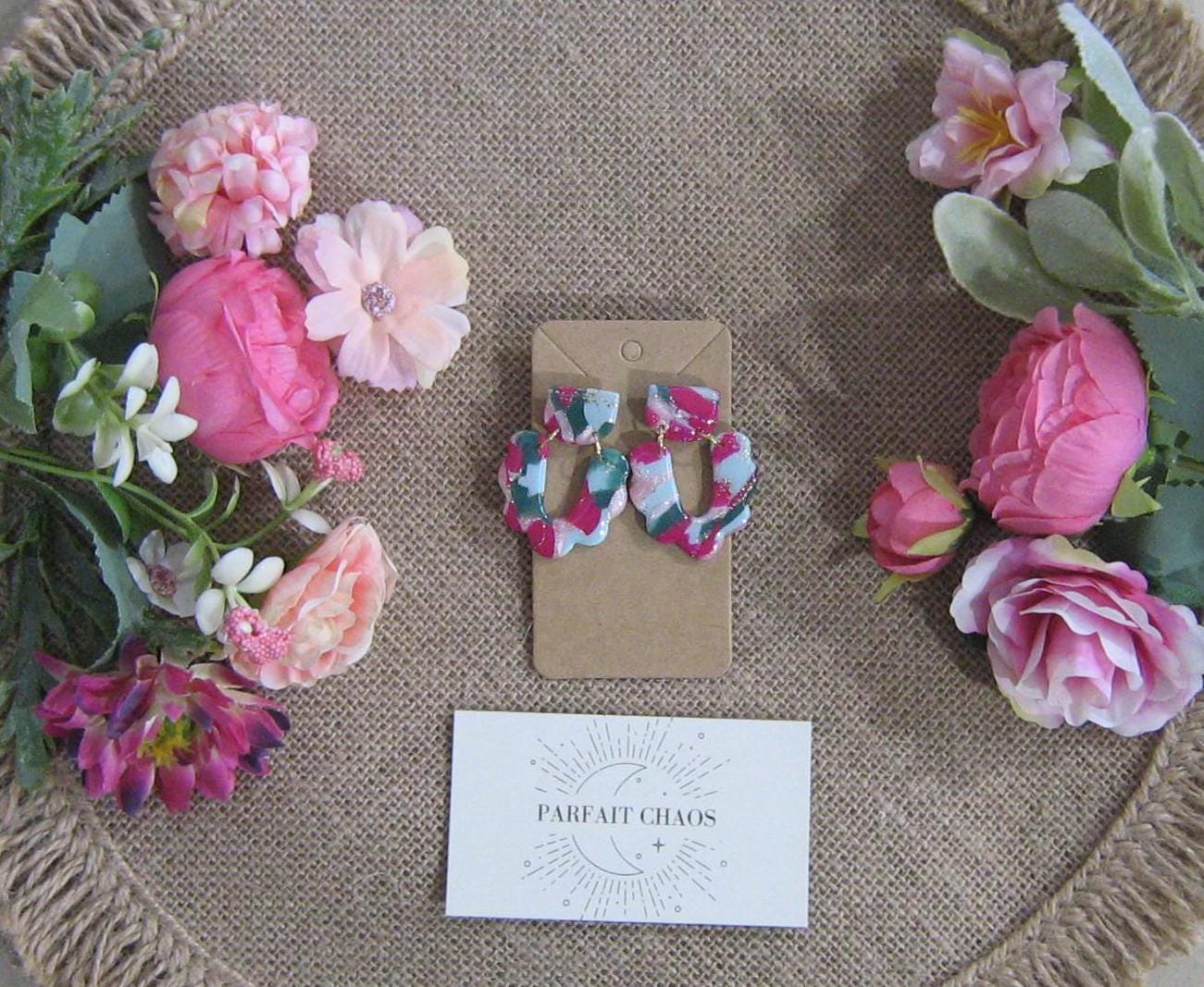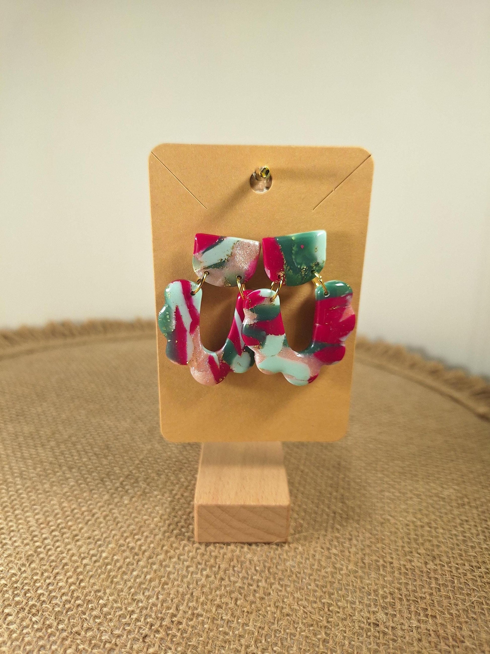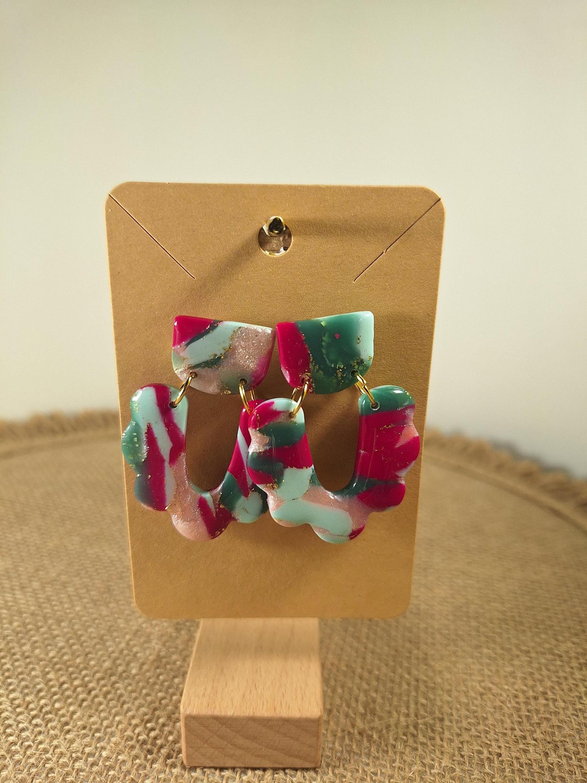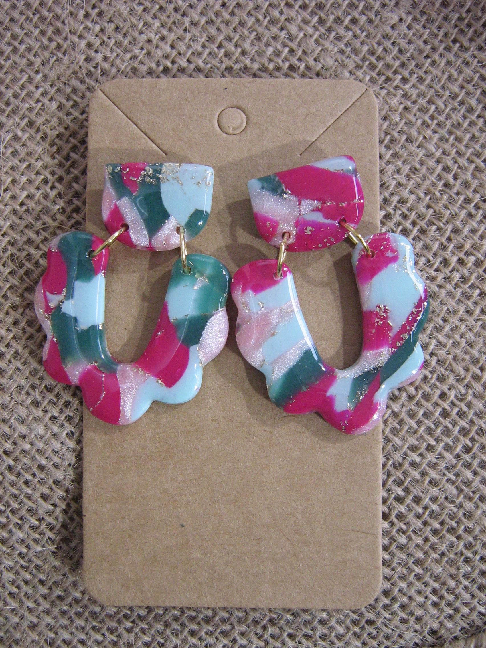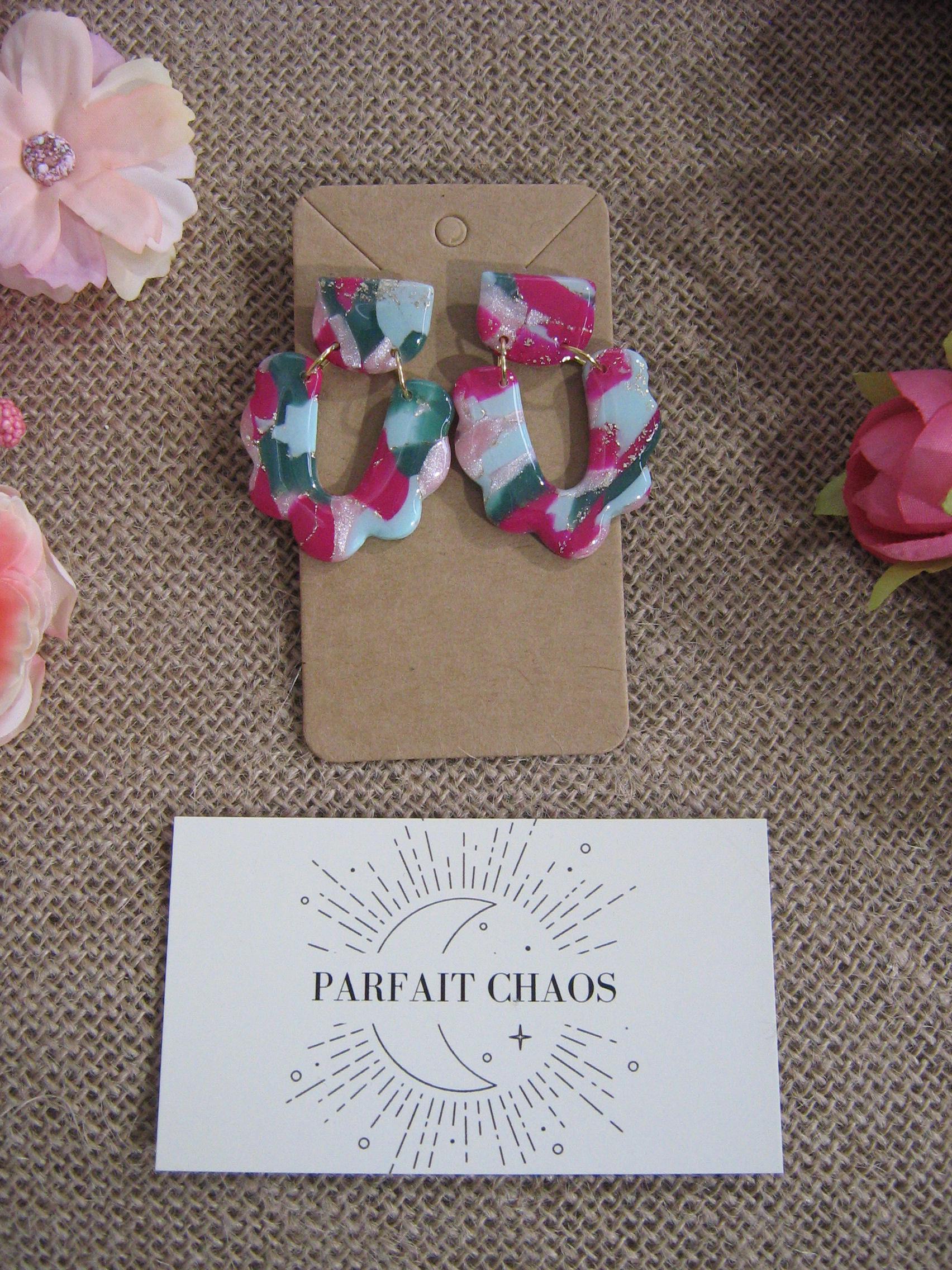 Les boucles d'oreilles sont réalisées en argile polymère, elles sont donc très légères. Elles sont recouvertes d'une fine couche de résine pour les protéger et révéler toutes leurs couleurs. Les tranches des bijoux sont vernies pour un fini soigné.