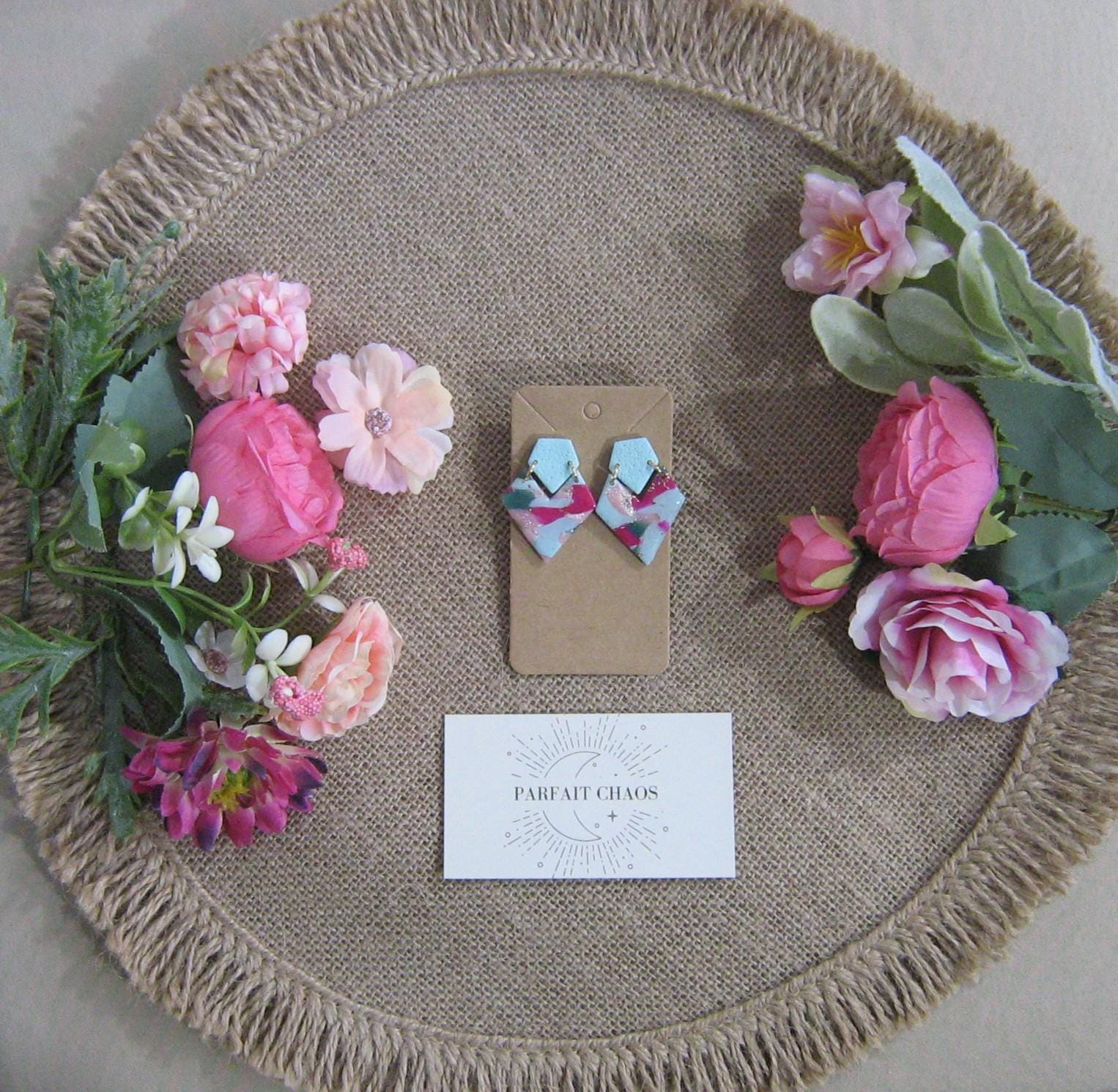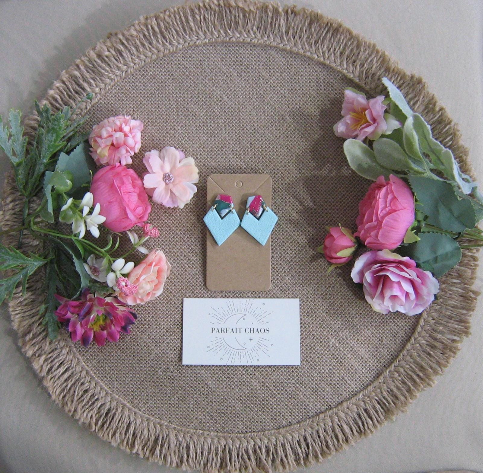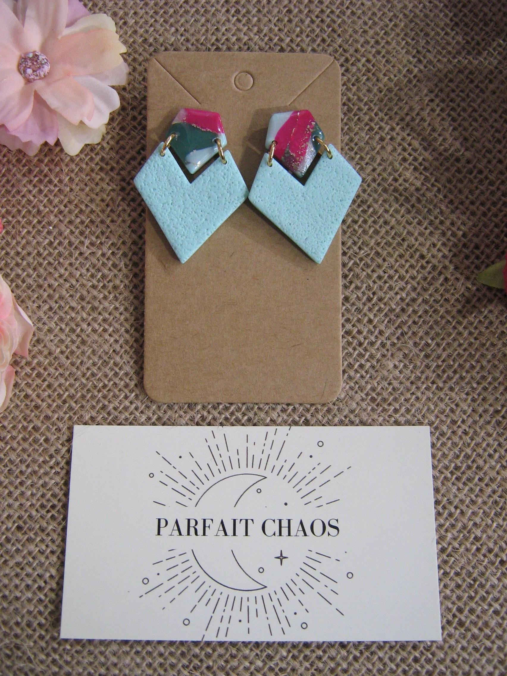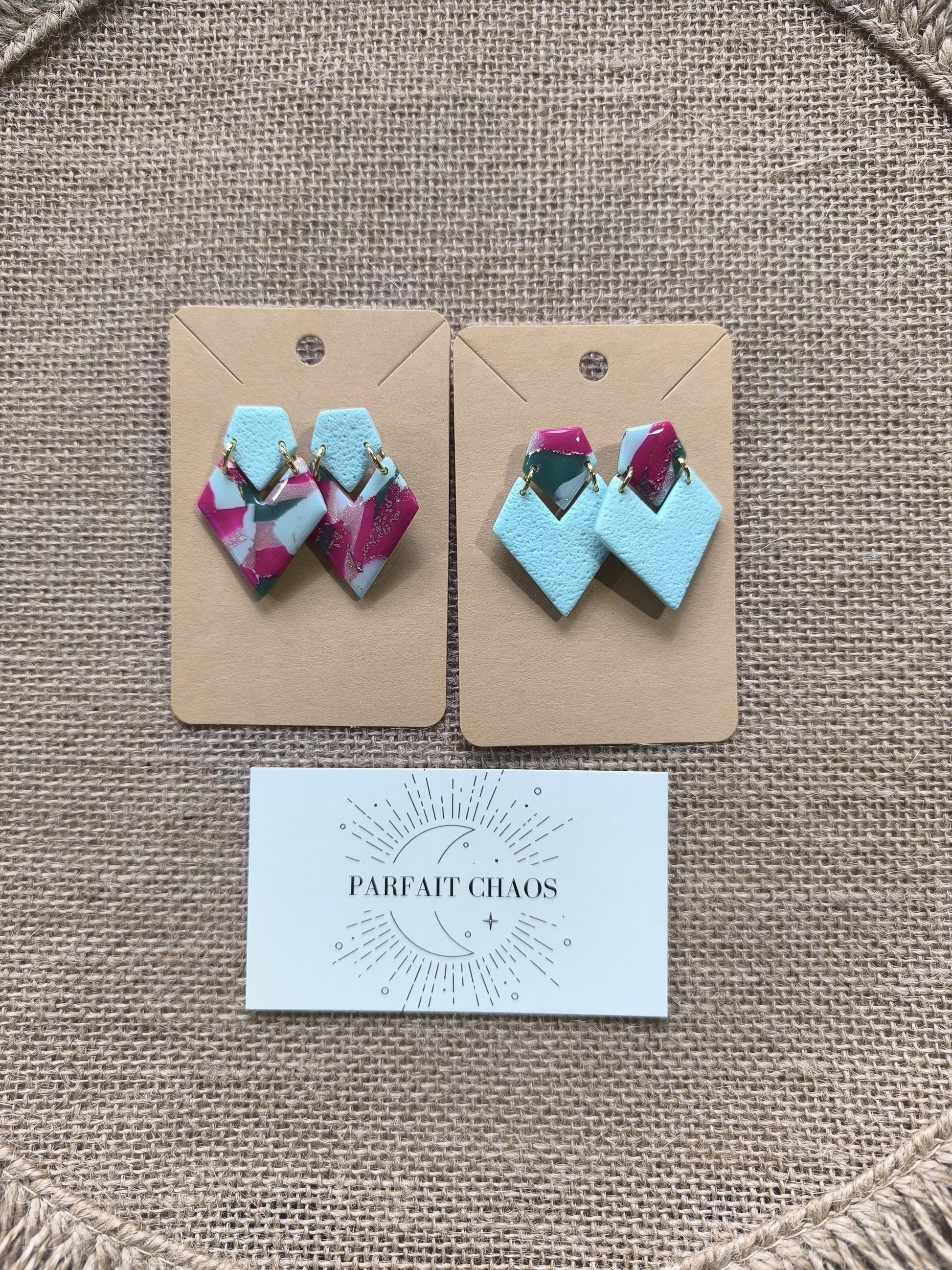Les boucles d'oreilles sont réalisées en argile polymère, elles sont donc très légères. Elles sont recouvertes d'une fine couche de résine pour les protéger et révéler toutes leurs couleurs. Les tranches des bijoux sont vernies pour un fini soigné.