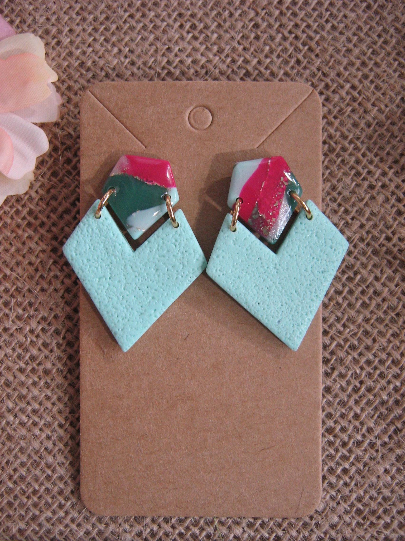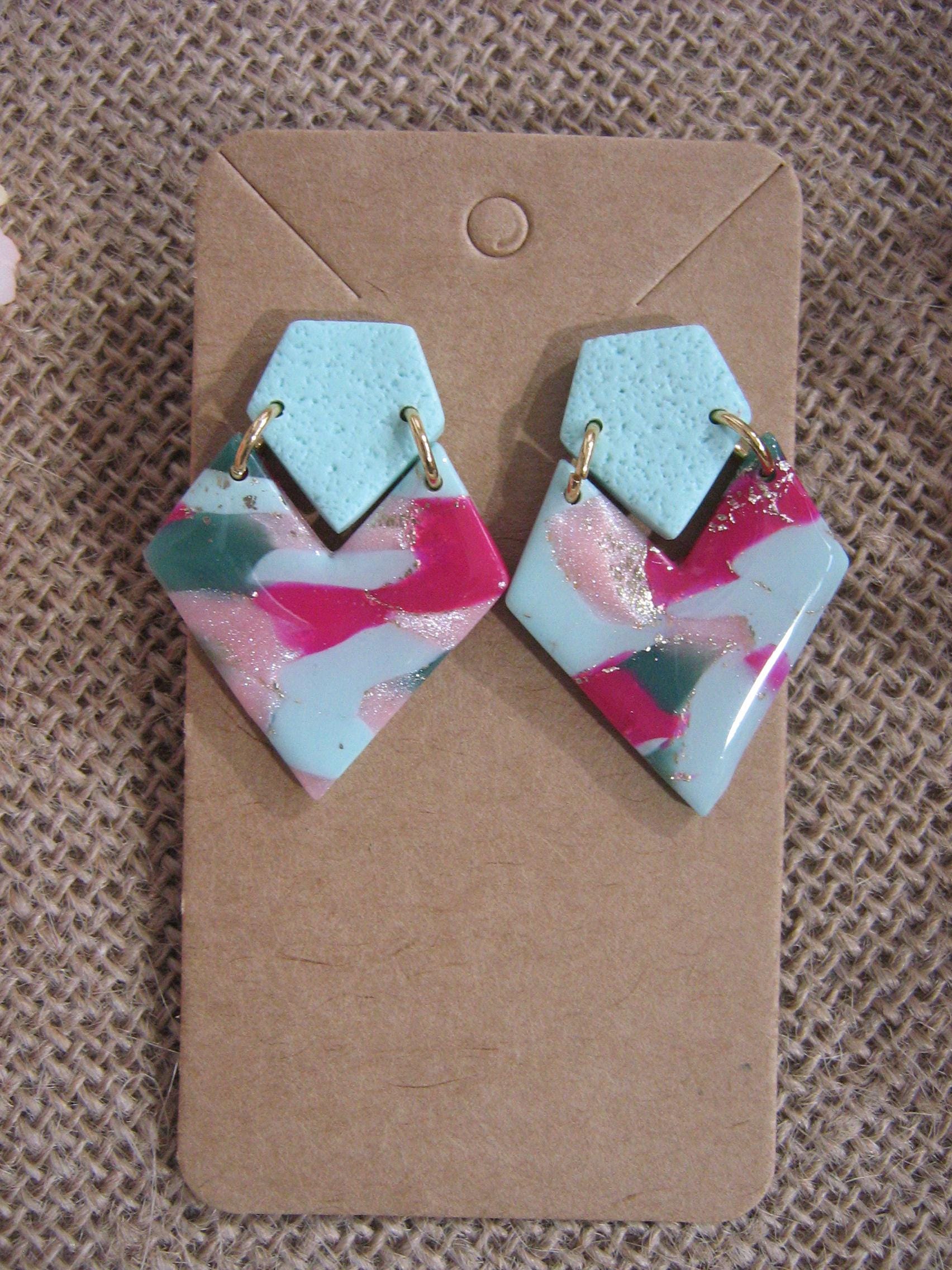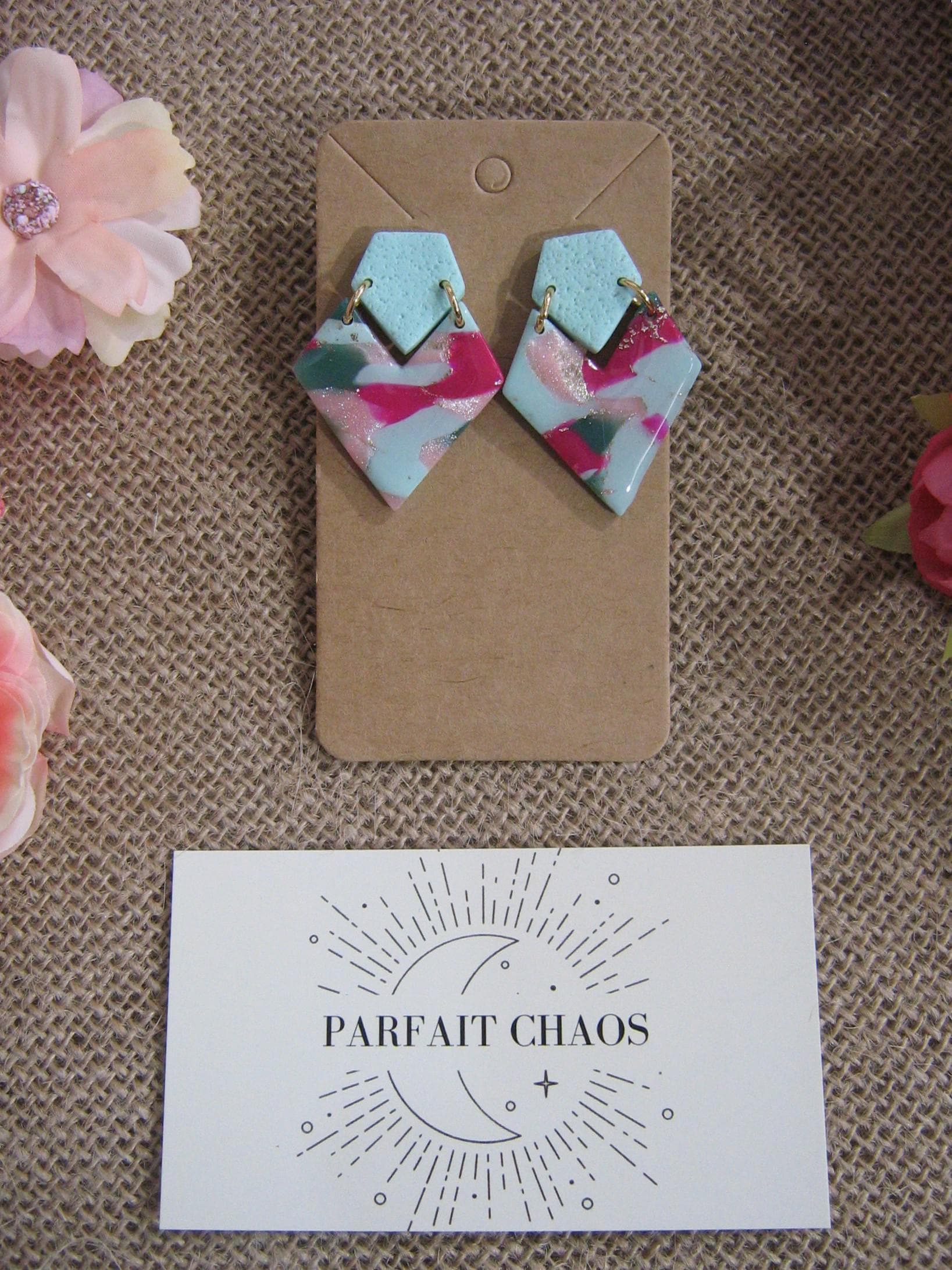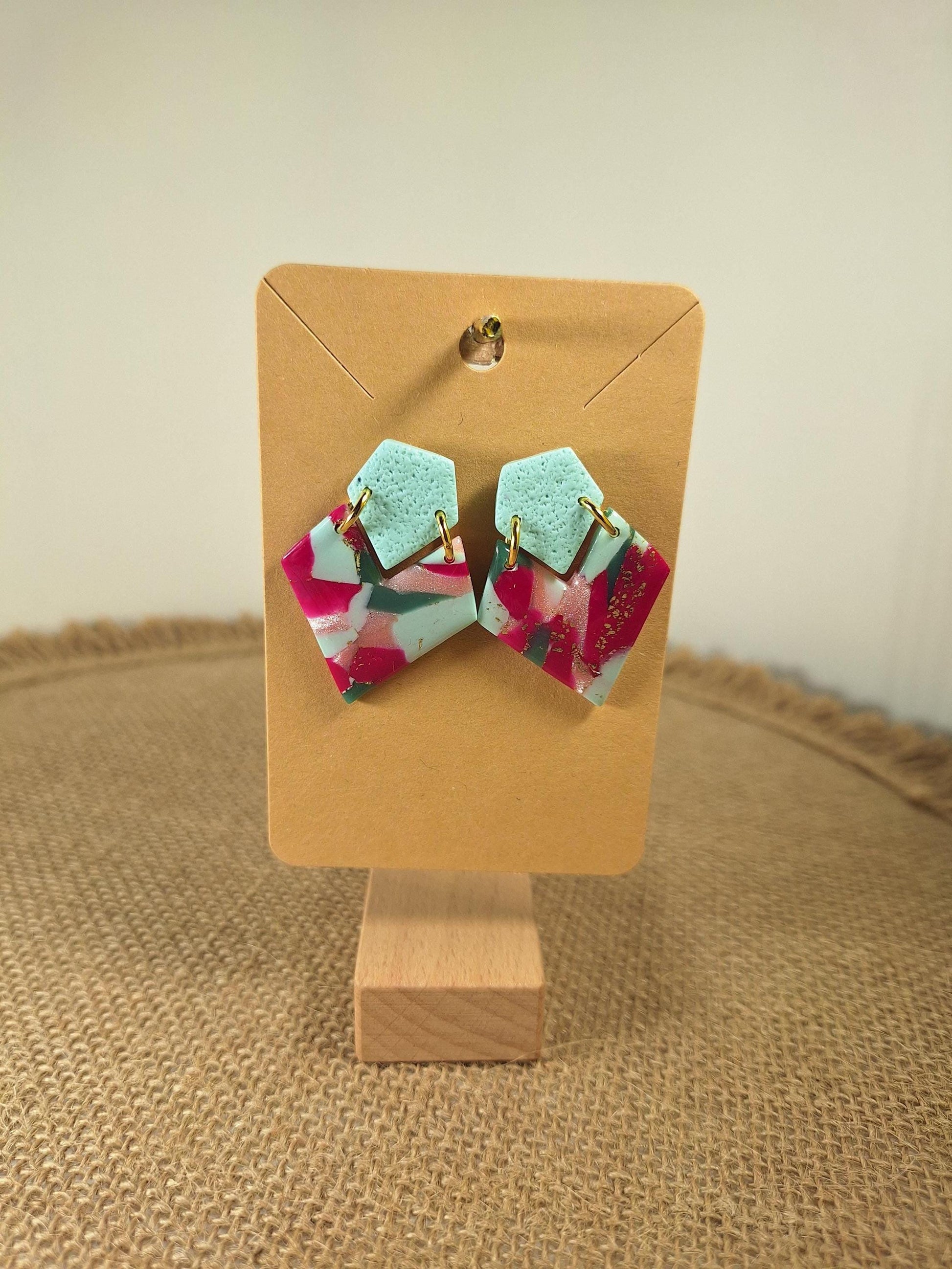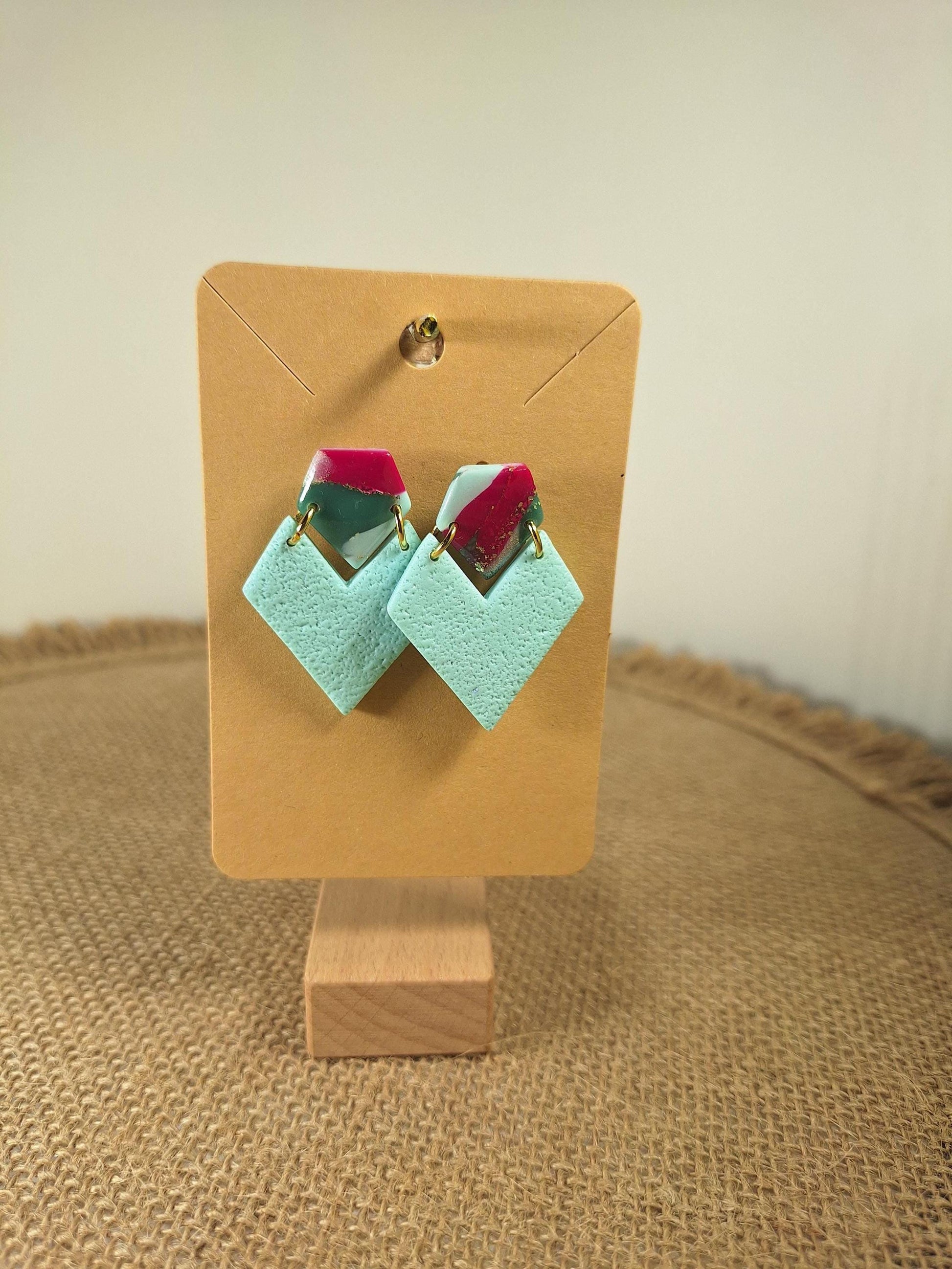 Les boucles d'oreilles sont réalisées en argile polymère, elles sont donc très légères. Elles sont recouvertes d'une fine couche de résine pour les protéger et révéler toutes leurs couleurs. Les tranches des bijoux sont vernies pour un fini soigné.