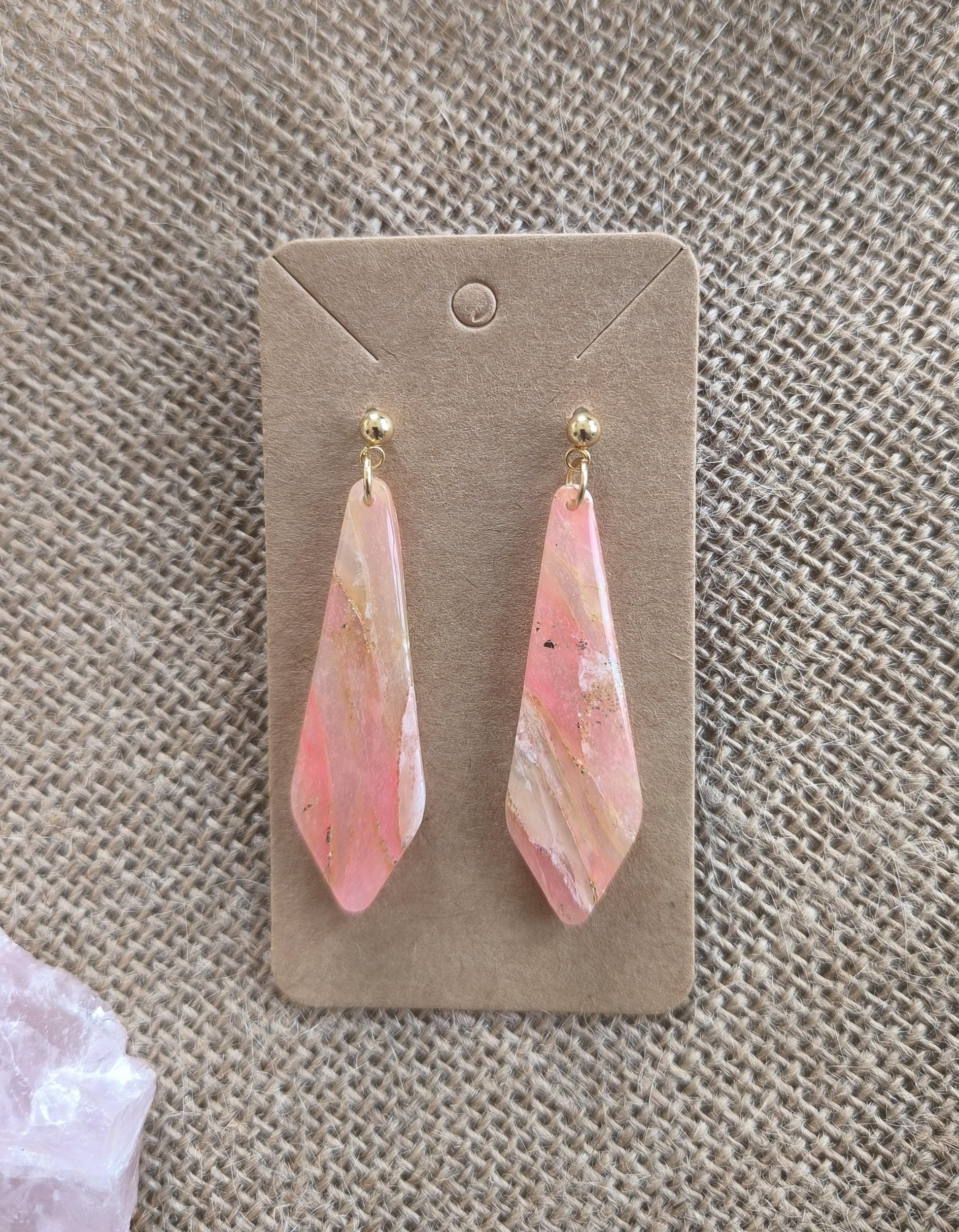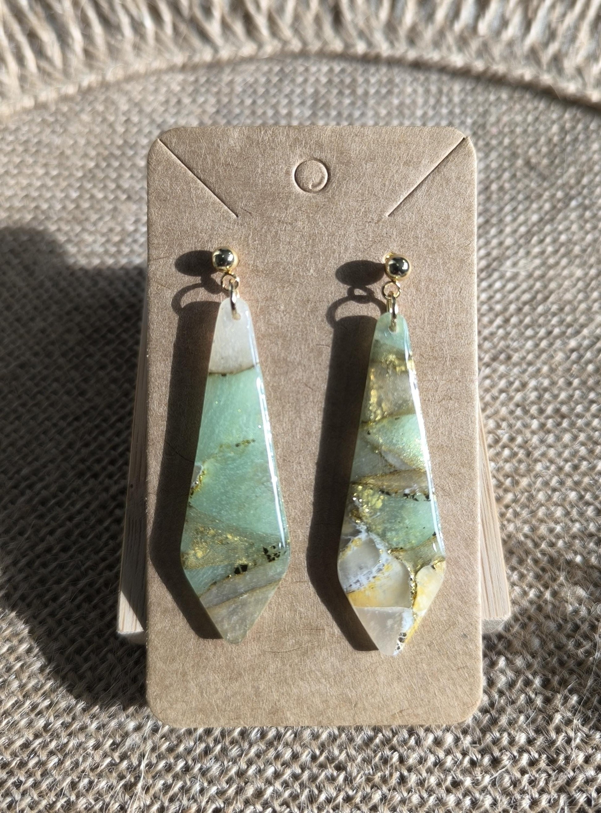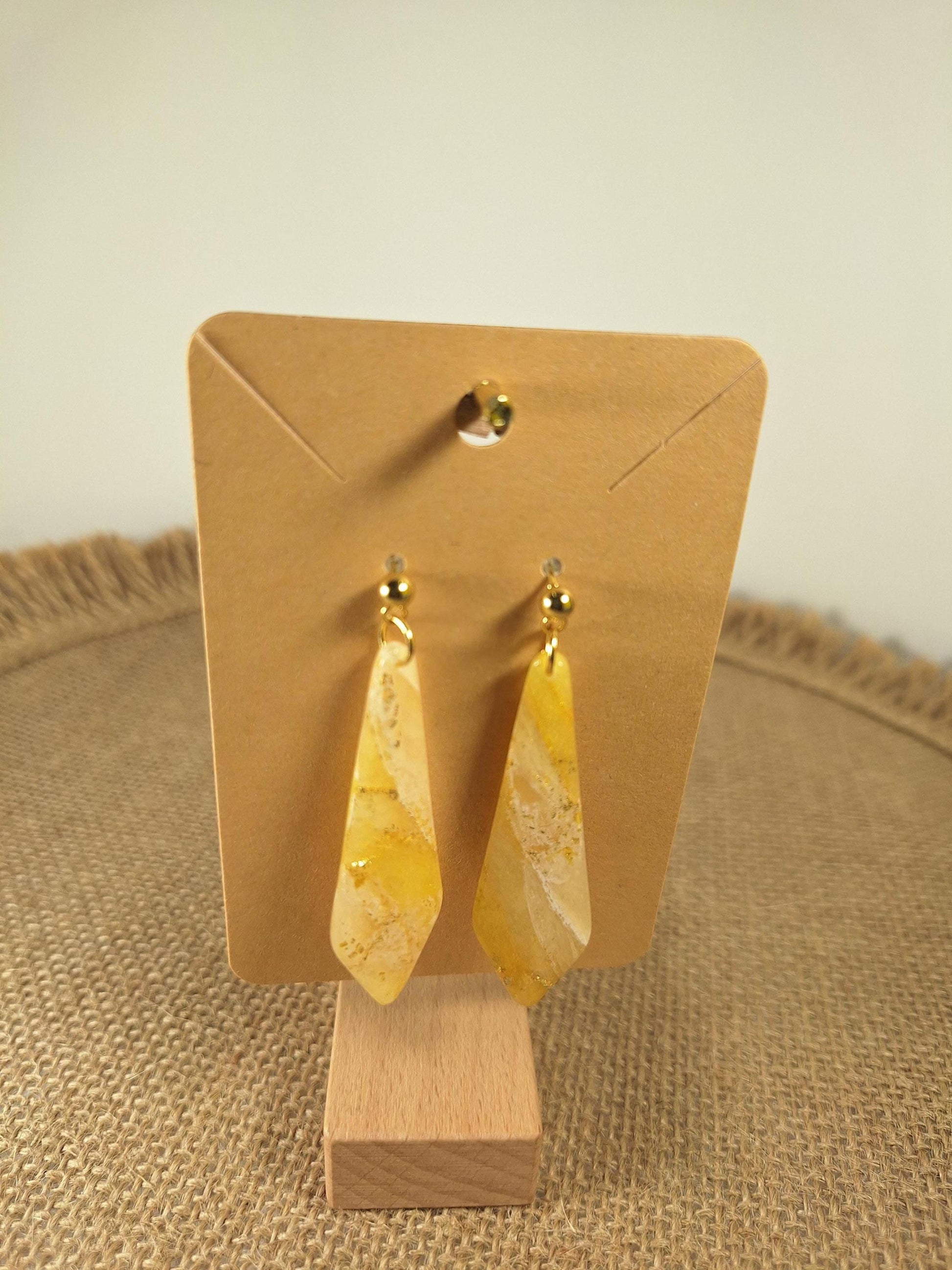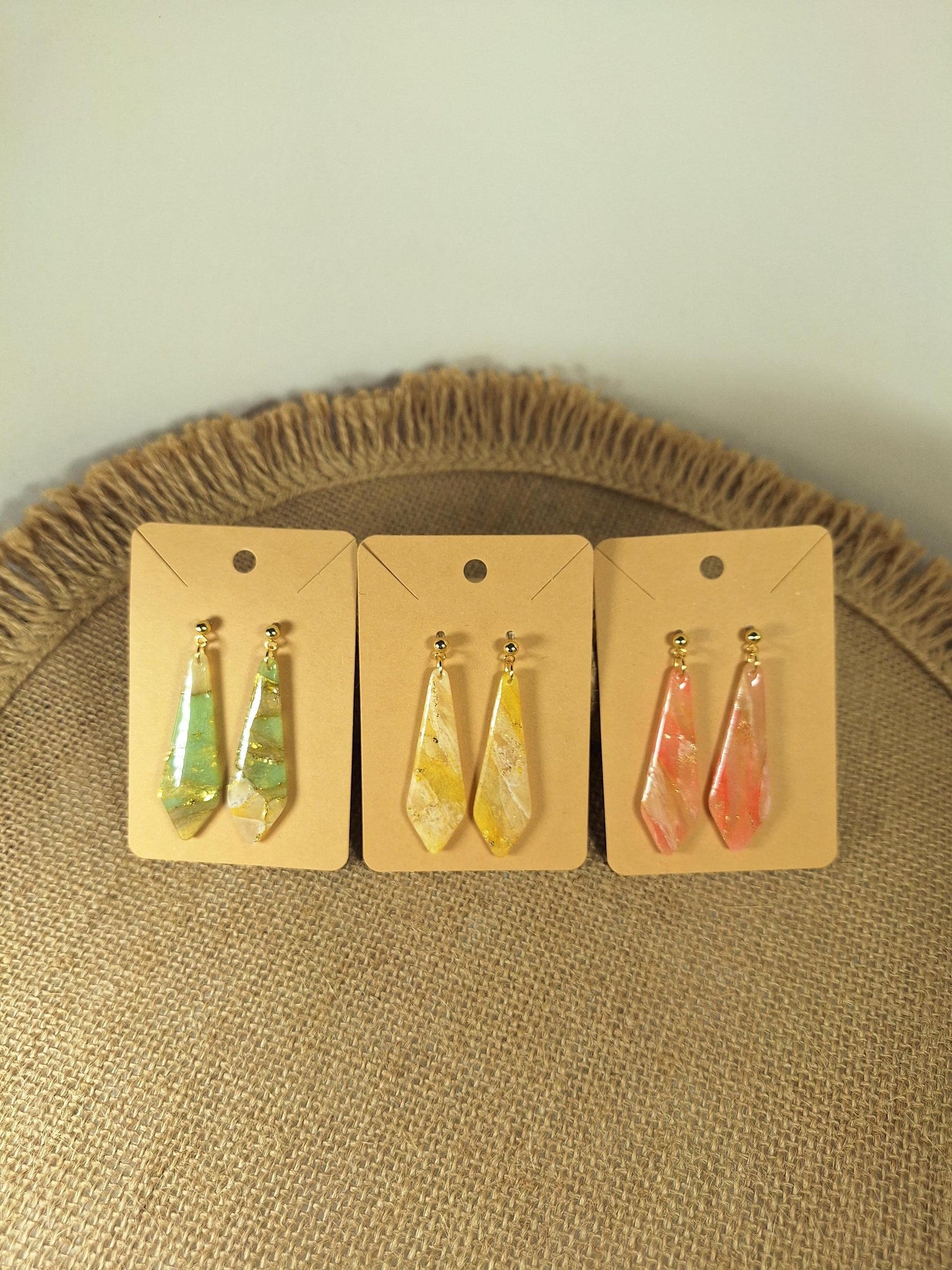 Les boucles d'oreilles sont réalisées en argile polymère, elles sont donc très légères. Elles sont recouvertes d'une fine couche de résine pour les protéger et révéler toutes leurs couleurs. Les tranches des bijoux sont vernies pour un fini soigné.