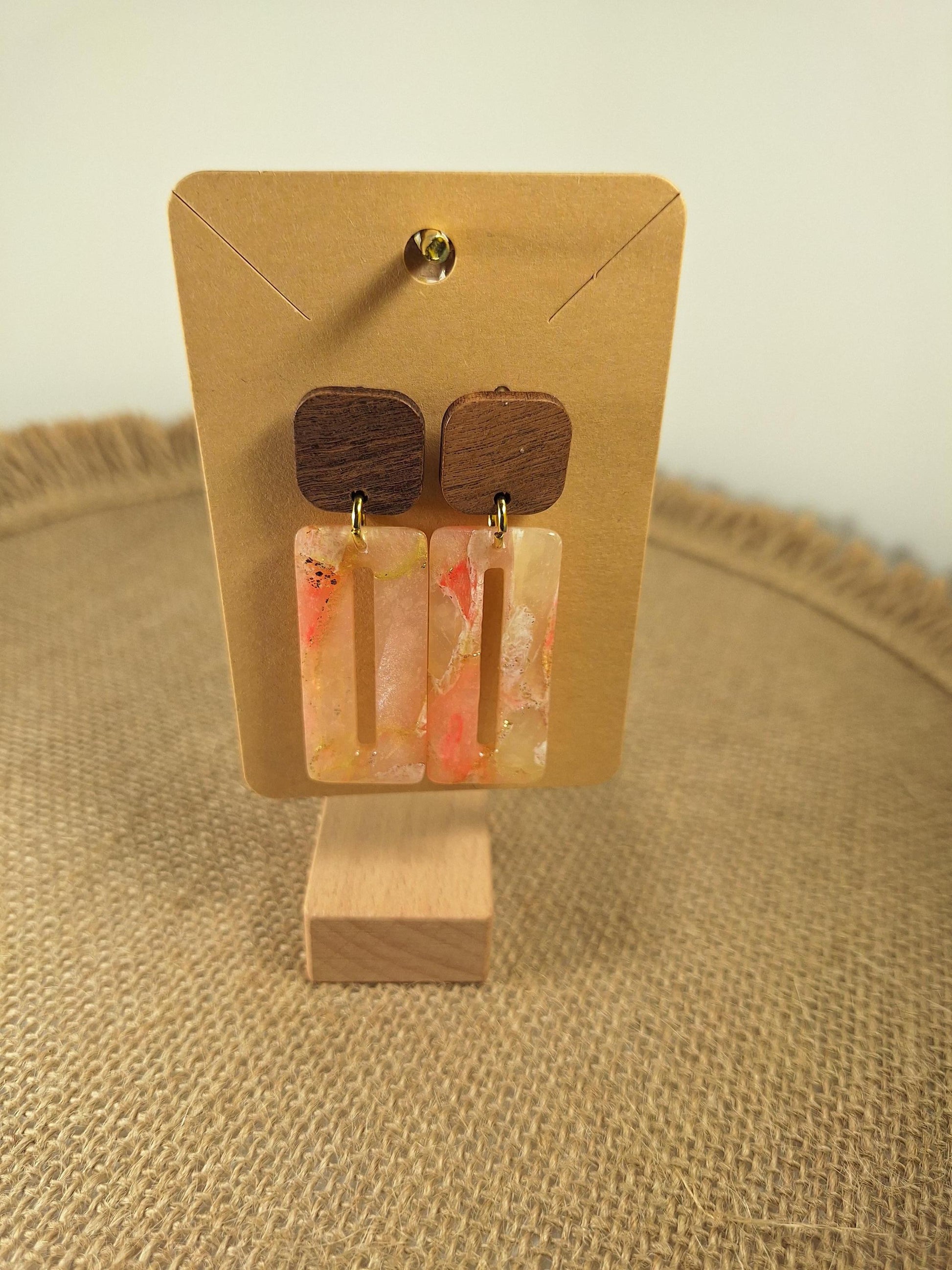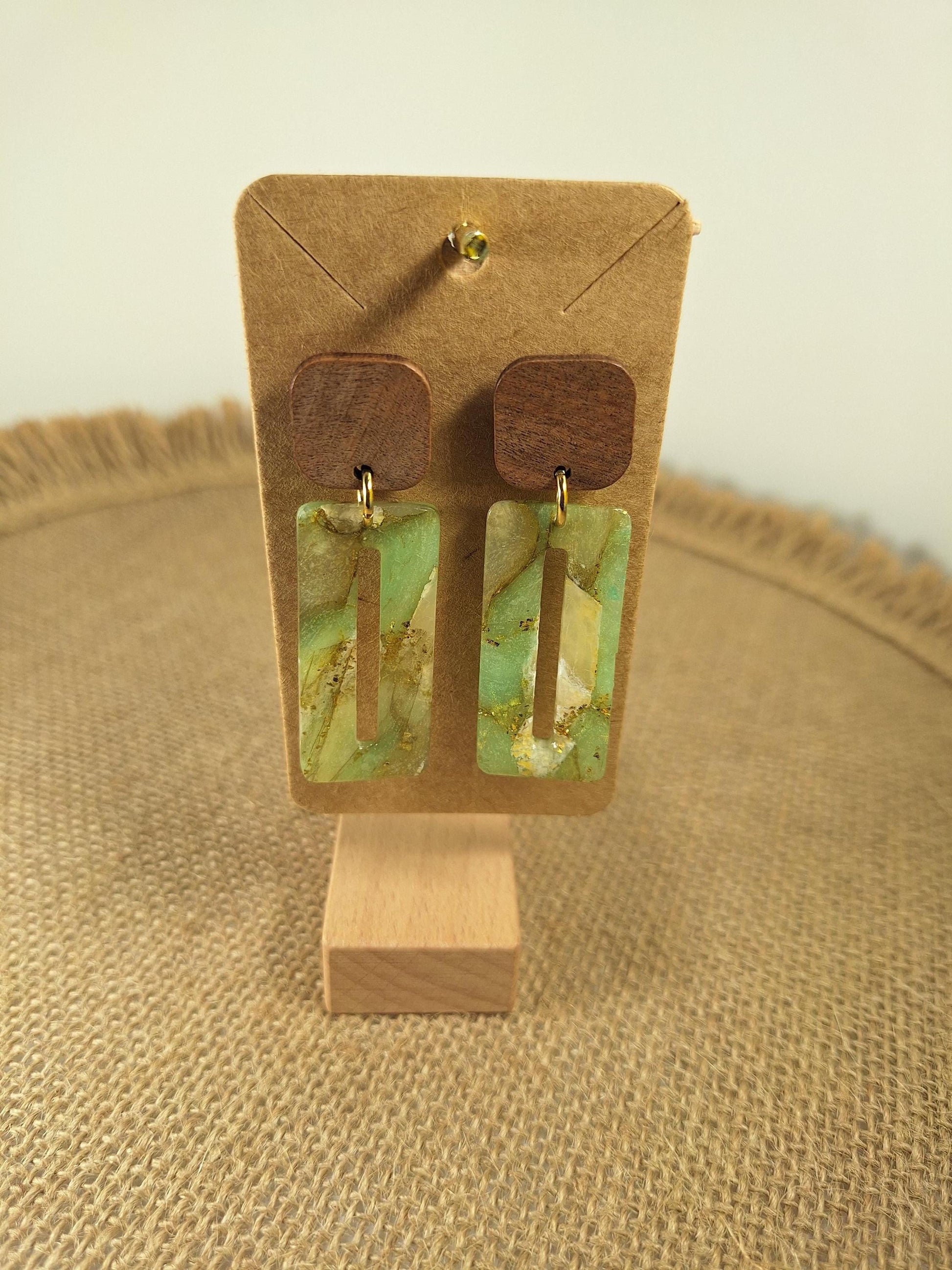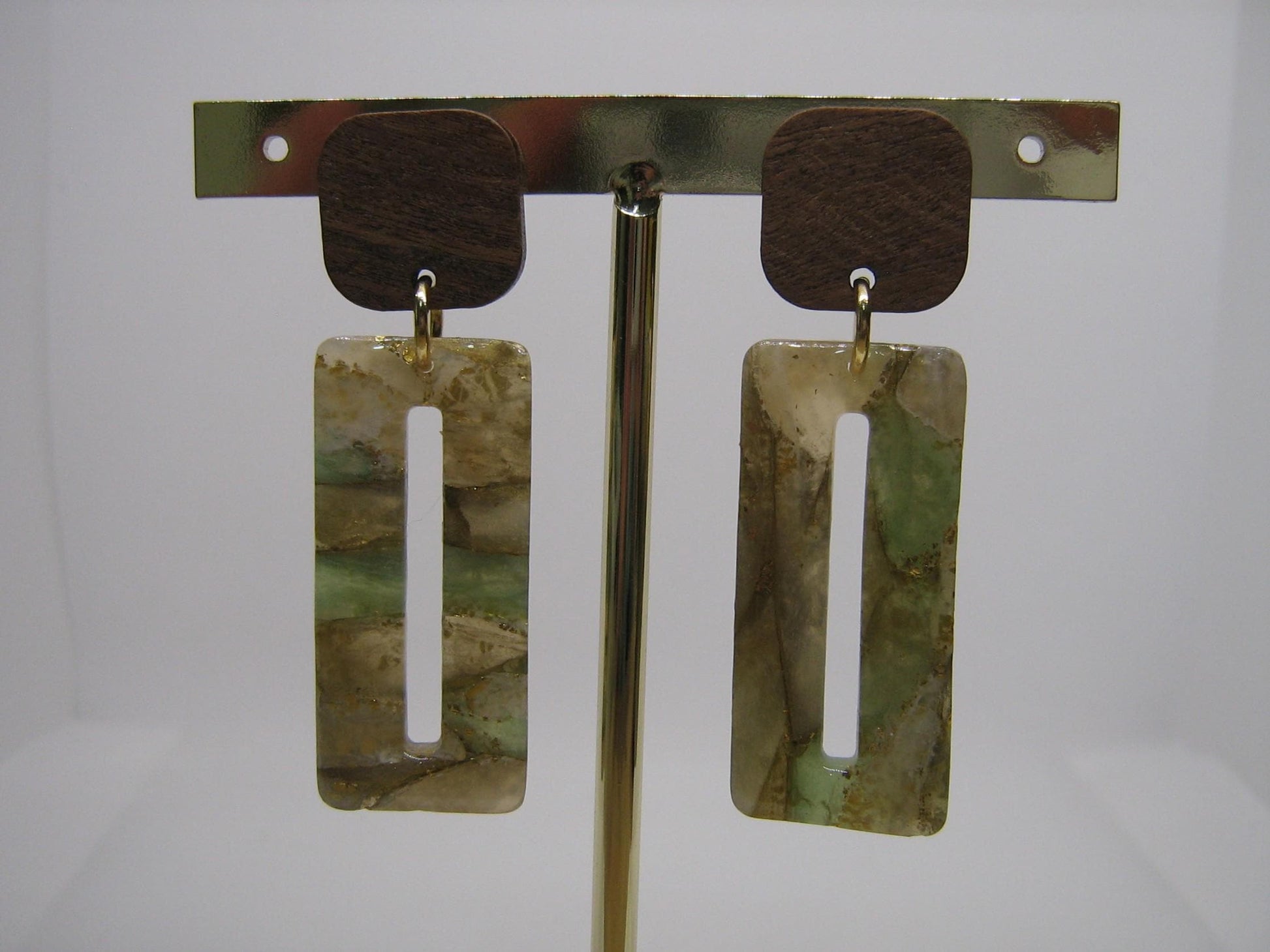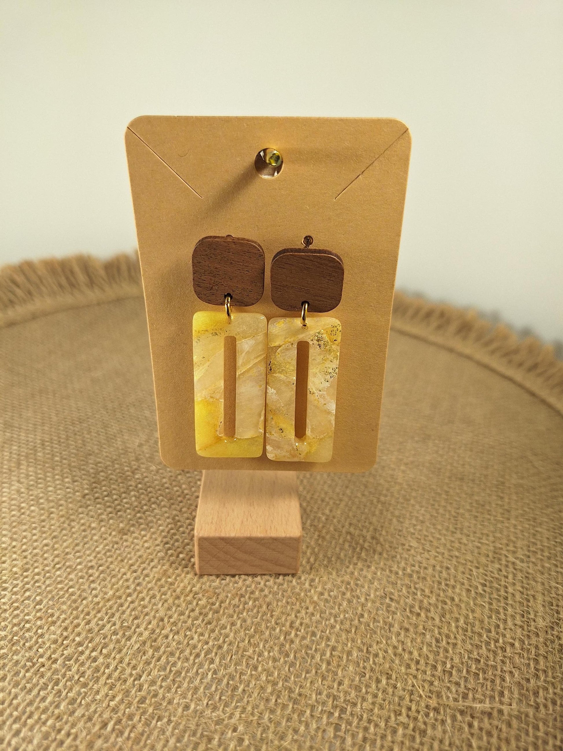 Tous nos bijoux sont assemblés avec des apprêts en acier inoxydable ou acier inoxydable plaqué or. Sur ce modèle le support est en bois avec une tige en acier inoxydable argenté. Les anneaux sont dorés.