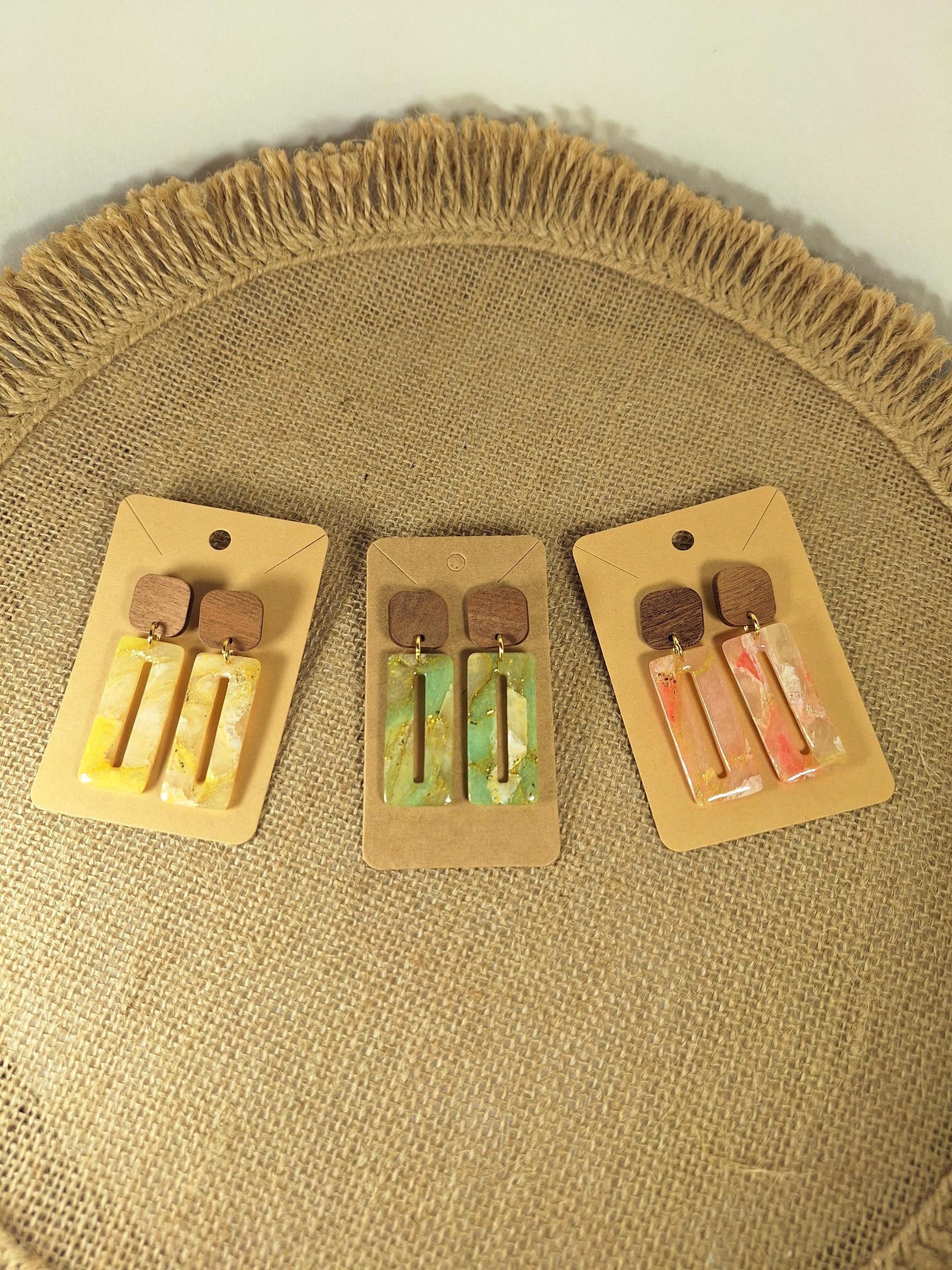 Les boucles d'oreilles sont réalisées en argile polymère, elles sont donc très légères. Elles sont recouvertes d'une fine couche de résine pour les protéger et révéler toutes leurs couleurs. Les tranches des bijoux sont vernies pour un fini soigné.