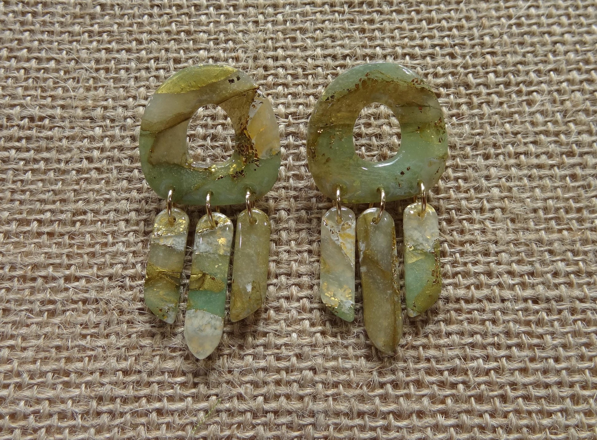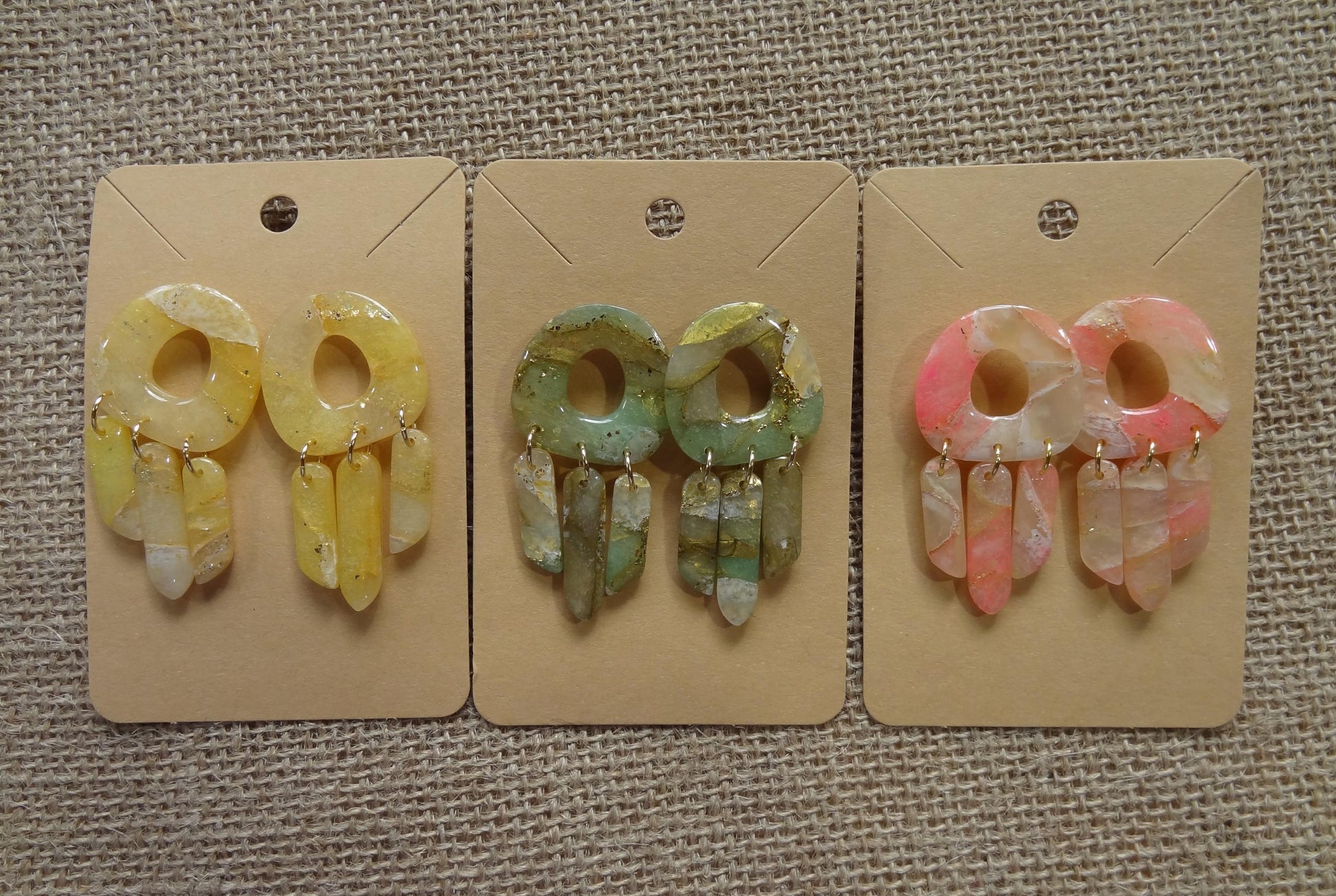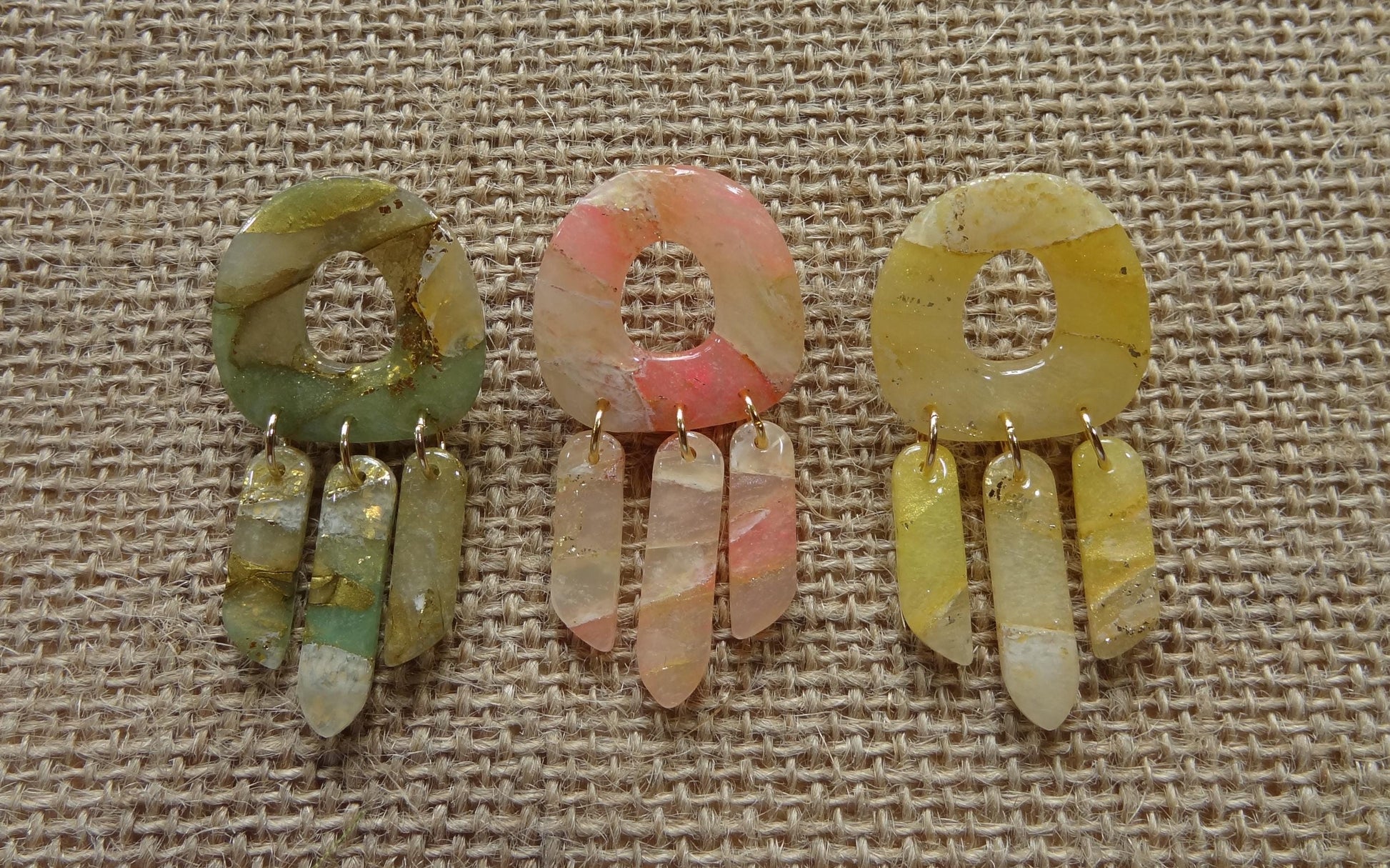 Les boucles d'oreilles sont réalisées en argile polymère, elles sont donc très légères. Elles sont recouvertes d'une fine couche de résine pour les protéger et révéler toutes leurs couleurs. Les tranches des bijoux sont vernies pour un fini soigné.