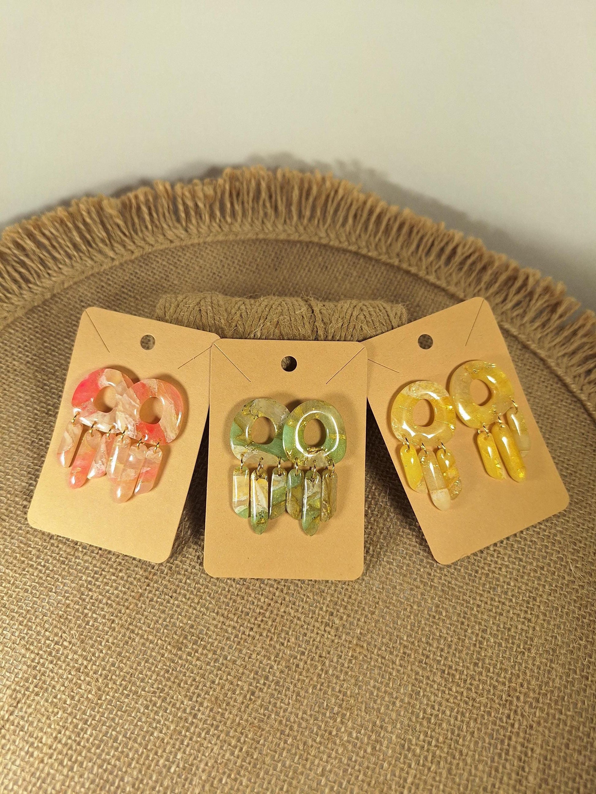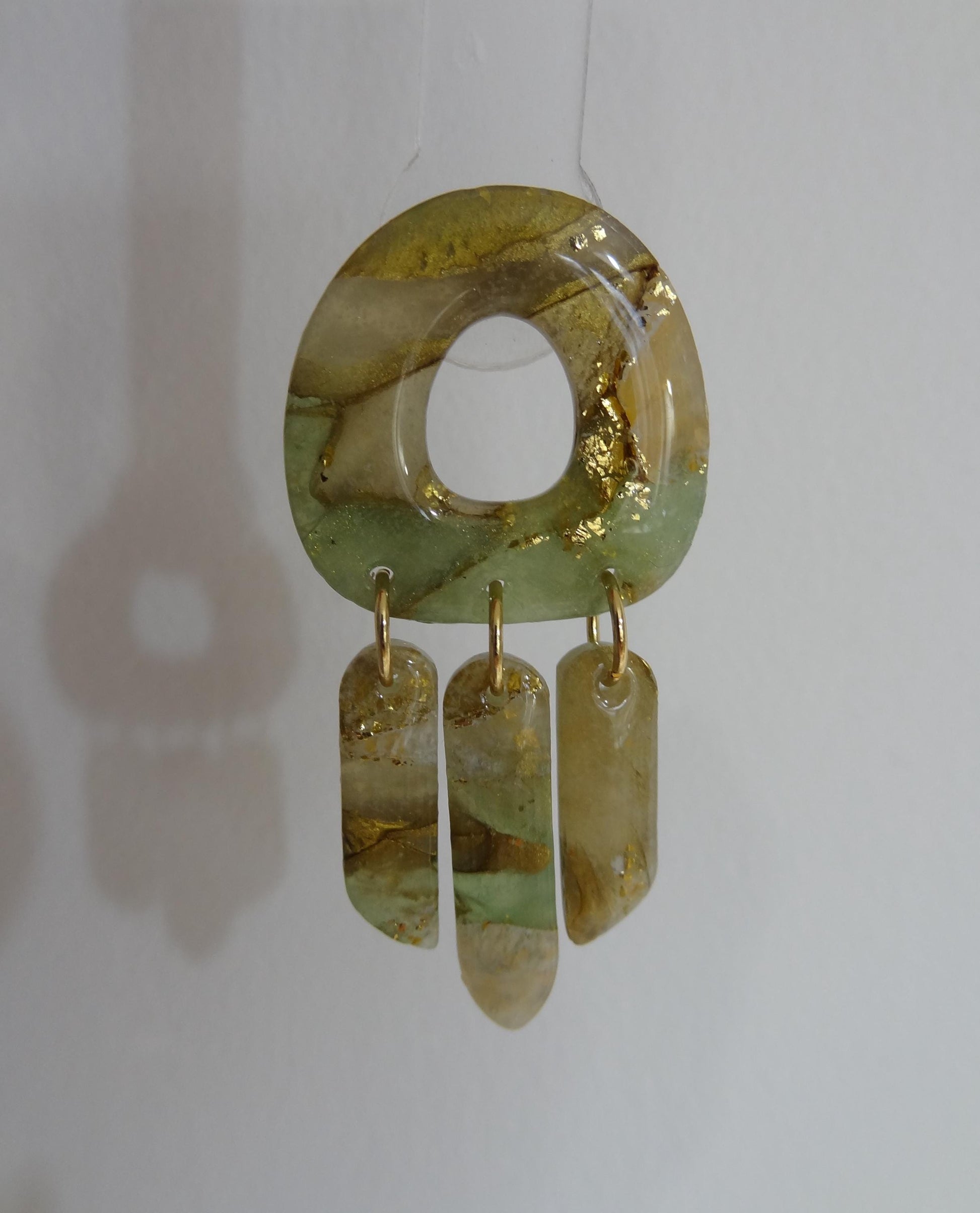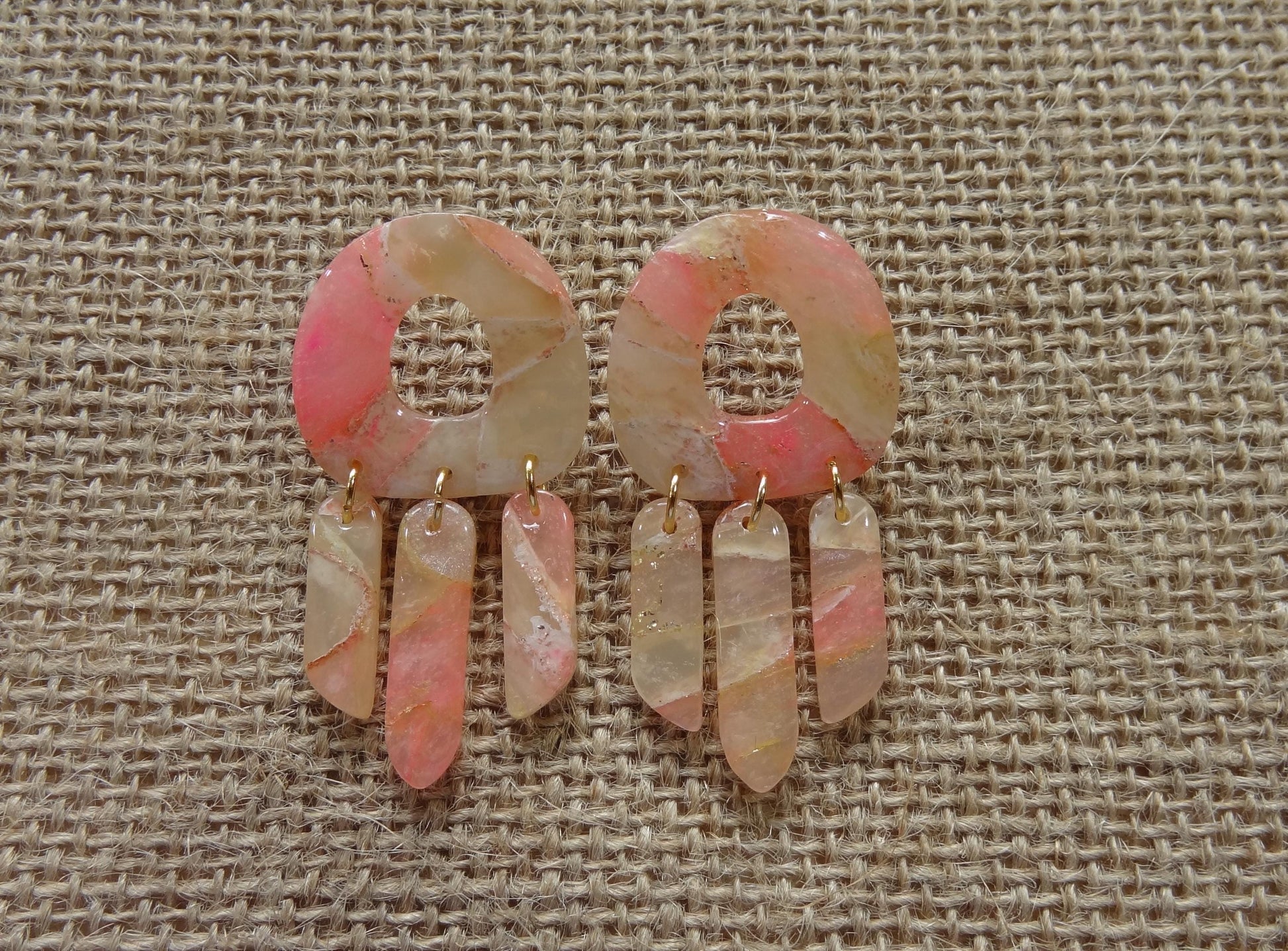 Les boucles d'oreilles sont réalisées en argile polymère, elles sont donc très légères. Elles sont recouvertes d'une fine couche de résine pour les protéger et révéler toutes leurs couleurs. Les tranches des bijoux sont vernies pour un fini soigné.