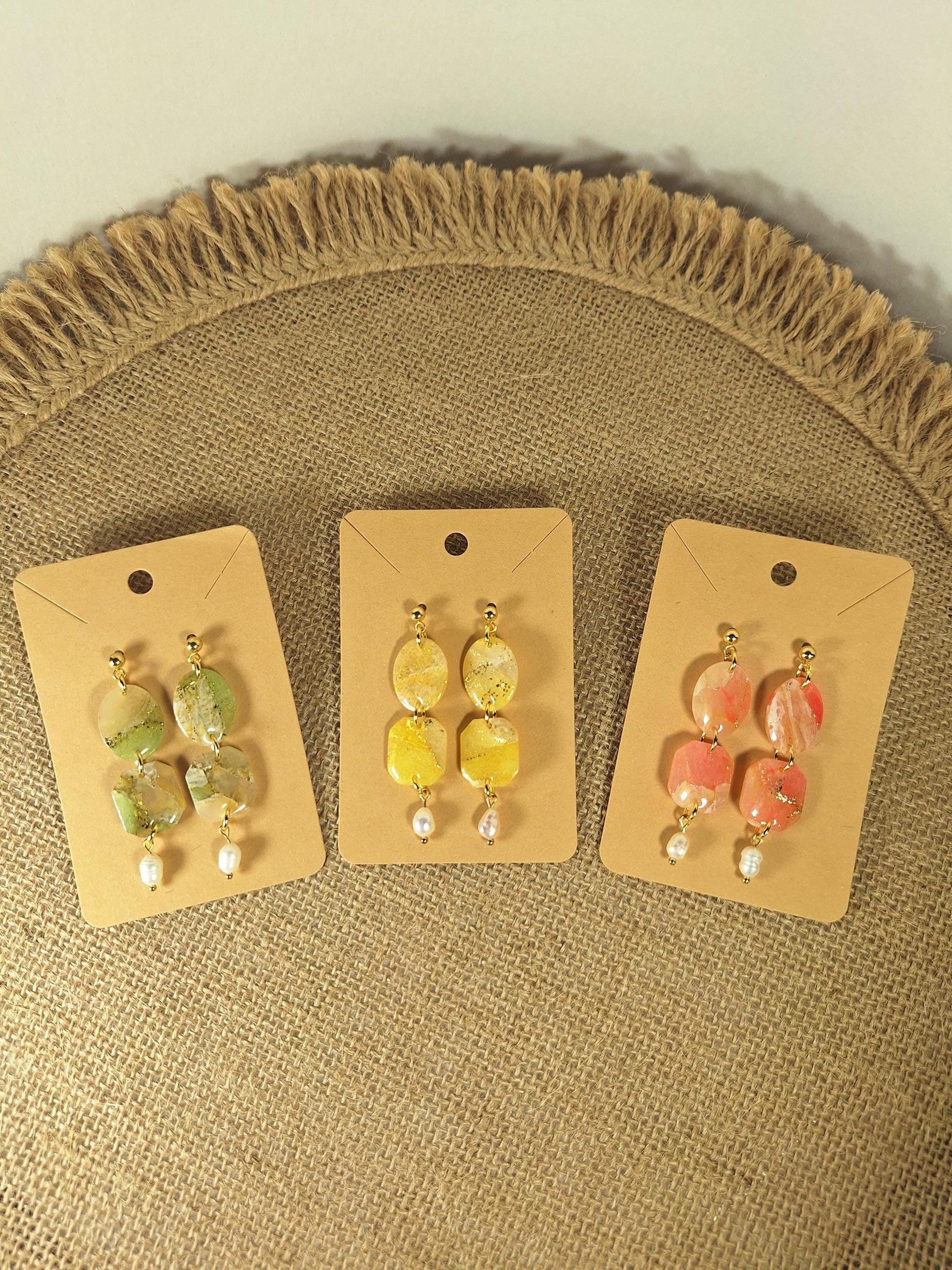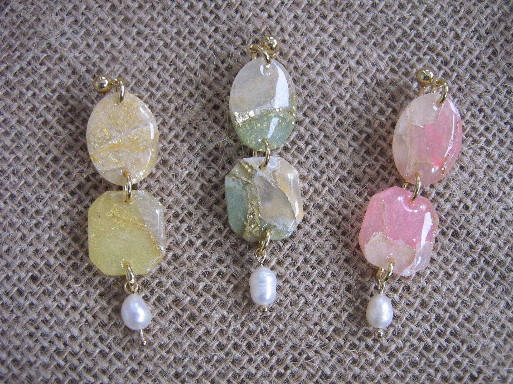 Dans la collection Pierres de Renaissance, découvrez le modèle Olga dans ses trois couleurs printanières: rose, vert et jaune. Ces boucles tout en transparence et traversées de feuille d'or sauront illuminer n'importe quel look.