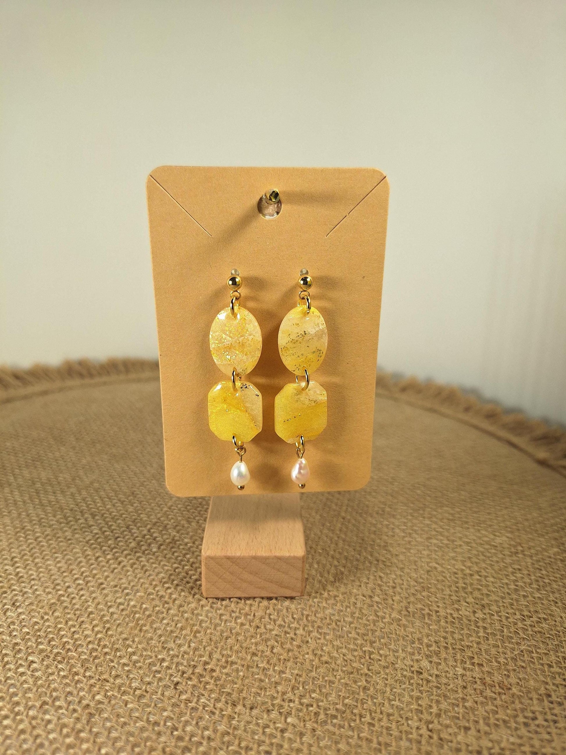 Les boucles d'oreilles sont réalisées en argile polymère, elles sont donc très légères. Elles sont recouvertes d'une fine couche de résine pour les protéger et révéler toutes leurs couleurs. Les tranches des bijoux sont vernies pour un fini soigné.