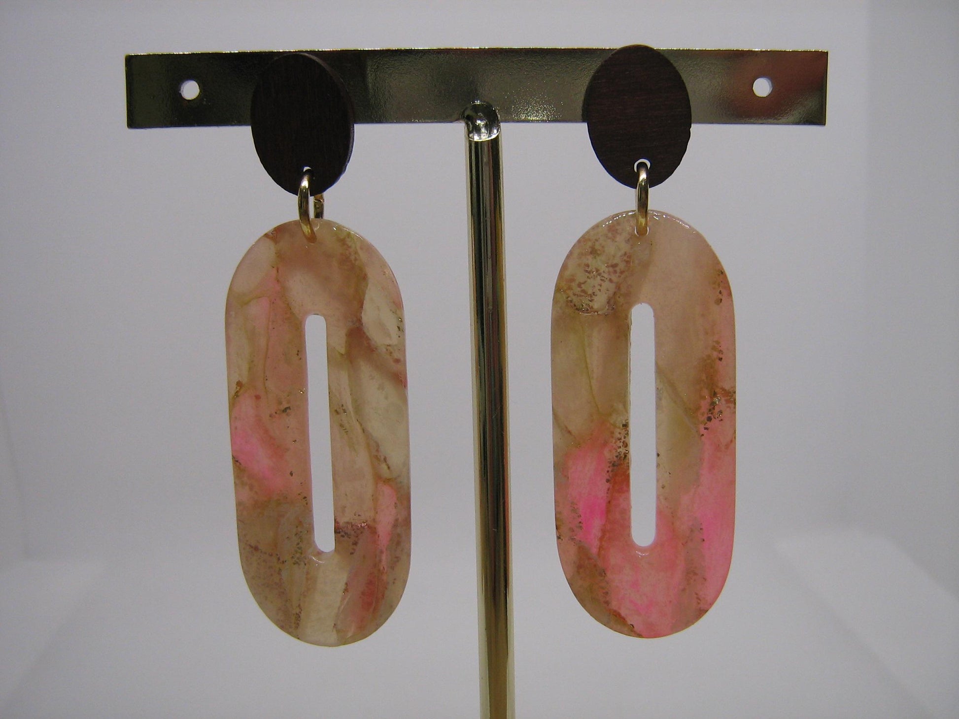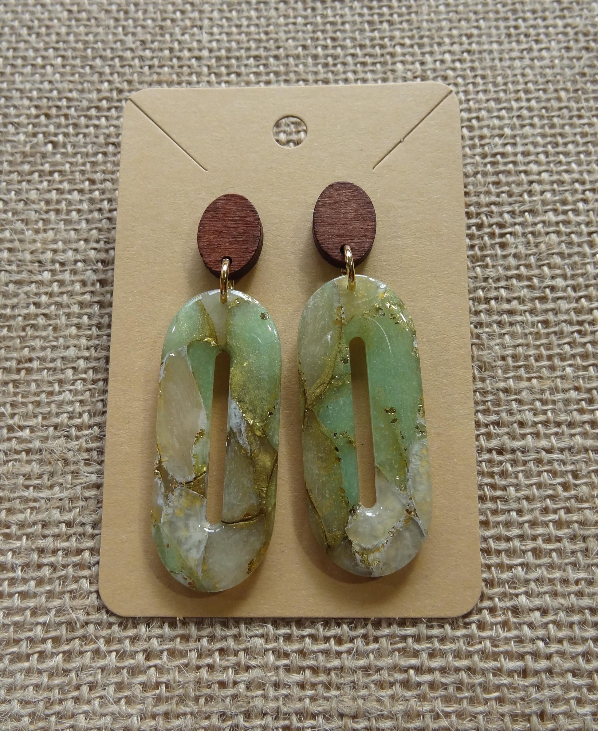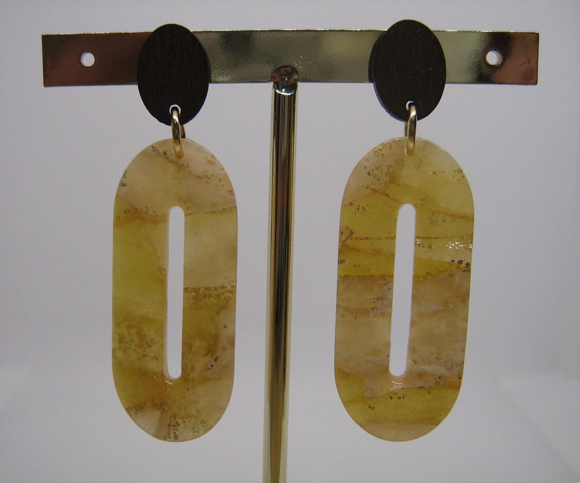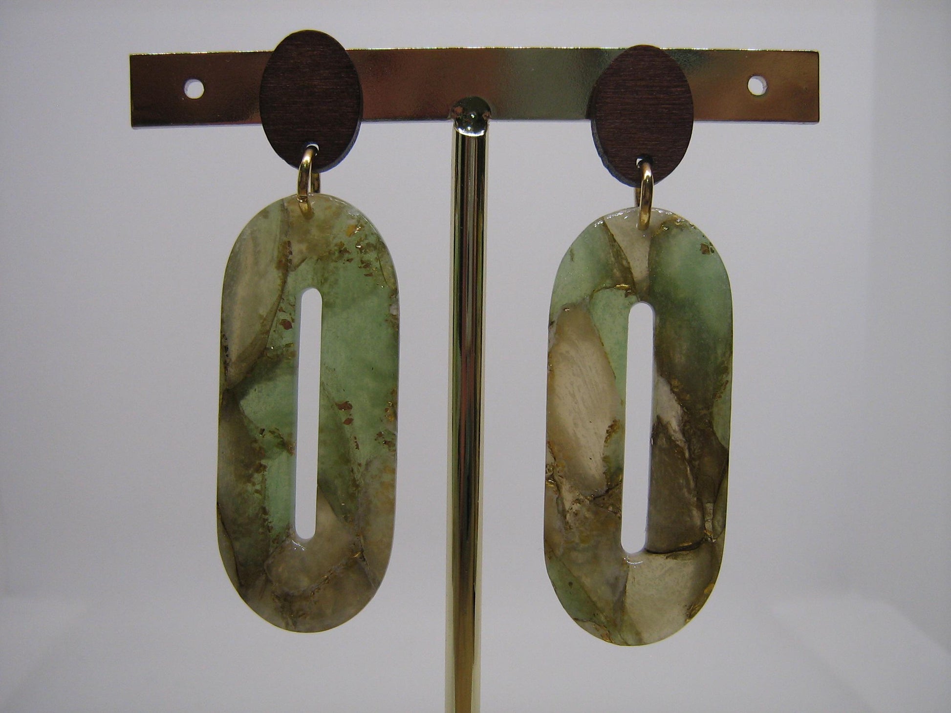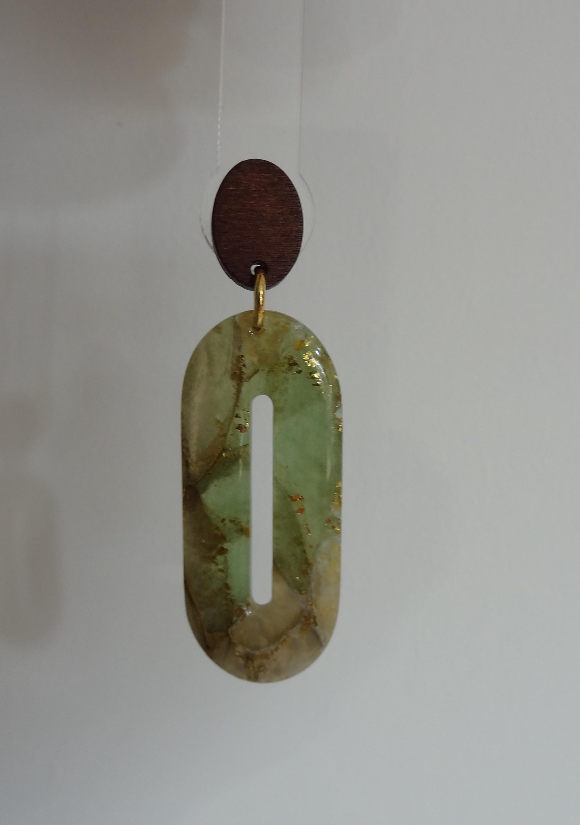 Tous nos bijoux sont assemblés avec des apprêts en acier inoxydable ou acier inoxydable plaqué or. Sur ce modèle le support est en bois avec une tige en acier inoxydable argenté. Les anneaux sont dorés.