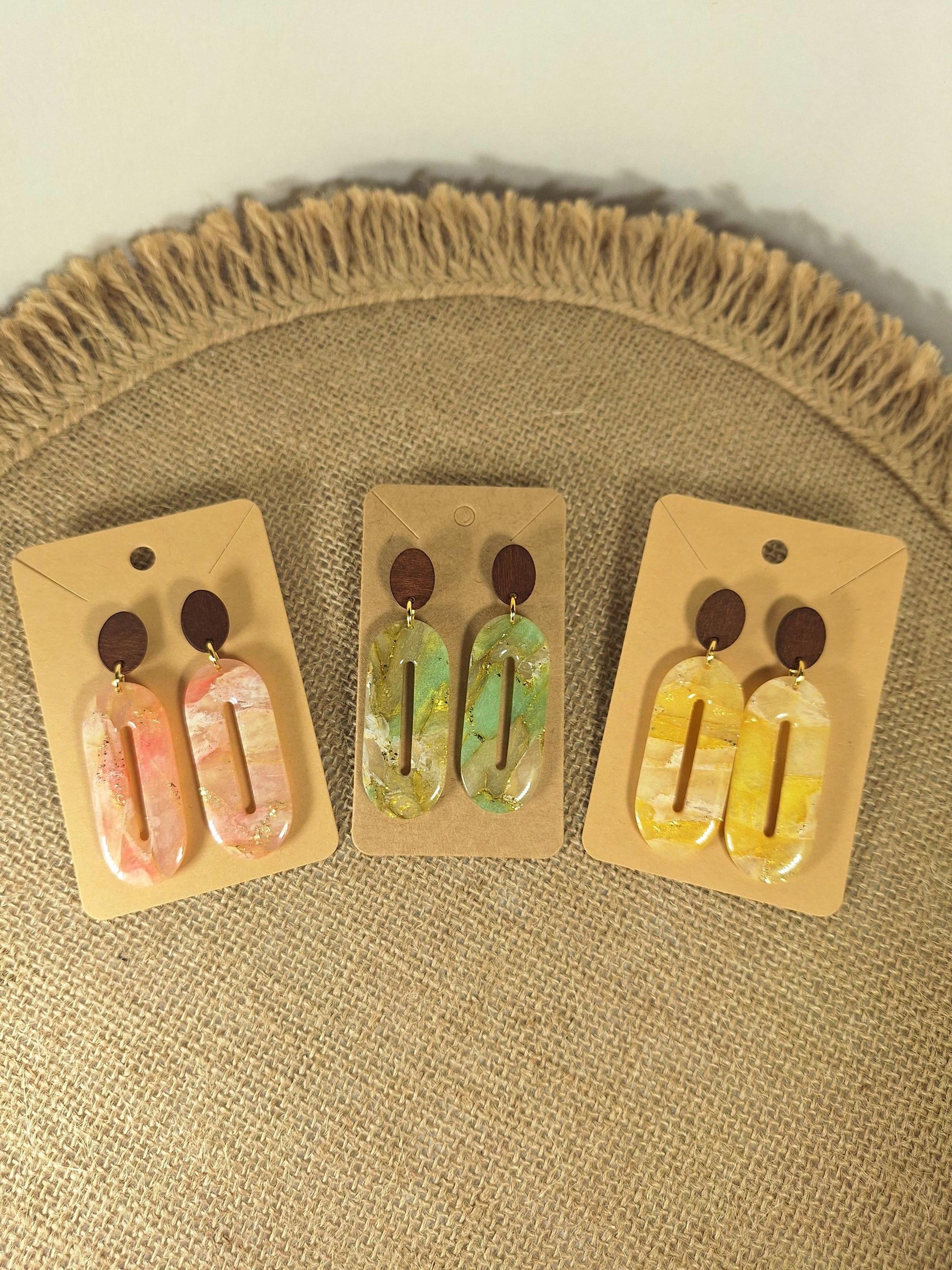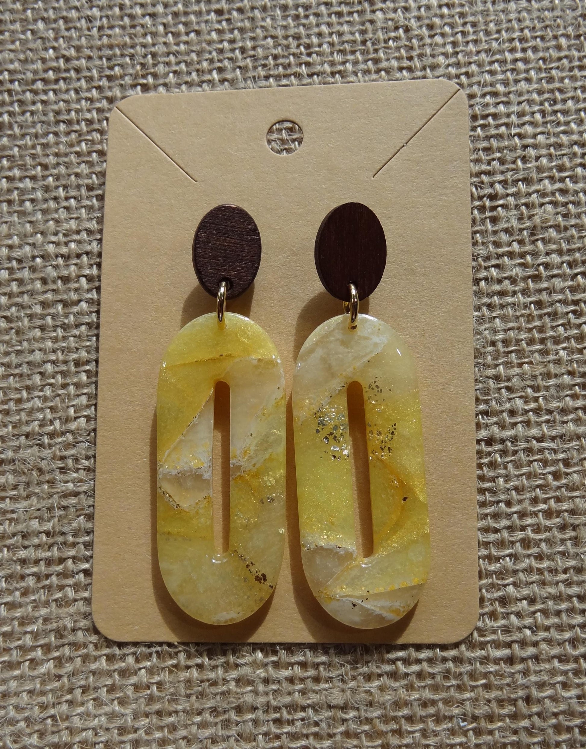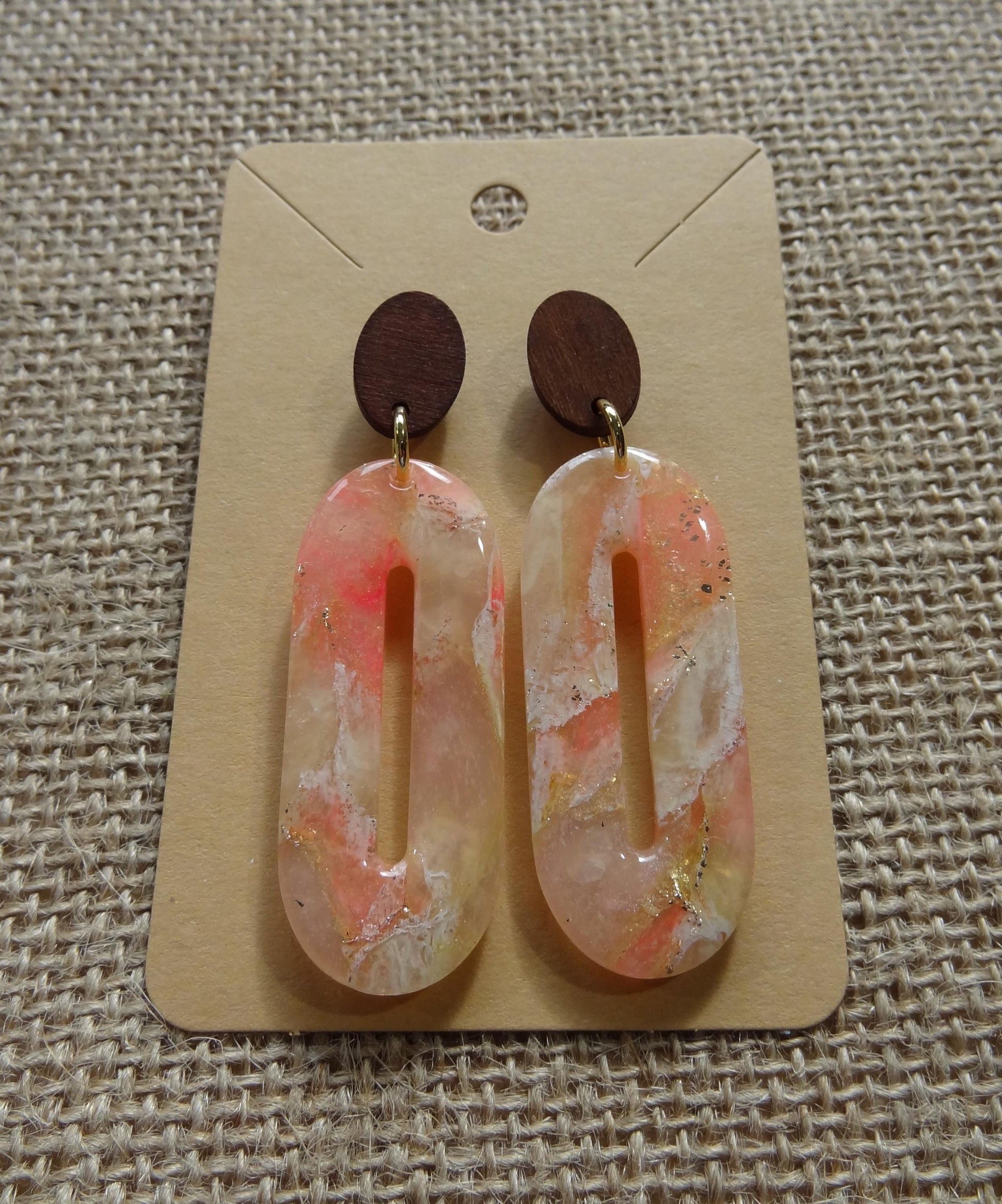 Les boucles d'oreilles sont réalisées en argile polymère, elles sont donc très légères. Elles sont recouvertes d'une fine couche de résine pour les protéger et révéler toutes leurs couleurs. Les tranches des bijoux sont vernies pour un fini soigné.