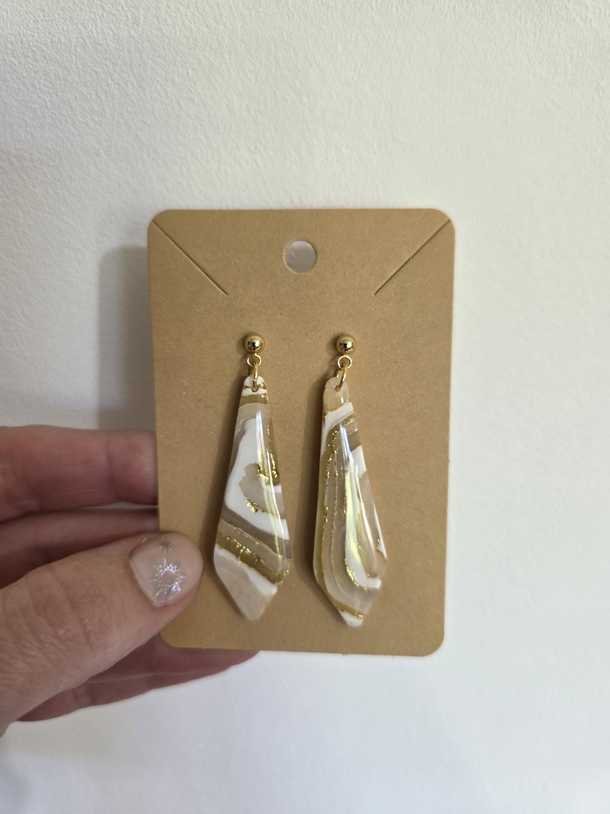 Les boucles d'oreilles sont réalisées en argile polymère, elles sont donc très légères. Elles sont recouvertes d'une fine couche de résine pour les protéger et révéler toutes leurs couleurs. Les tranches des bijoux sont vernies pour un fini soigné.