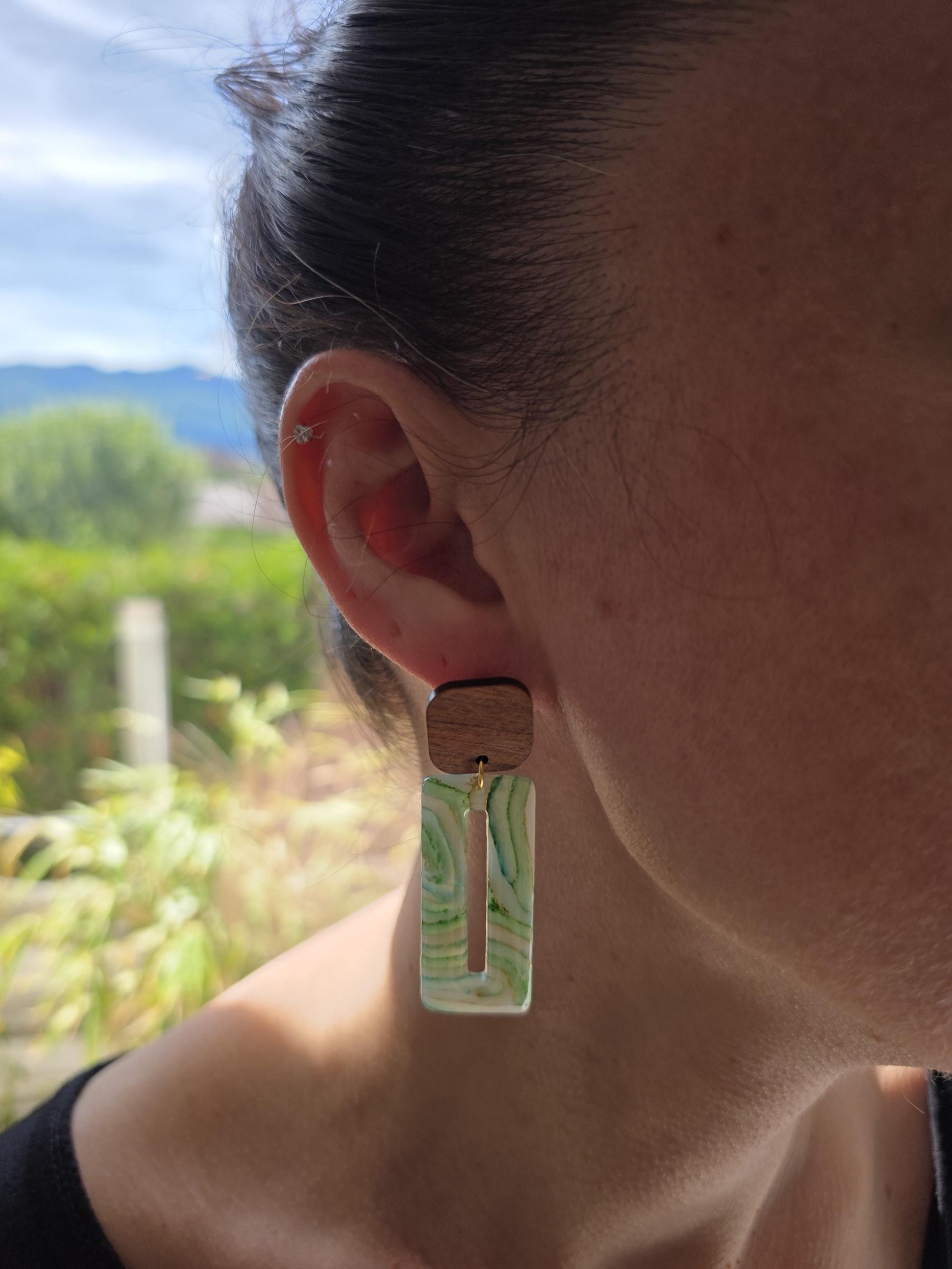 Les boucles d'oreilles sont réalisées en argile polymère, elles sont donc très légères. Elles sont recouvertes d'une fine couche de résine pour les protéger et révéler toutes leurs couleurs. Les tranches des bijoux sont vernies pour un fini soigné.