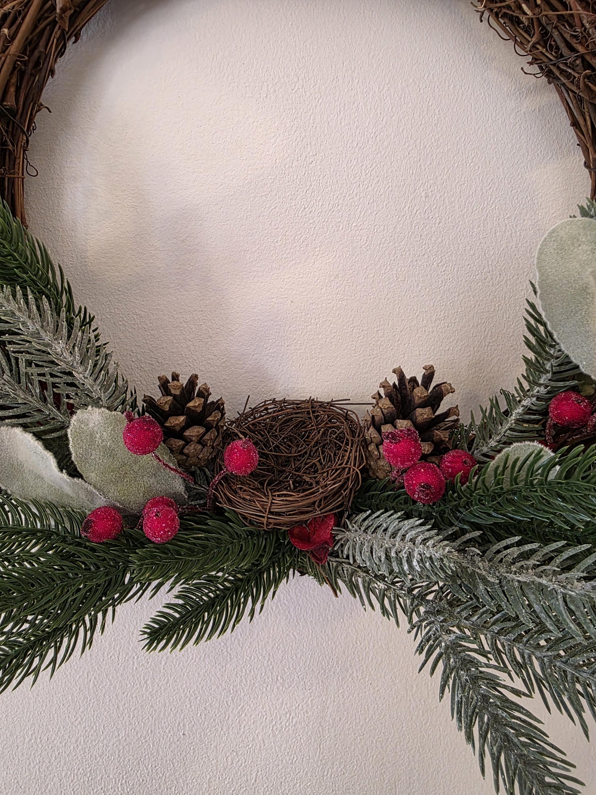 Au centre, un petit nid discret abrite un secret de Noël, tandis qu’un cardinal rouge accroché un peu plus haut apporte une touche vivante et chaleureuse. Ce petit oiseau peut être retiré ou repositionné, selon vos envies. Chaque détail est pensé pour éveiller la féérie et la douceur de l’hiver dans votre intérieur ou sur votre porte.