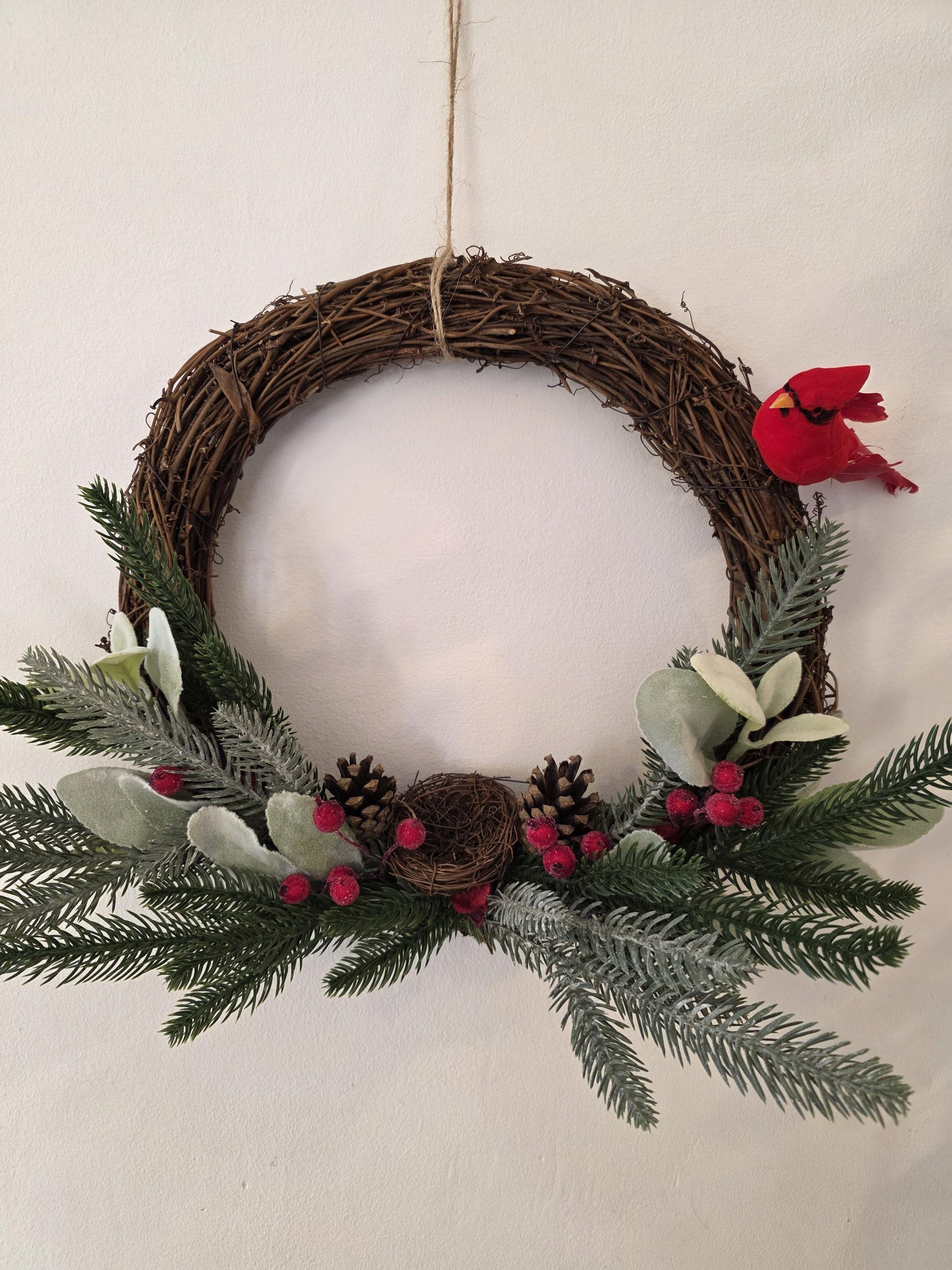 Cardinal du Jardin d’Hiver – Couronne de Noël artisanale unique