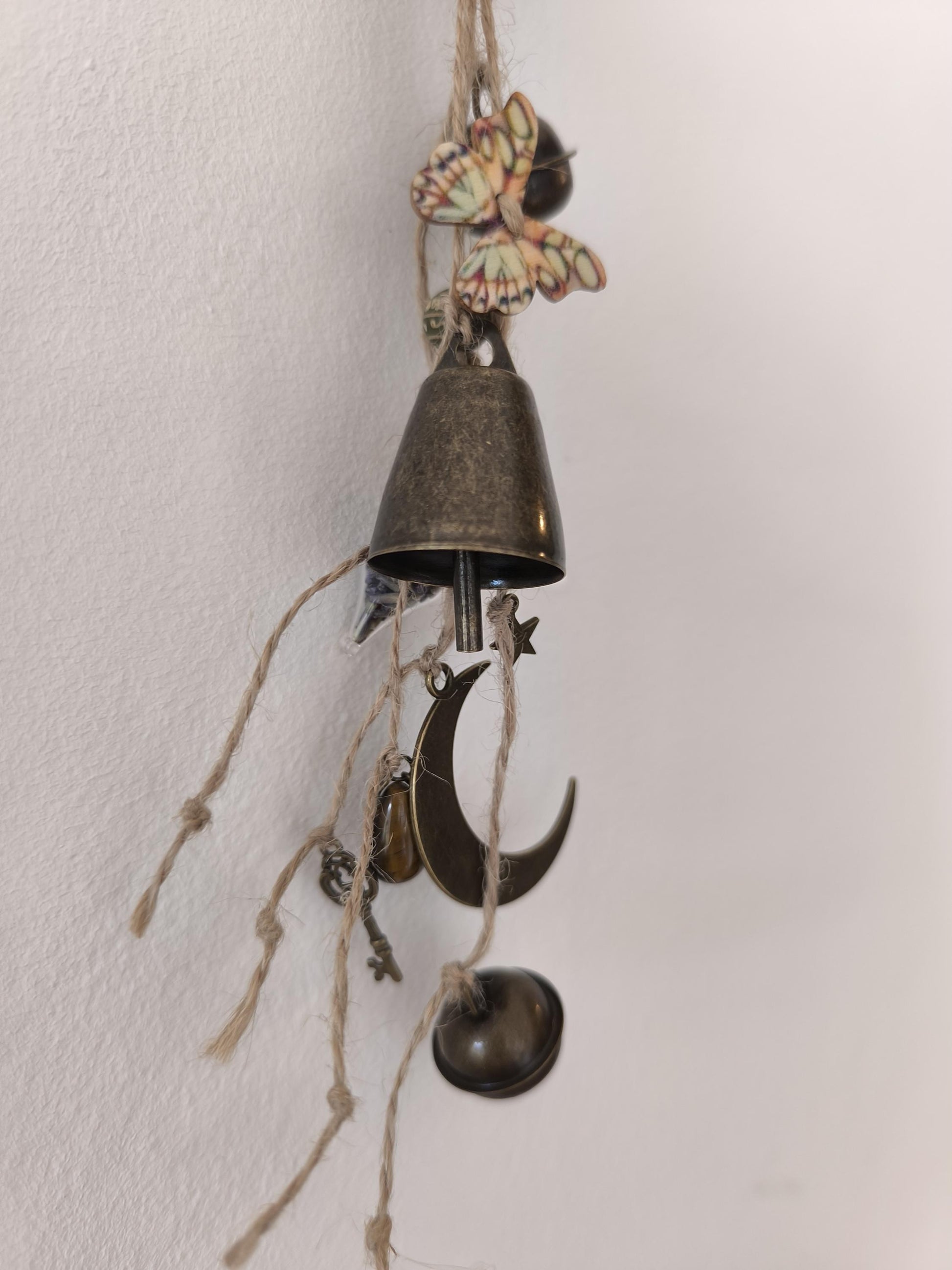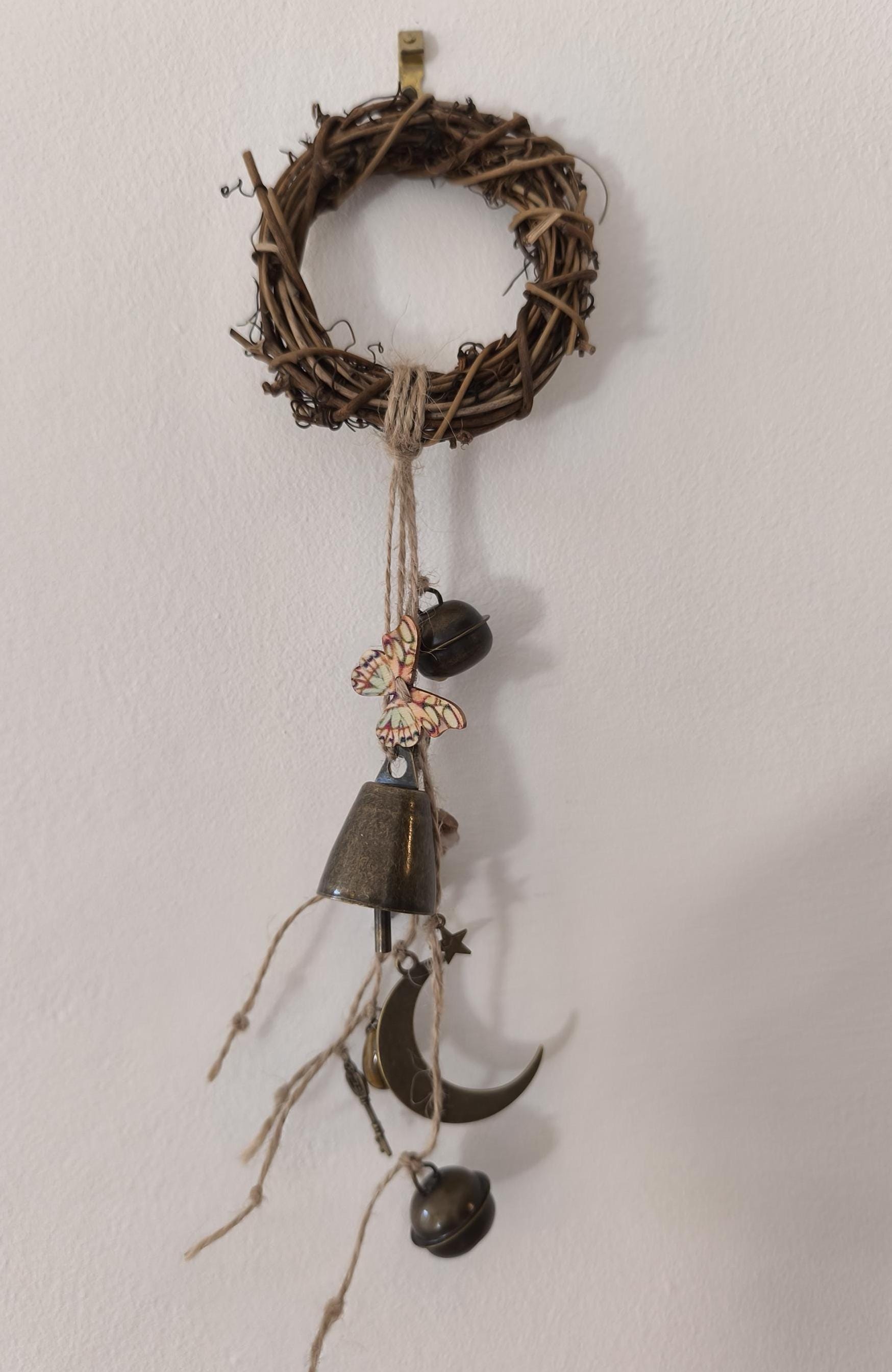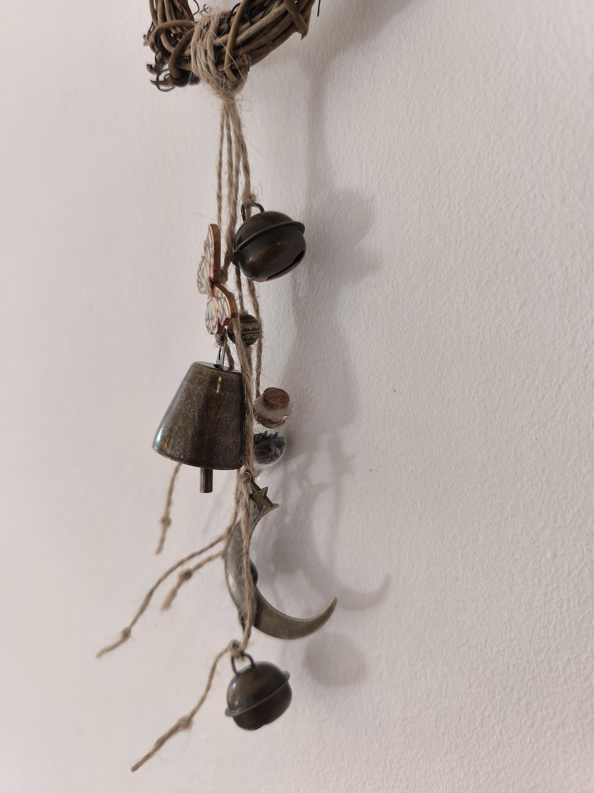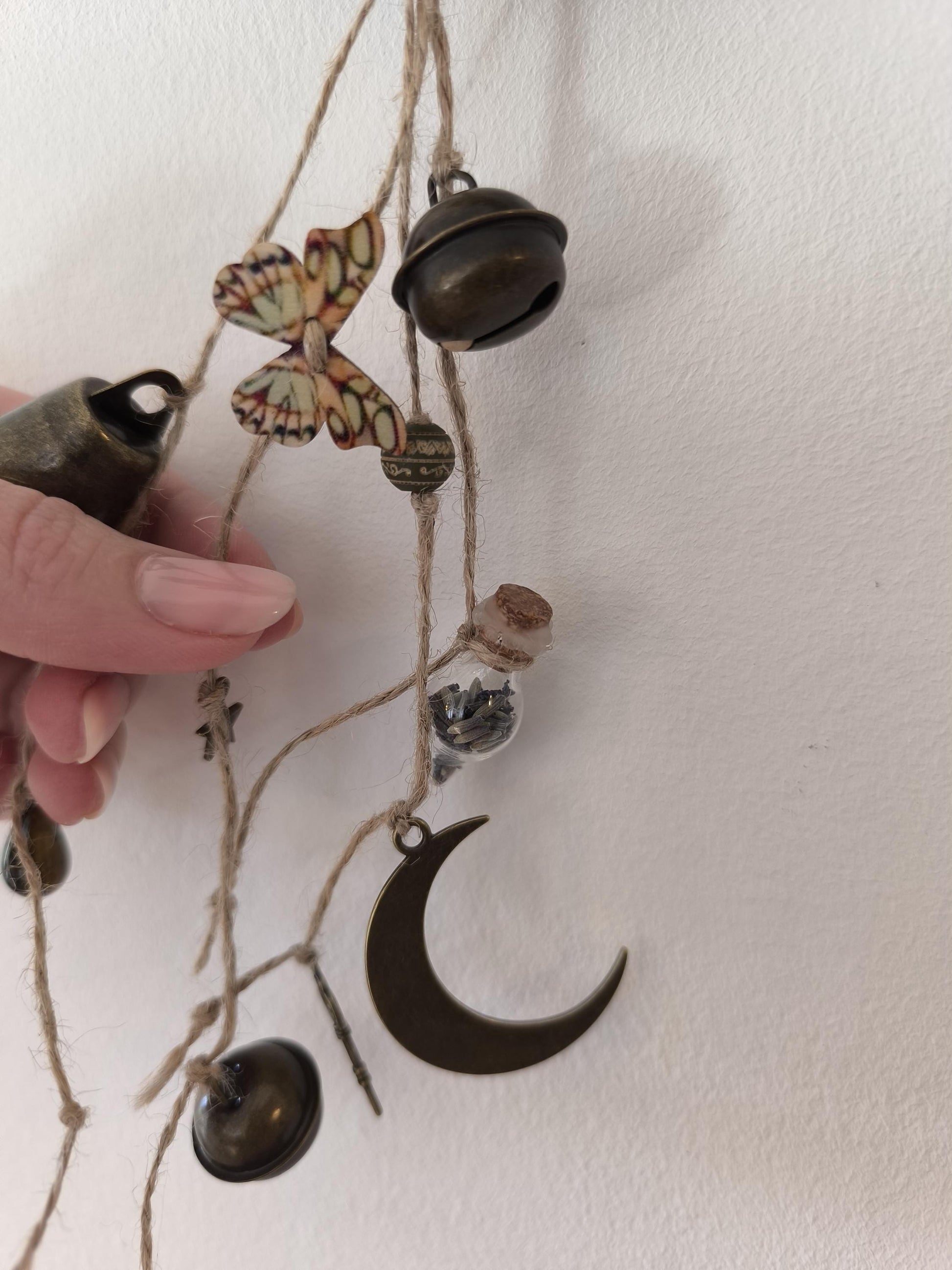 Cloche de sorcière décorative en sarments de vigne, agrémentée d'une cloche, de grelots, d'une clé, d'une perle en bois, d'une lune, d'une étoile, d'un papillon en bois, d'une véritable perle en œil de tigre et d'une fiole en verre contenant de la lavande (de mon jardin :-).