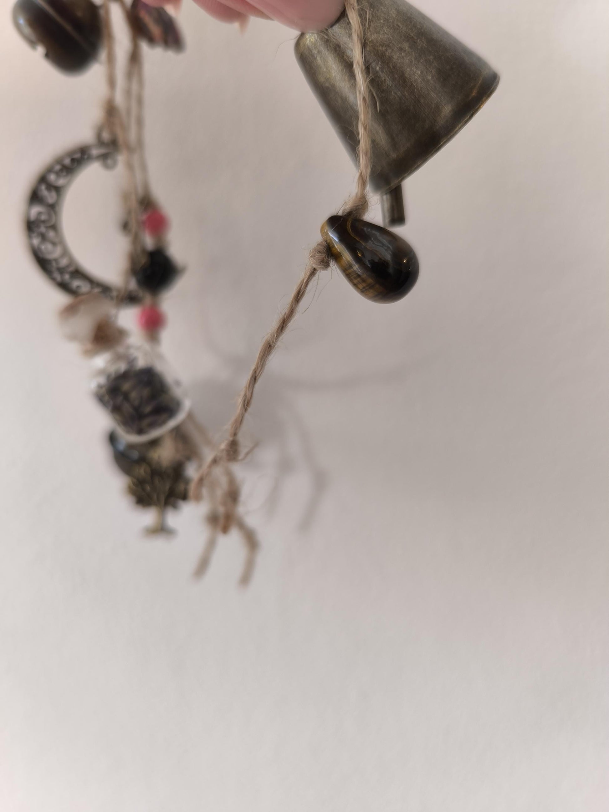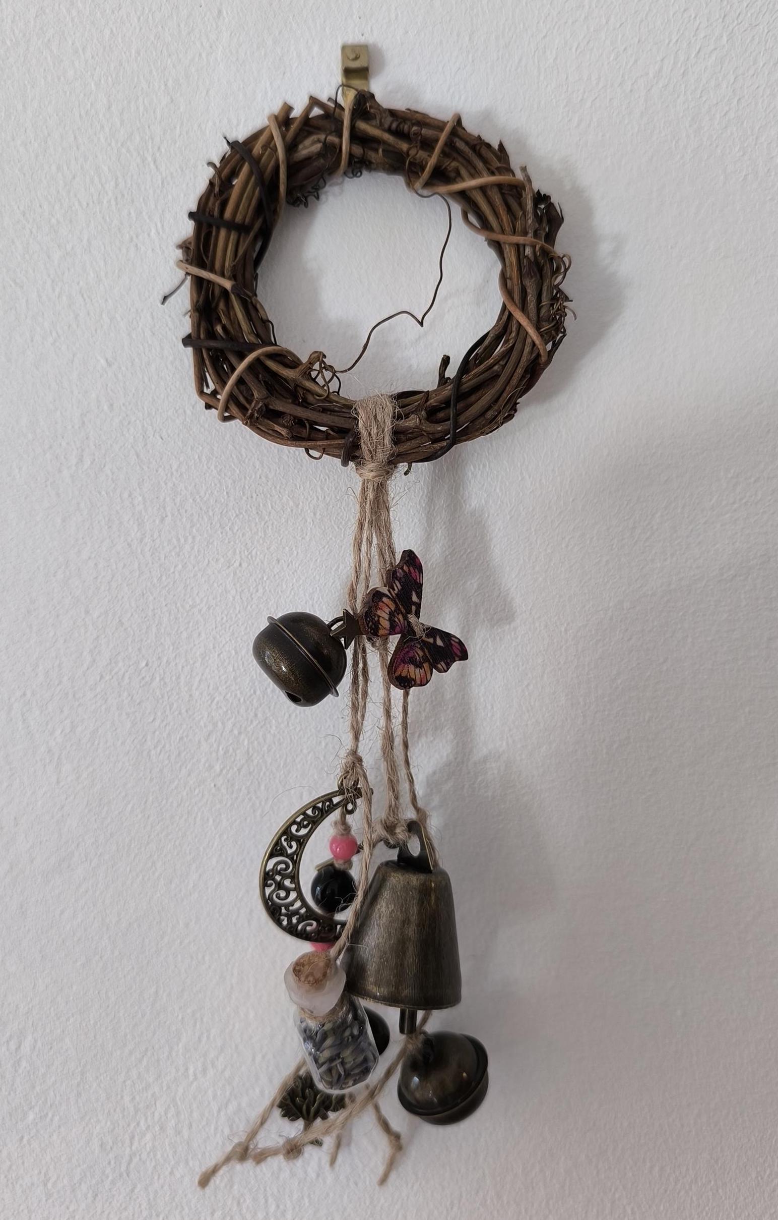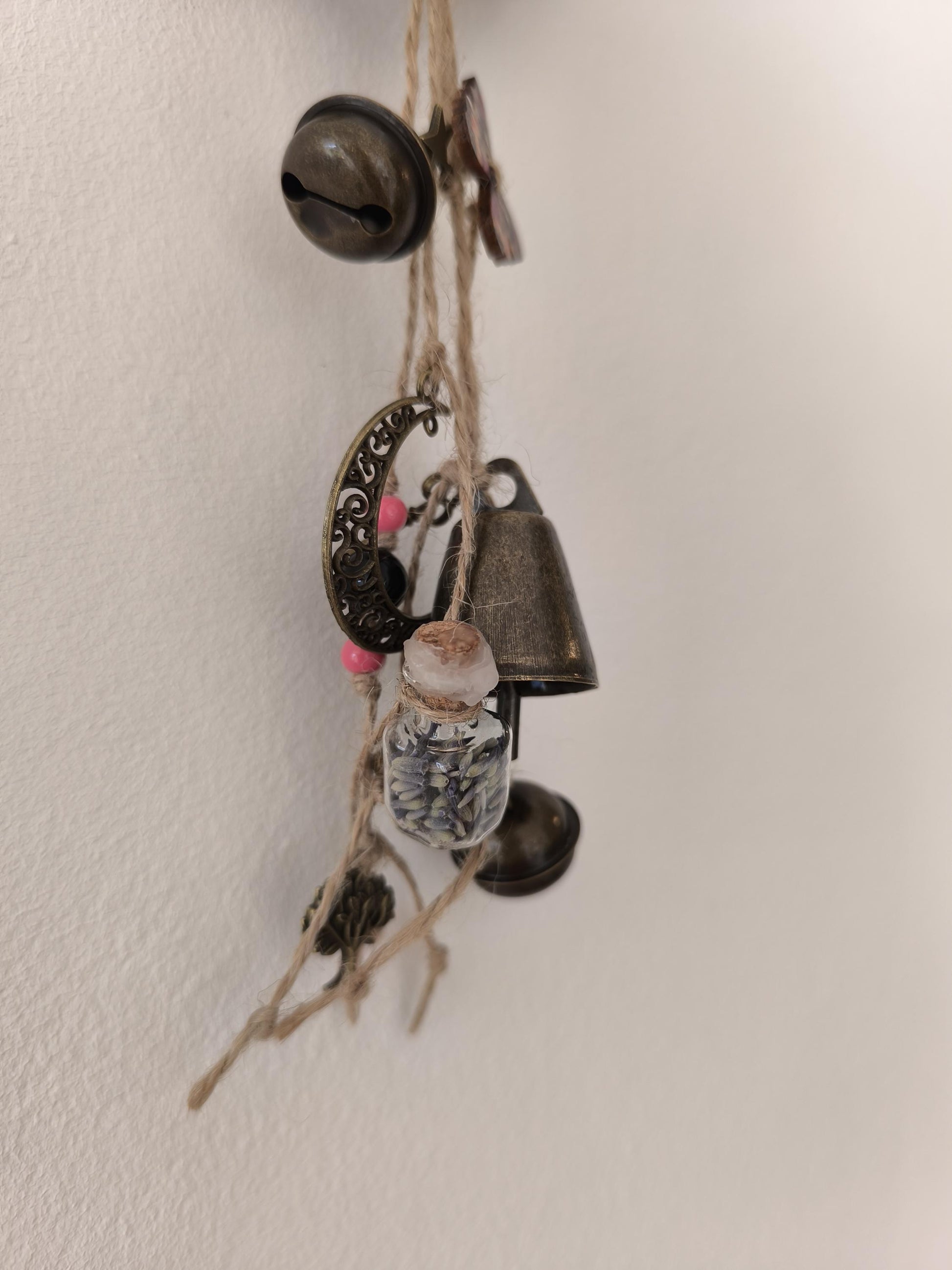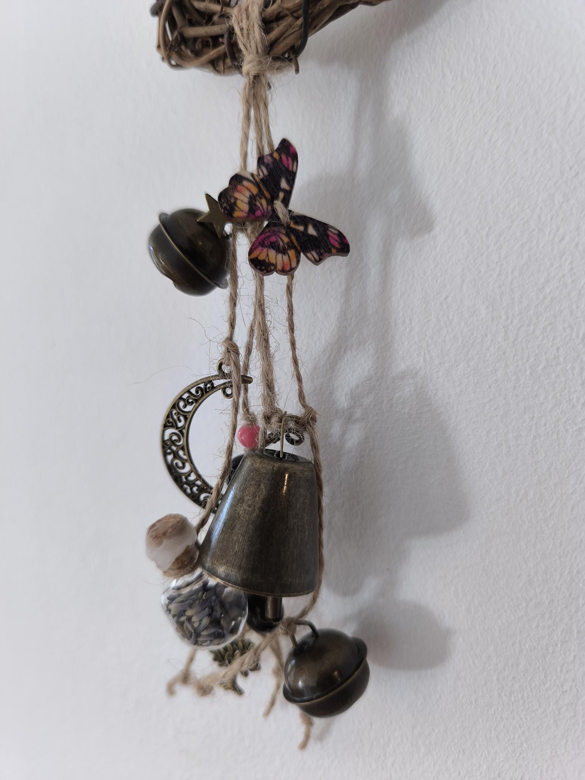 Cloche de sorcière décorative en sarments de vigne, agrémentée d'une cloche, de grelots, d'une clé, de perles colorées (dont une perle noire en obsidienne), d'une lune, d'une étoile, d'un papillon en bois, d'une libellule, d'une véritable perle en oeil de tigre et d'une fiole en verre contenant de la lavande (de mon jardin :-).