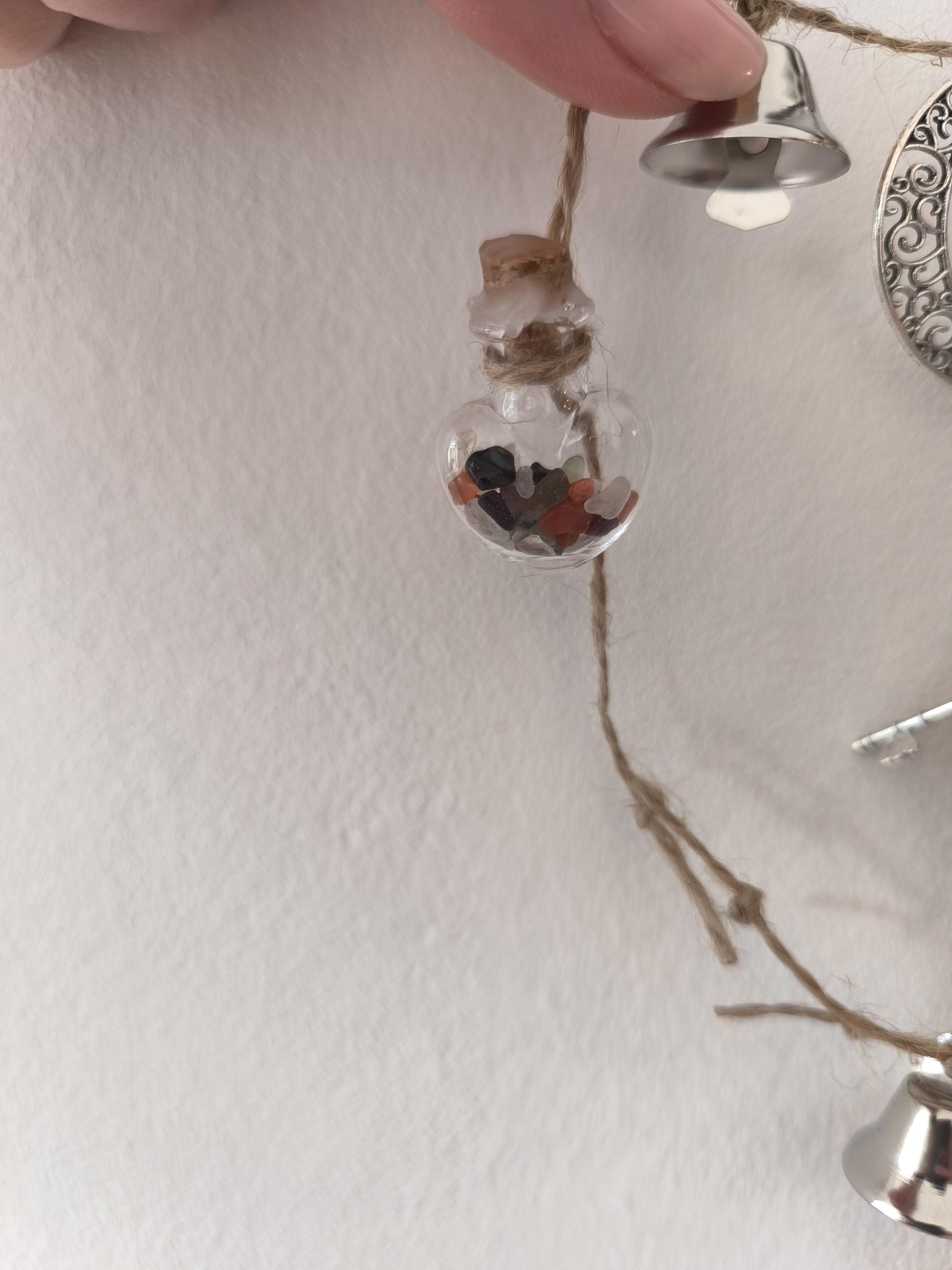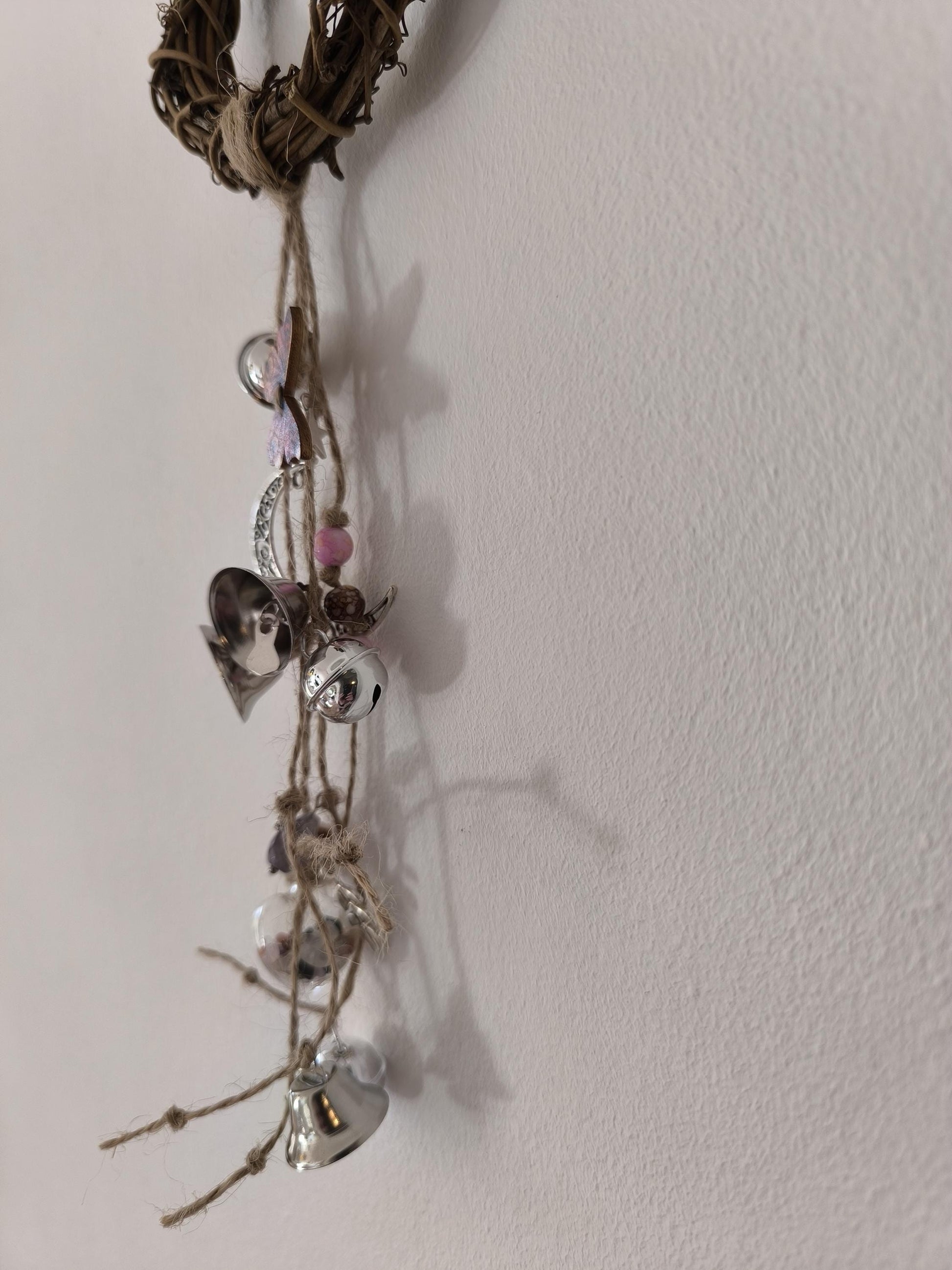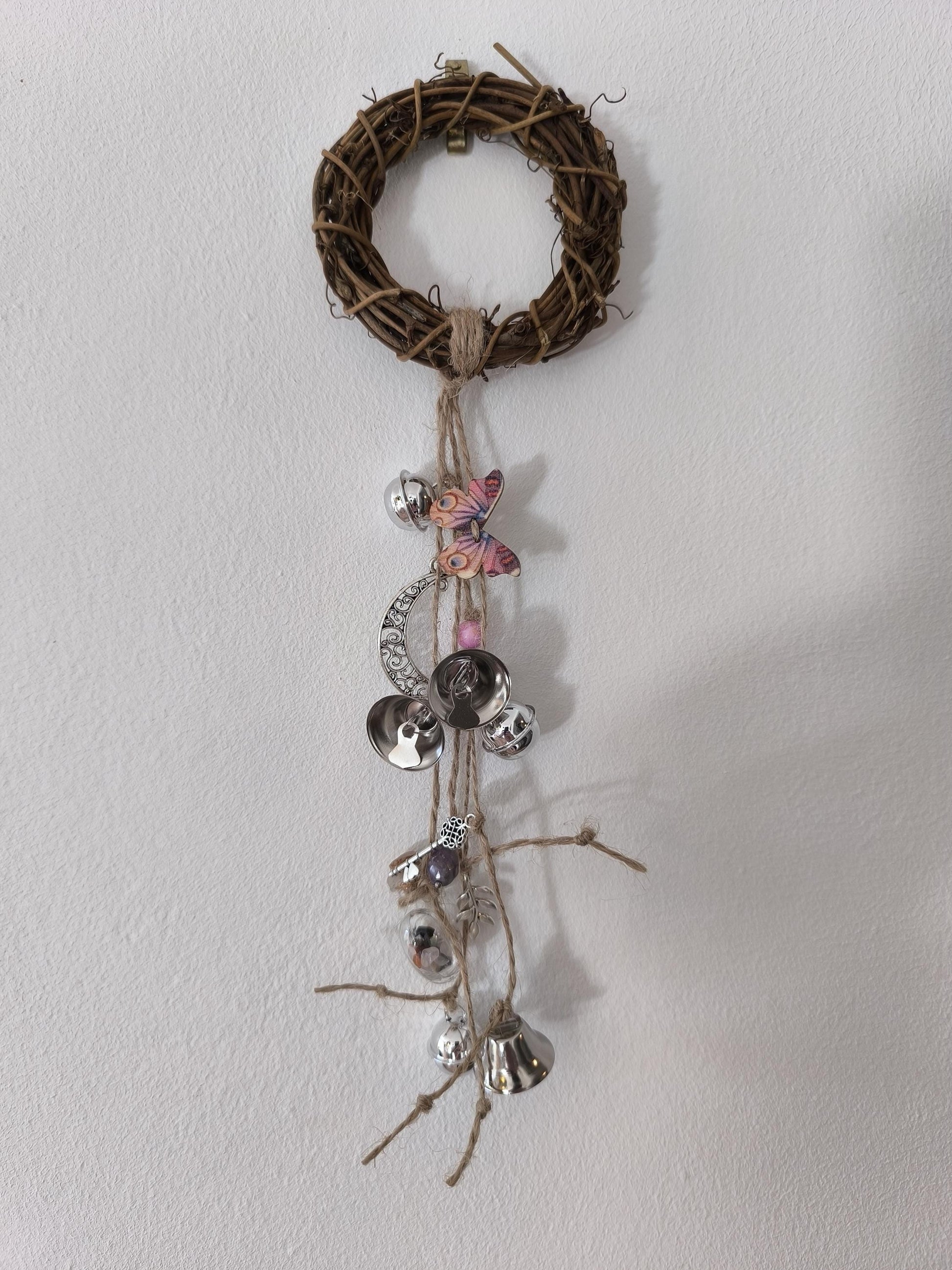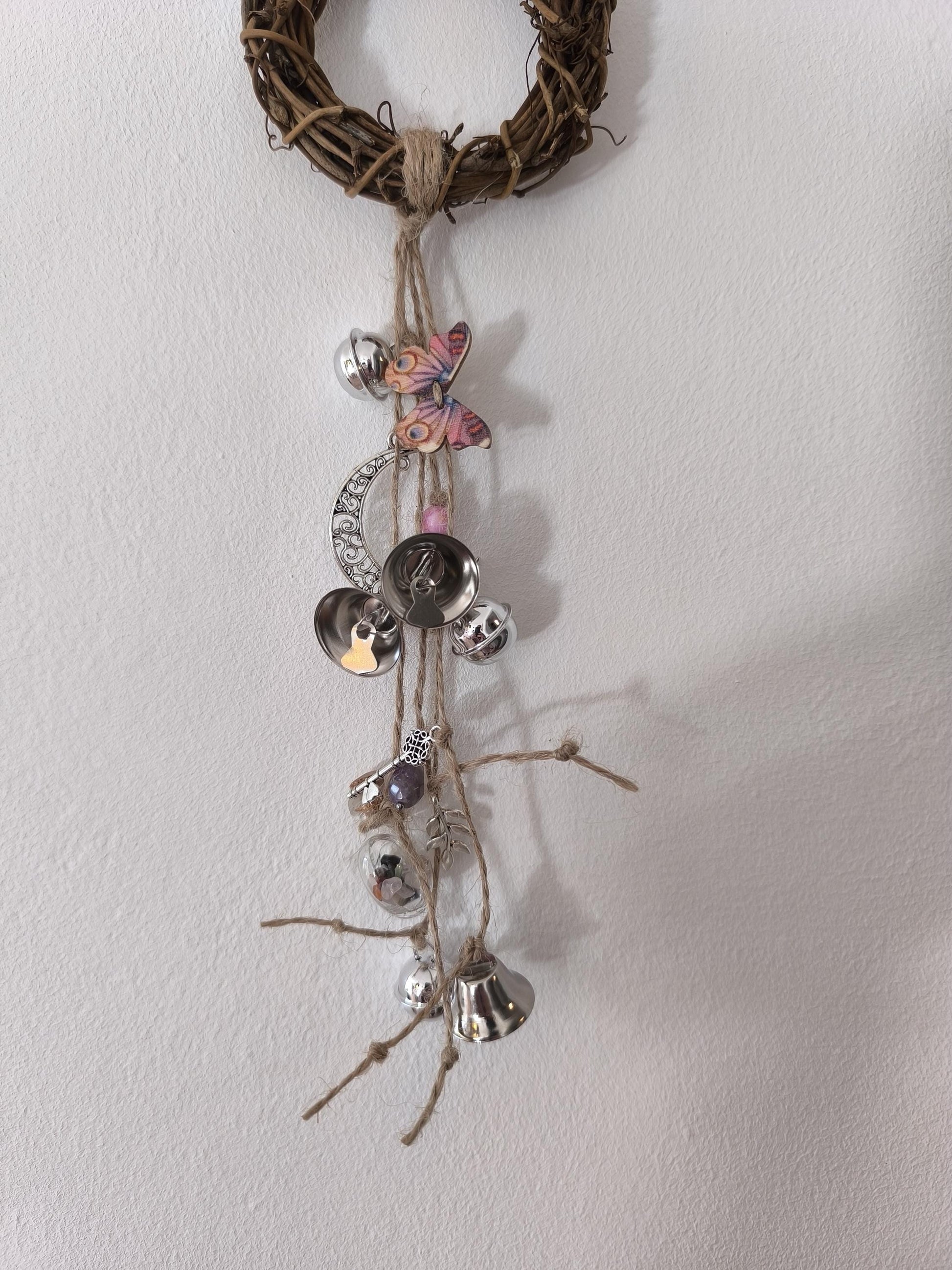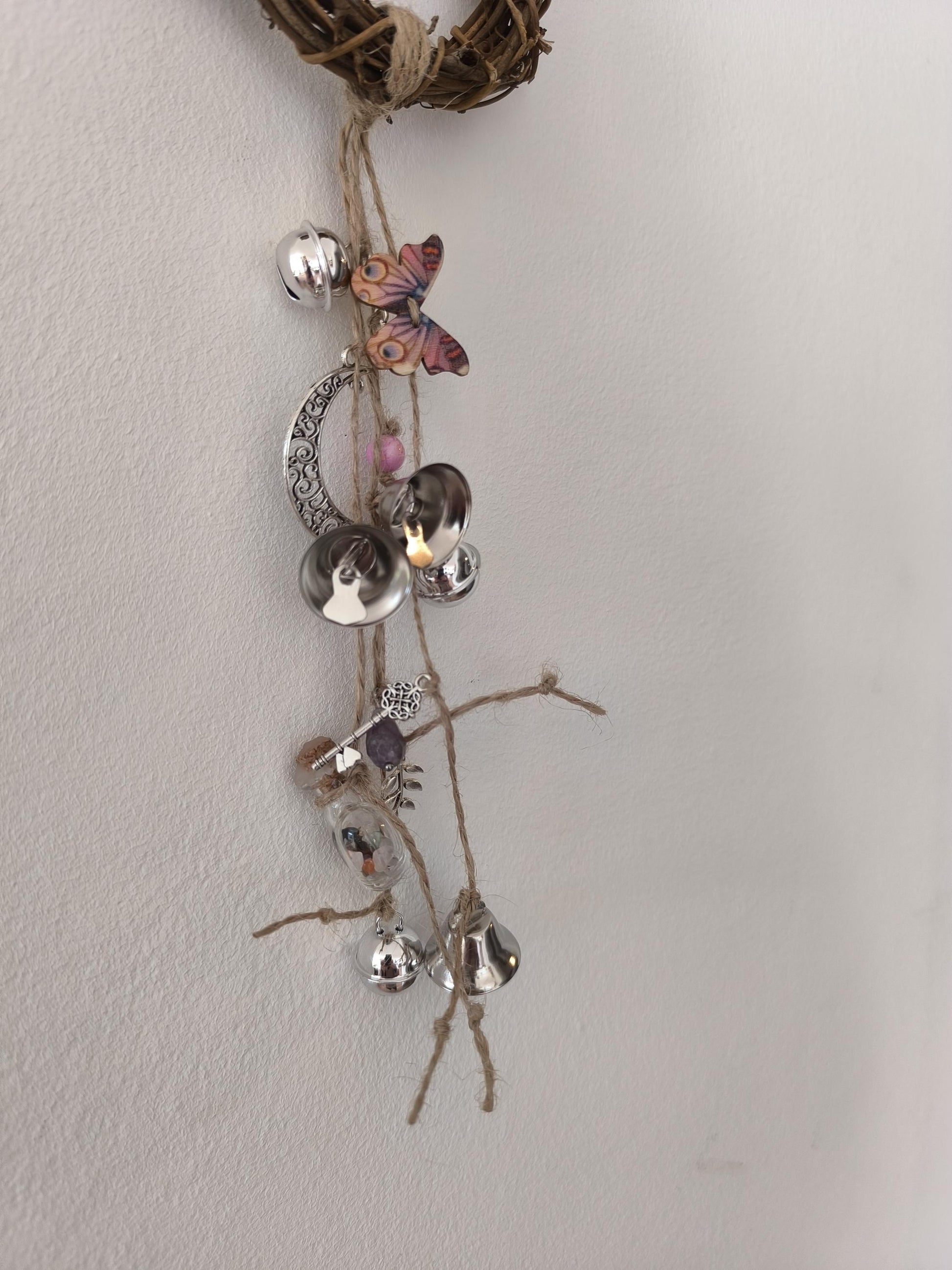 Cloche de sorcière décorative en sarments de vigne, agrémentée d'une cloche, de grelots, d'une clé, de perles colorées, d'une lune, d'une étoile, d'un papillon en bois, d'une breloque feuille, d'une véritable perle d'améthyste et d'une fiole en verre contenant de petits minéraux.