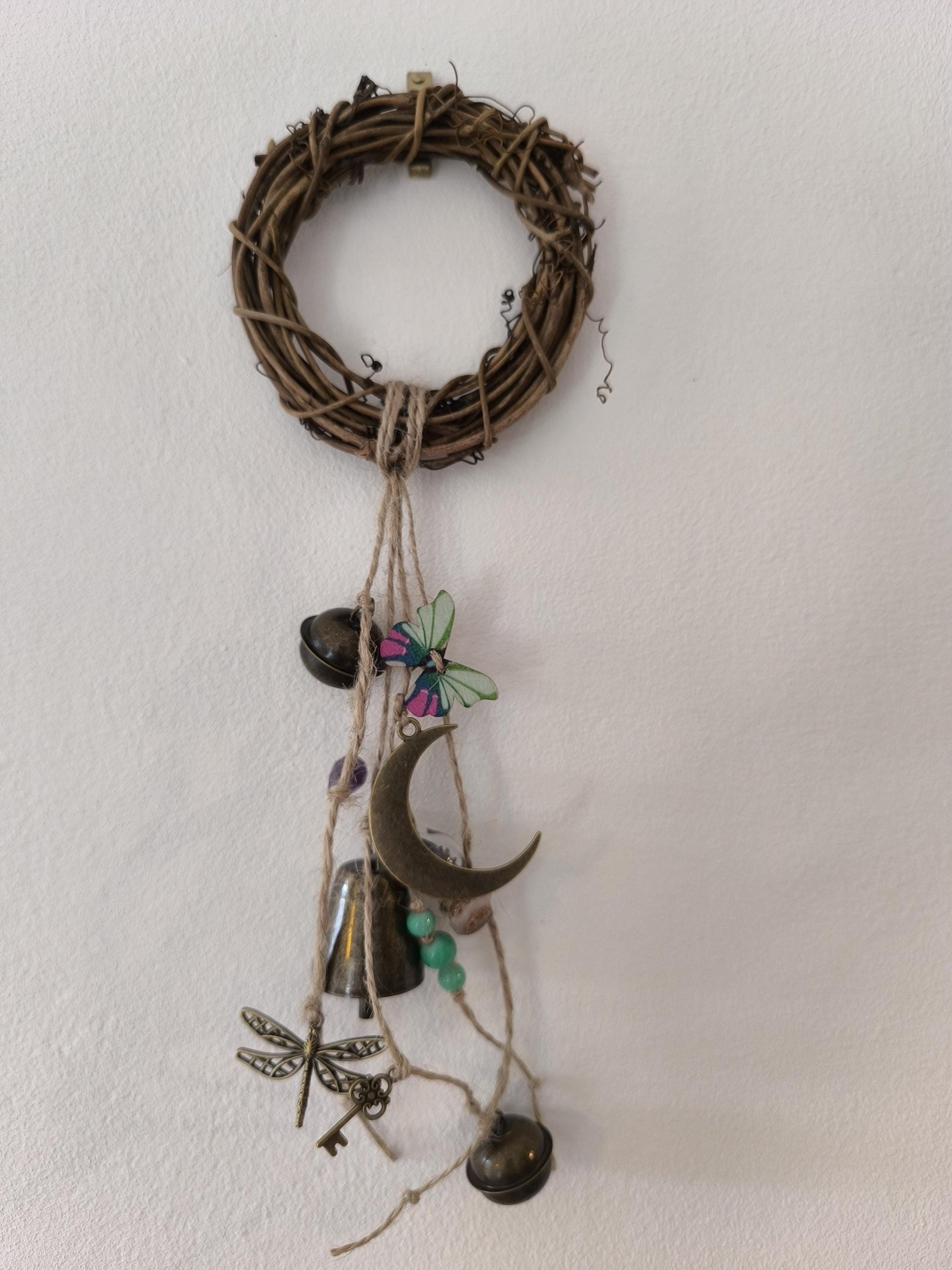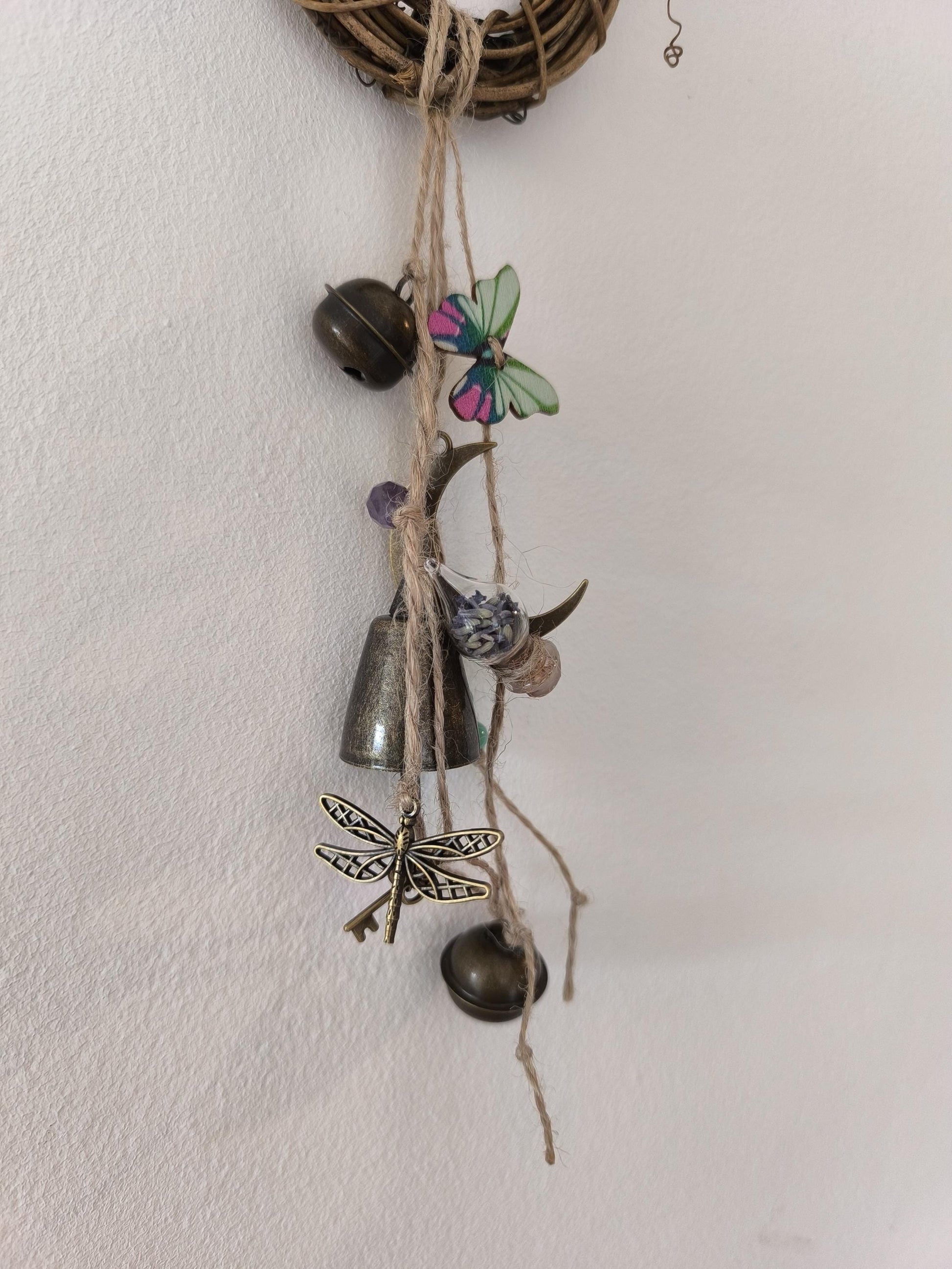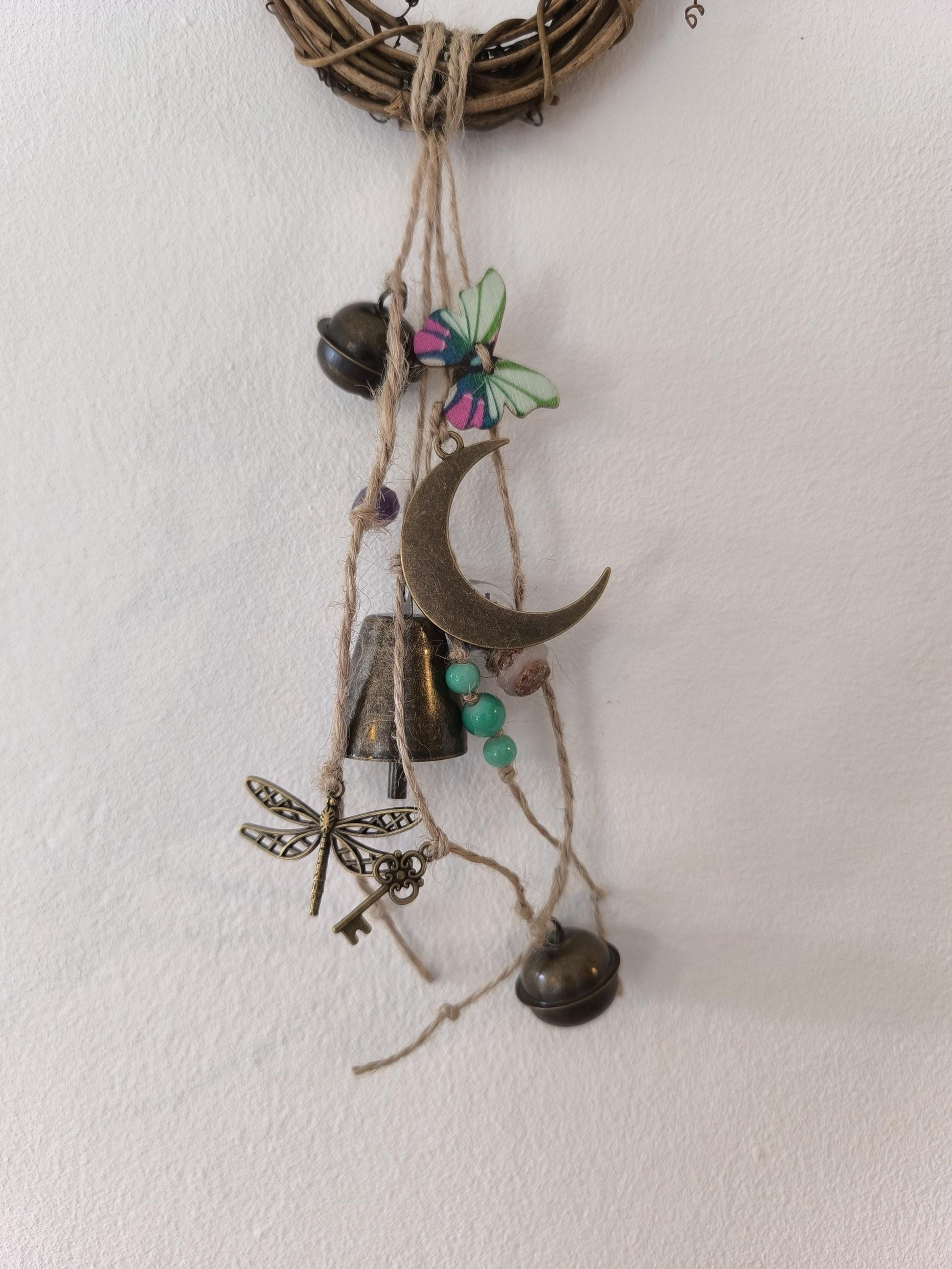 Cloche de sorcière décorative en sarments de vigne, agrémentée d'une cloche, de grelots, d'une clé, de perles colorées, d'une lune, d'une étoile, d'un papillon en bois, d'une libellule, d'une véritable perle d'améthyste et d'une fiole en verre contenant de la lavande (de mon jardin :-).