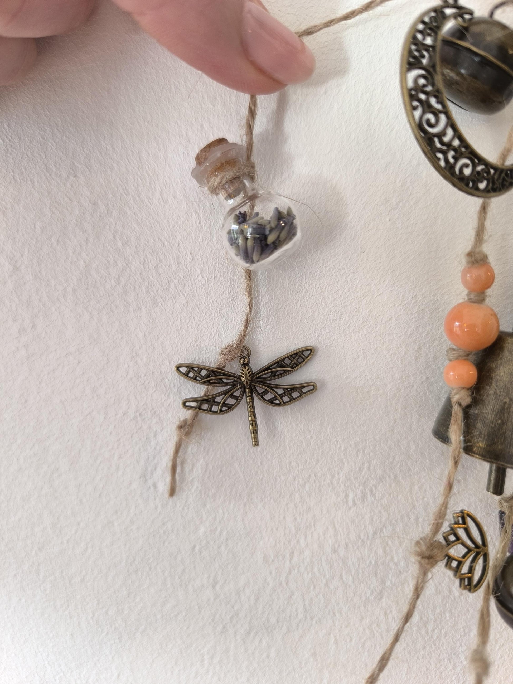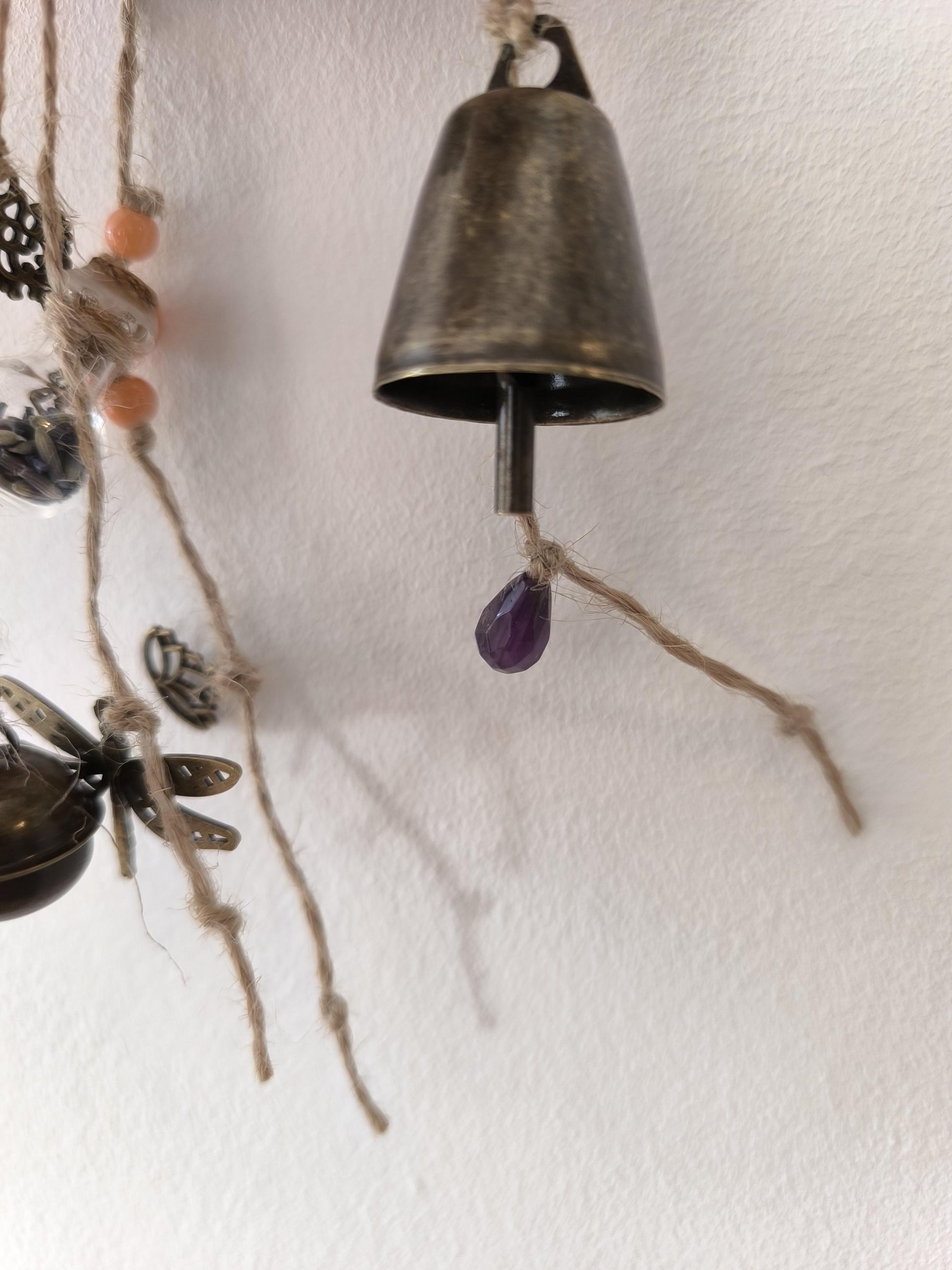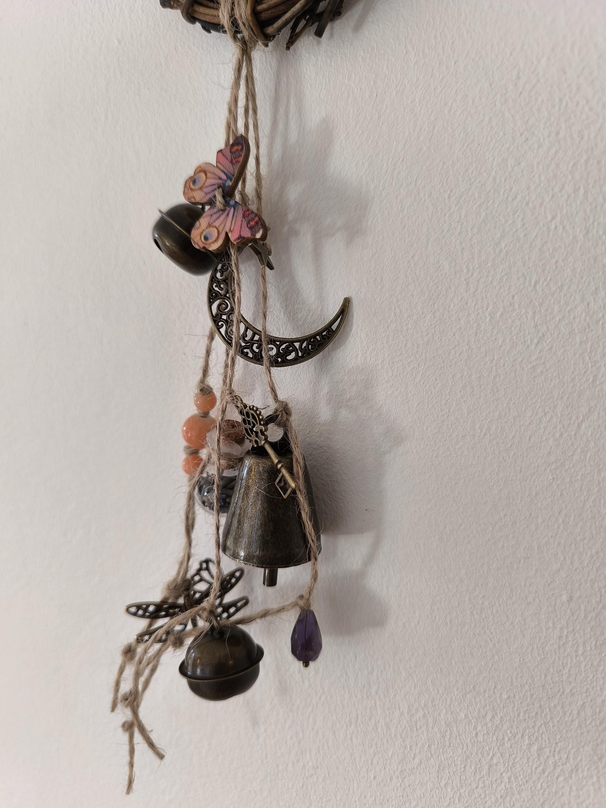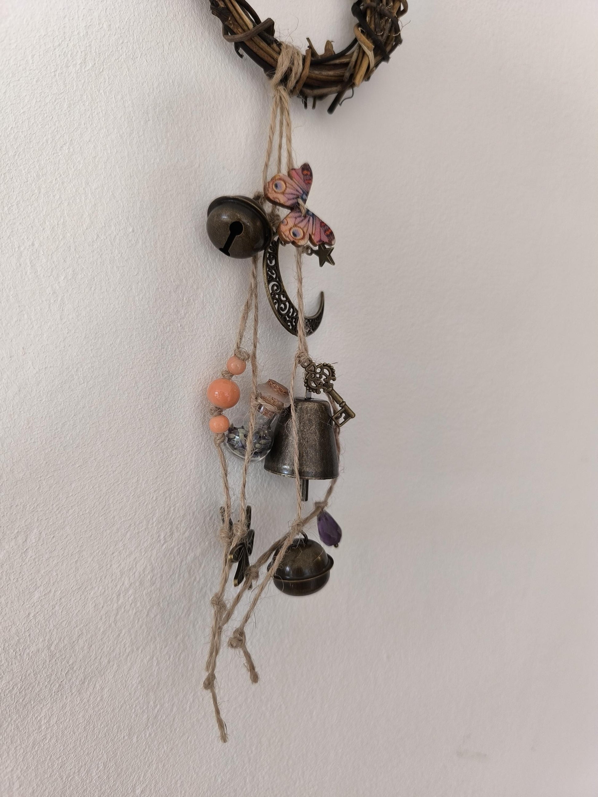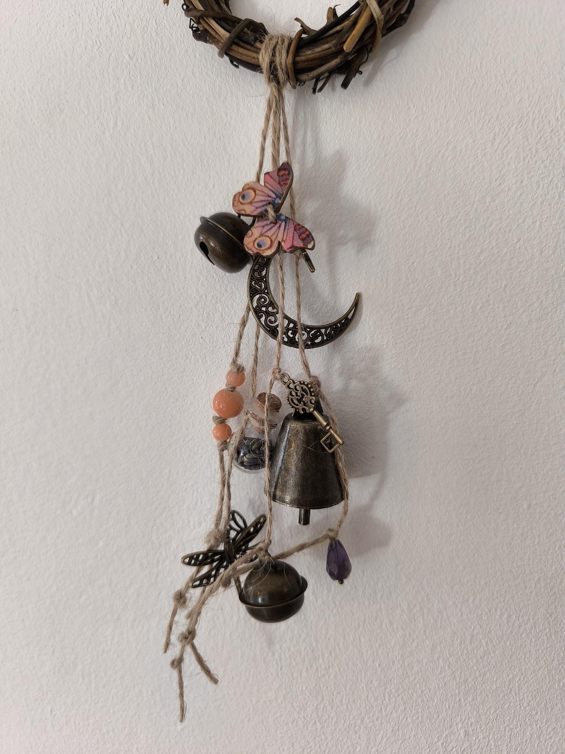 Cloche de sorcière décorative en sarments de vigne, agrémentée d'une cloche, de grelots, d'une clé, de perles colorées, d'une lune, d'une étoile, d'un papillon en bois, d'une libellule, d'une véritable perle d'améthyste et d'une fiole en verre contenant de la lavande (de mon jardin :-).