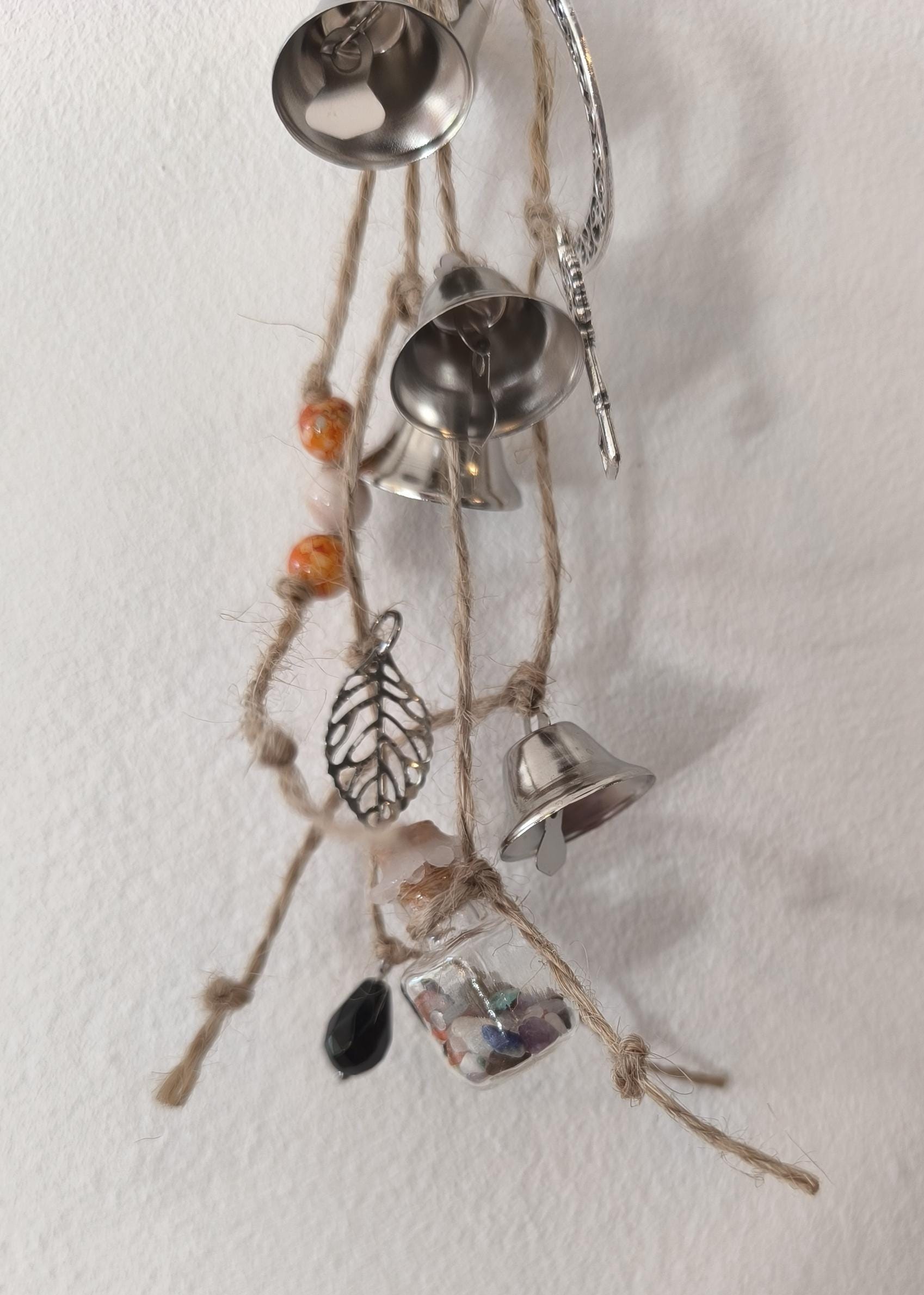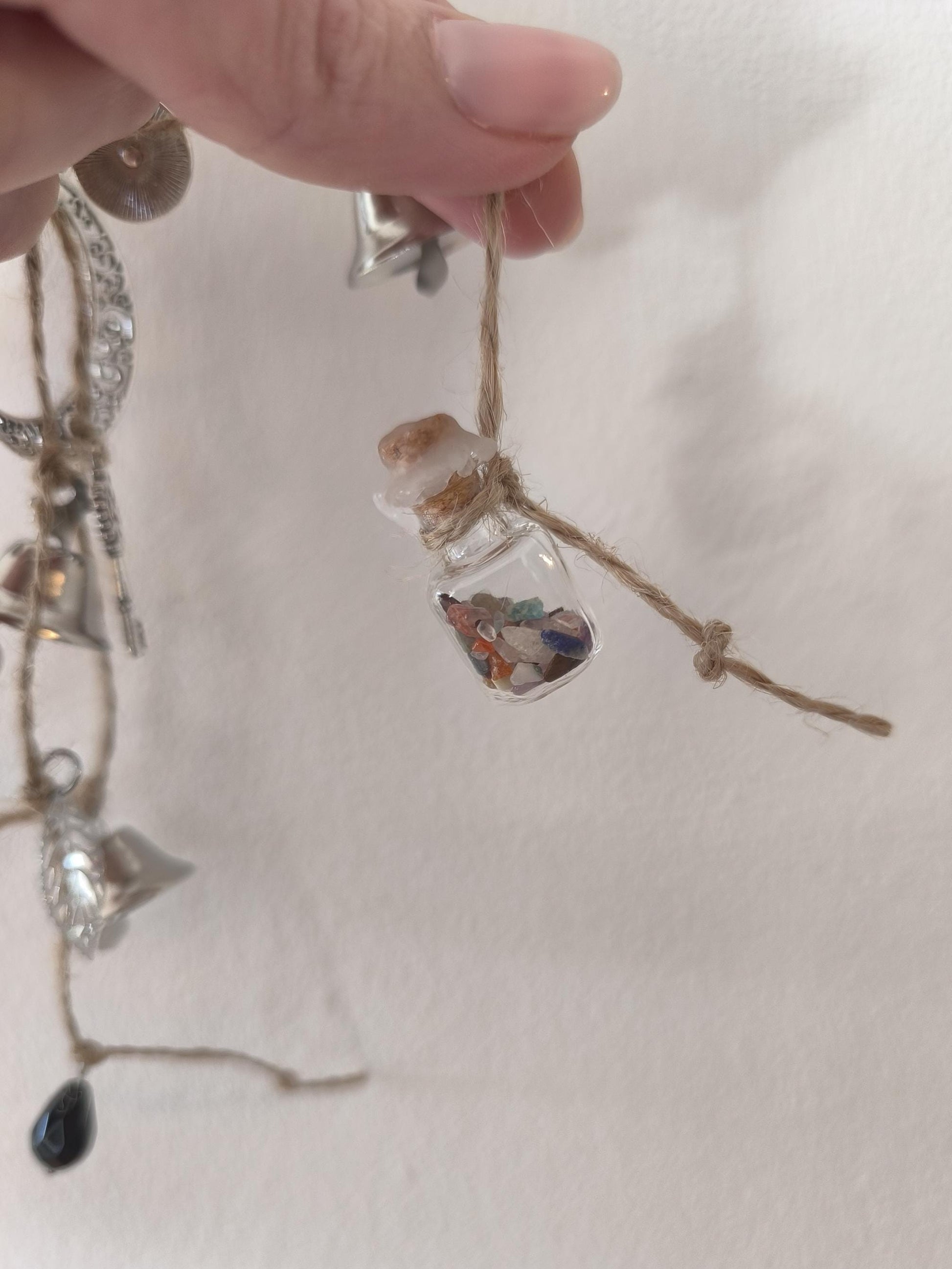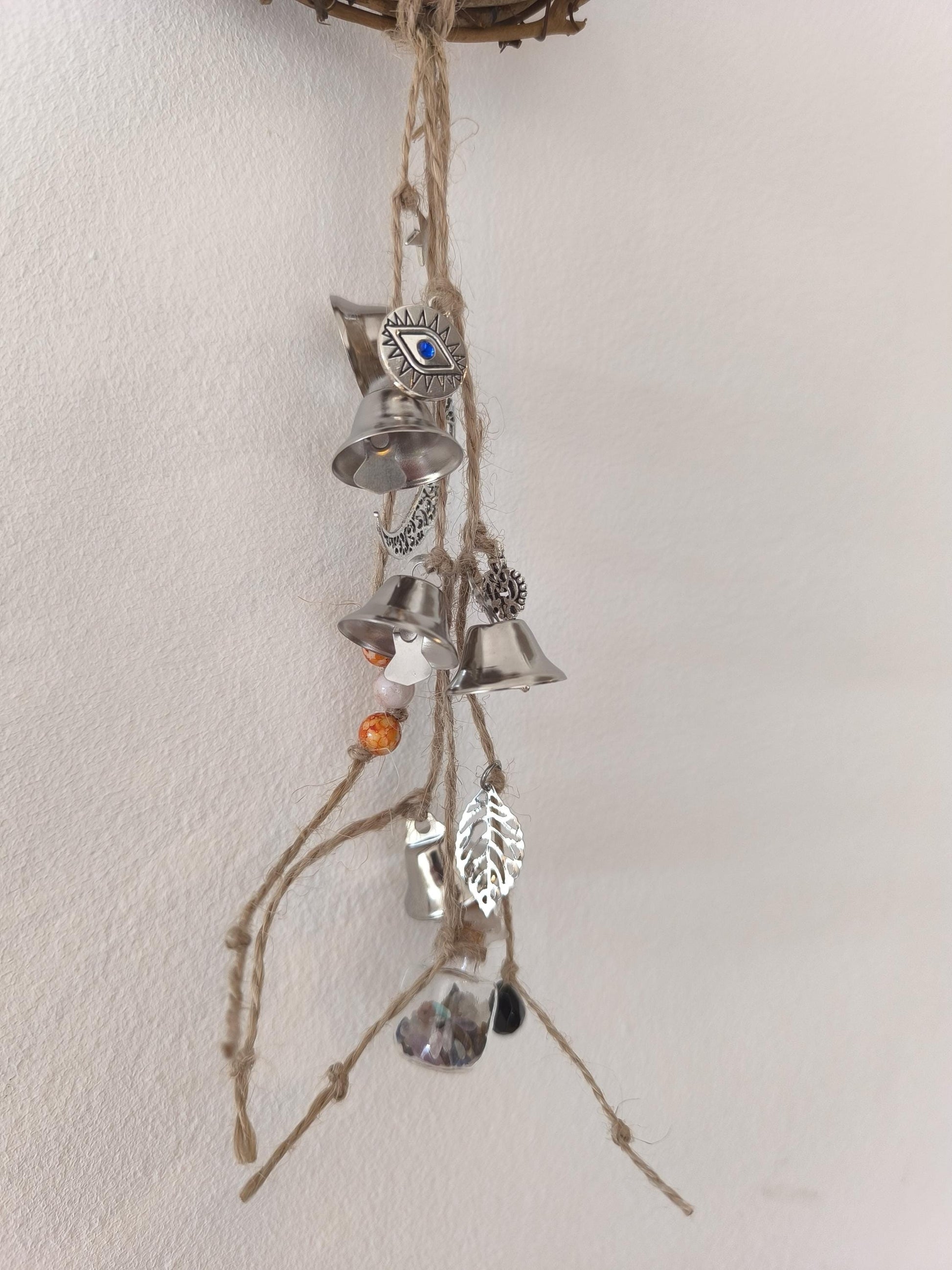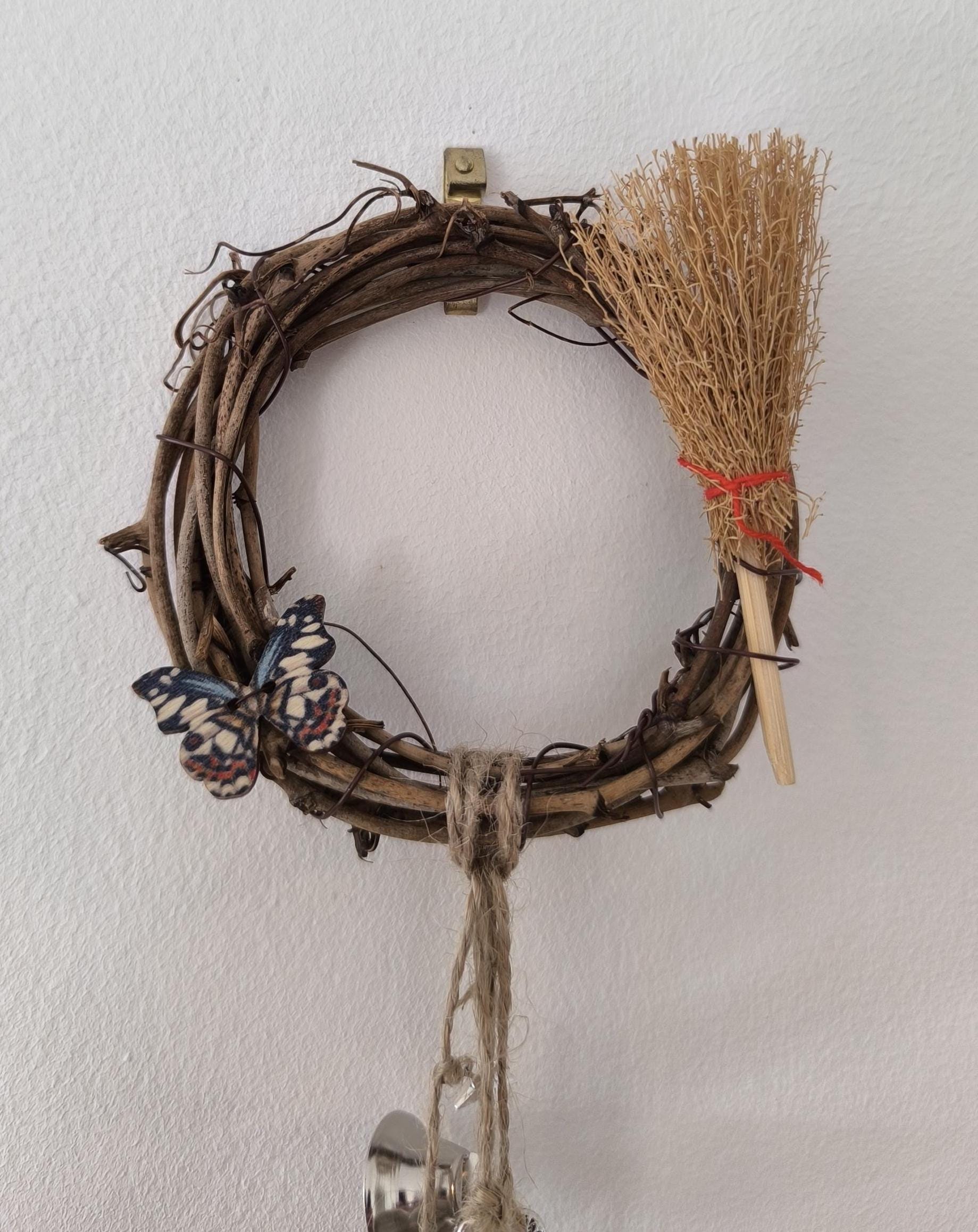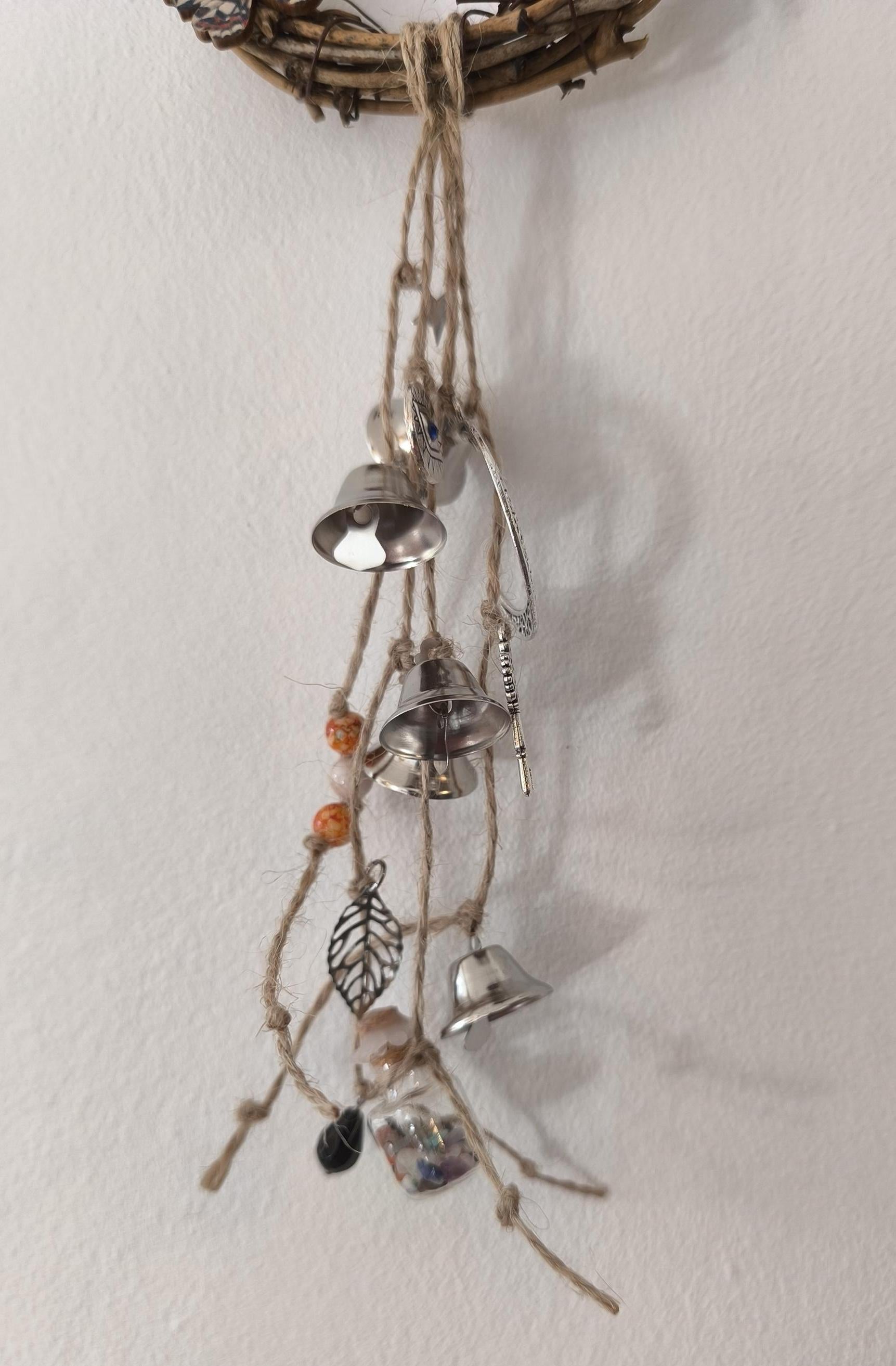 Cloche de sorcière décorative en sarments de vigne, agrémentée d'une cloche, de grelots, d'une clé, de perles colorées, d'une lune, d'une étoile, d'un papillon en bois, d'un petit balai, d'une véritable perle d'obsidienne et d'une fiole en verre contenant de petits minéraux.