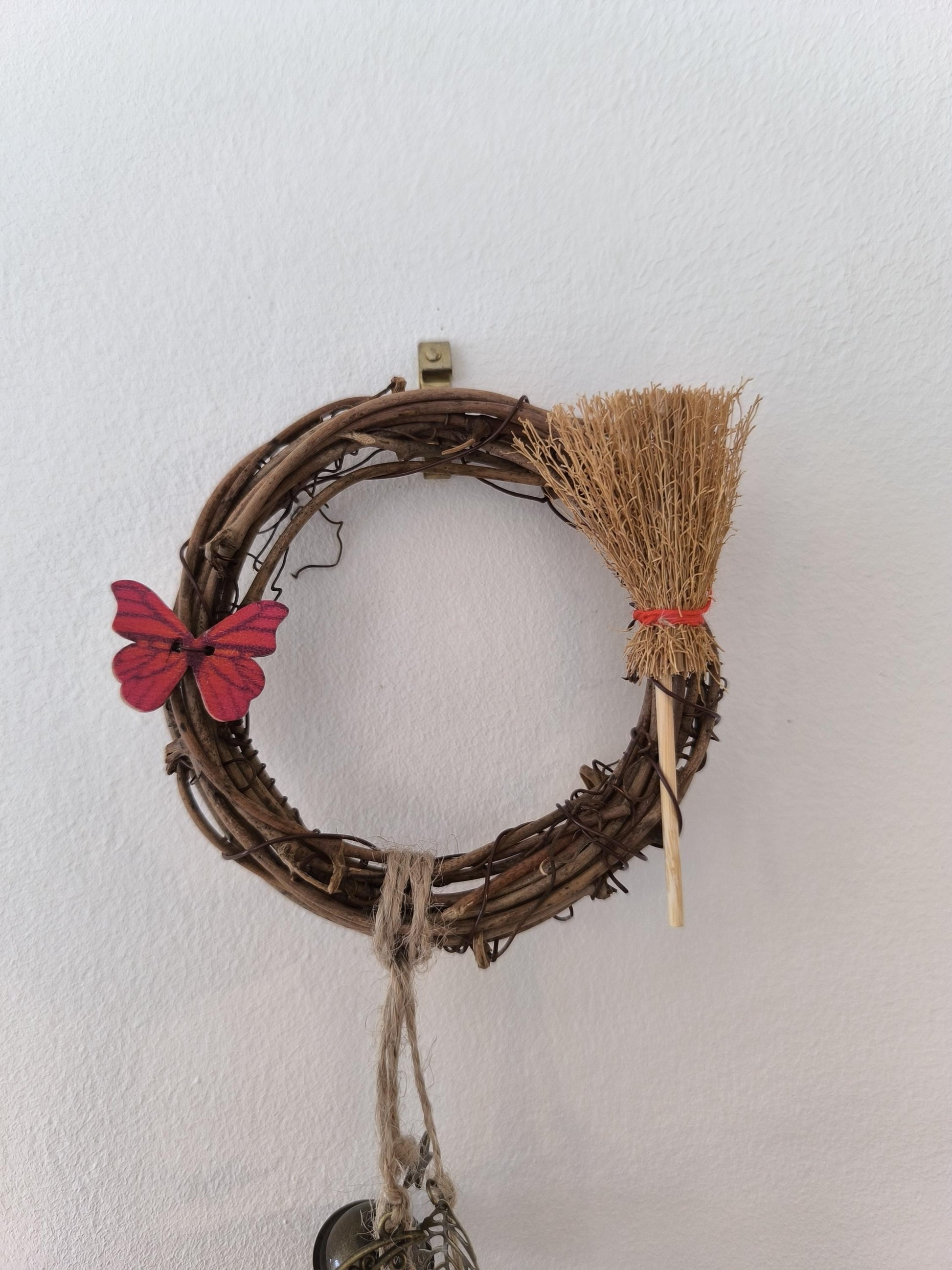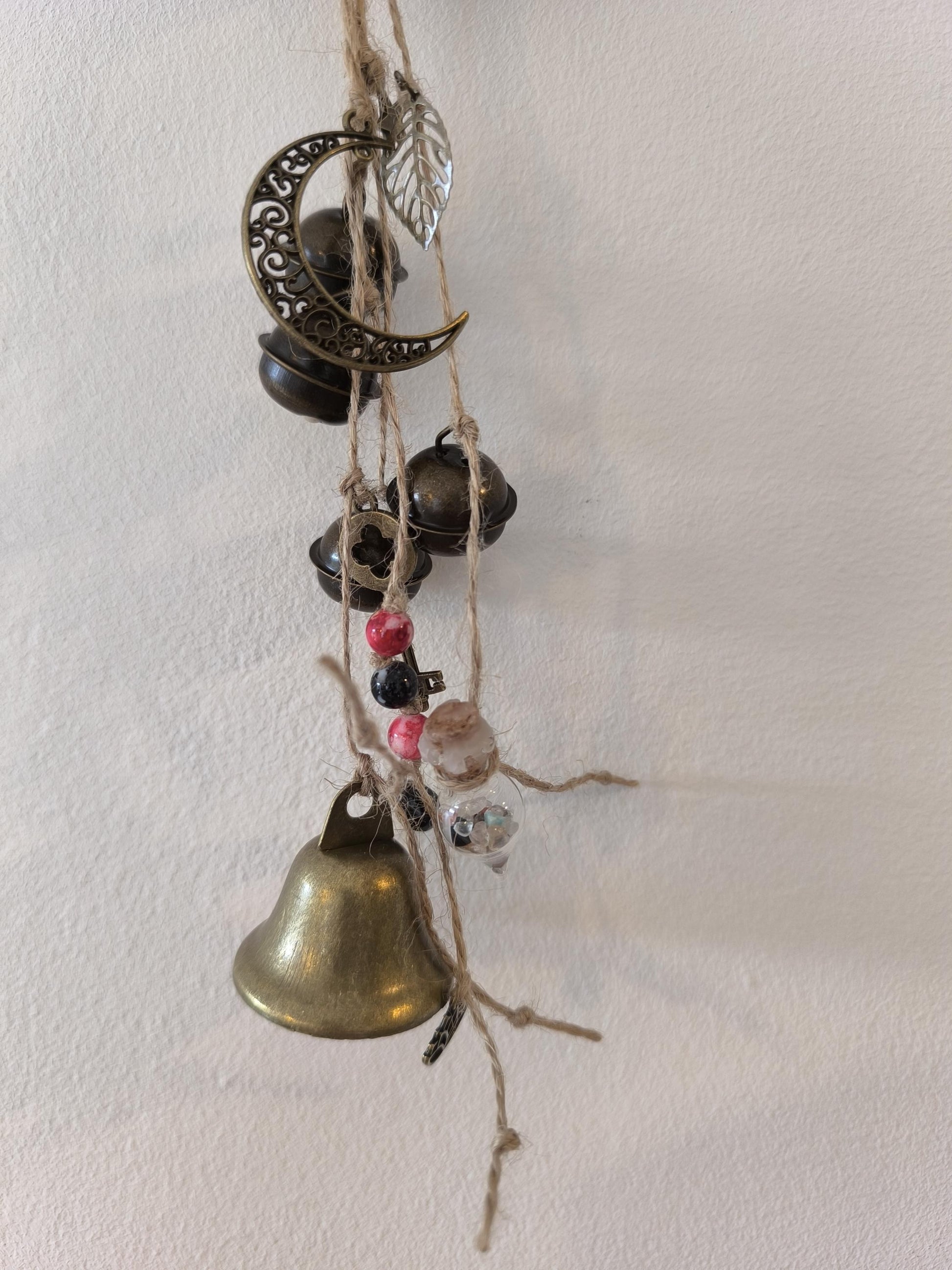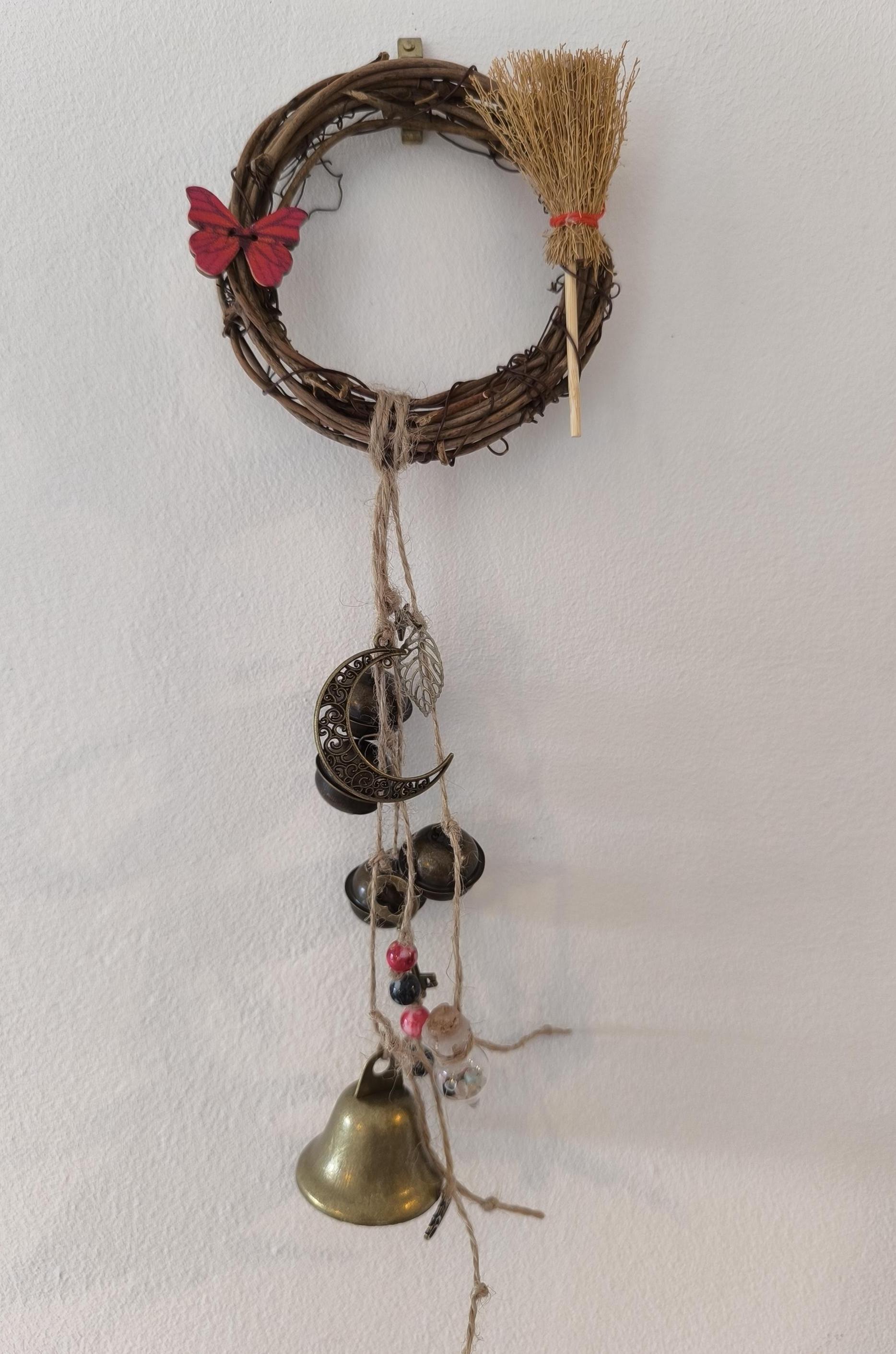 Cloche de sorcière décorative en sarments de vigne, agrémentée d'une cloche, de grelots, d'une clé, de perles colorées dont une en obsidienne, d'une lune, d'une étoile, d'un papillon en bois, d'une breloque feuille, d'une breloque lotus, d'un petit balai et d'une fiole en verre contenant de petits minéraux.