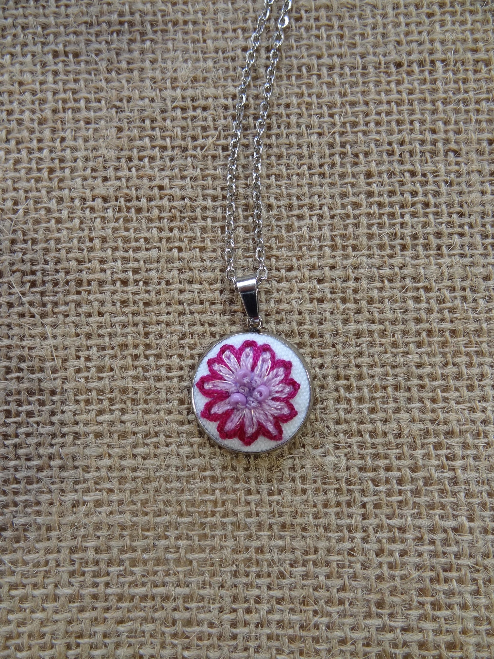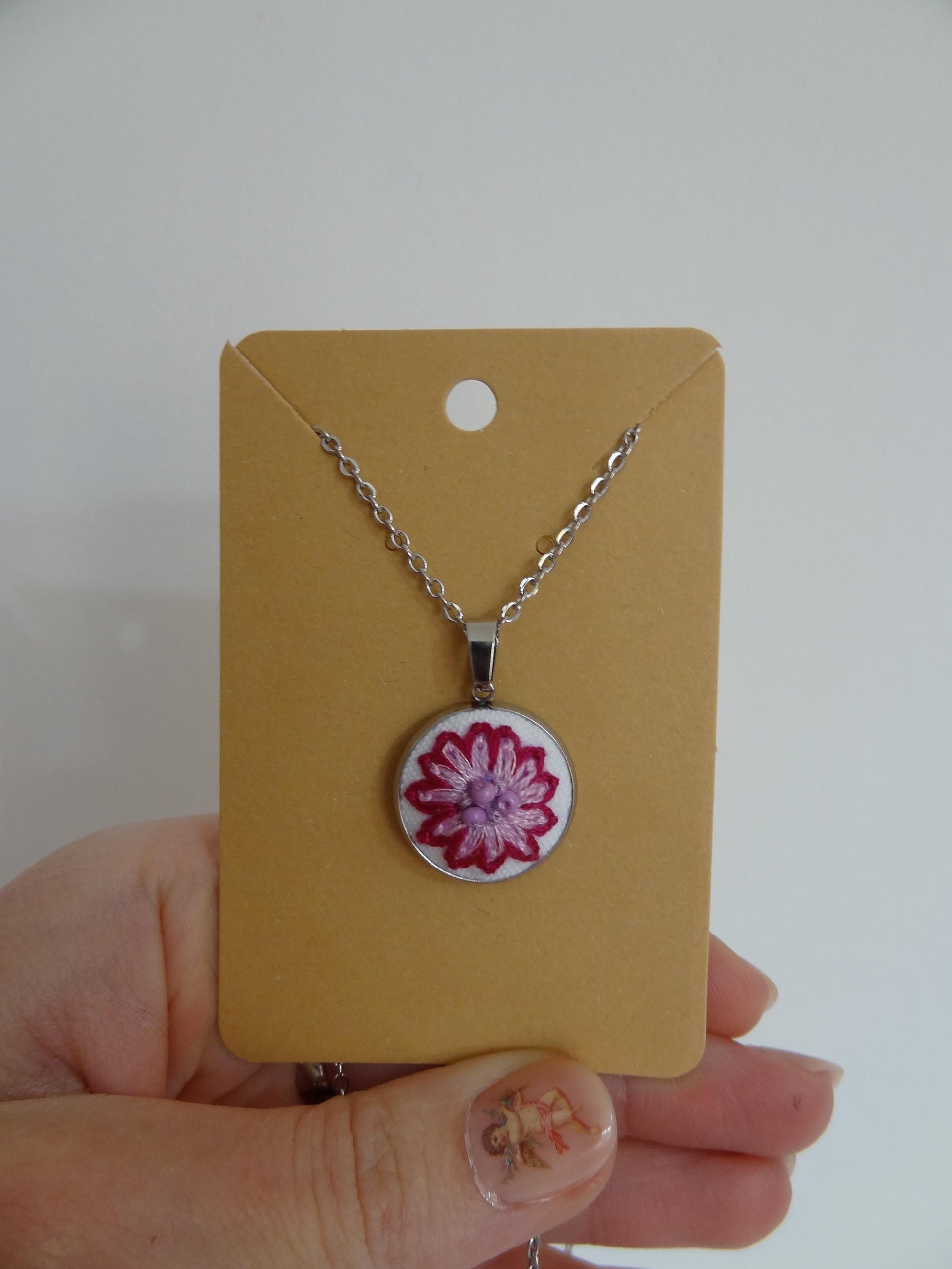 Parfait Chaos vous propose ce délicat collier avec un pendentif brodé à la main.