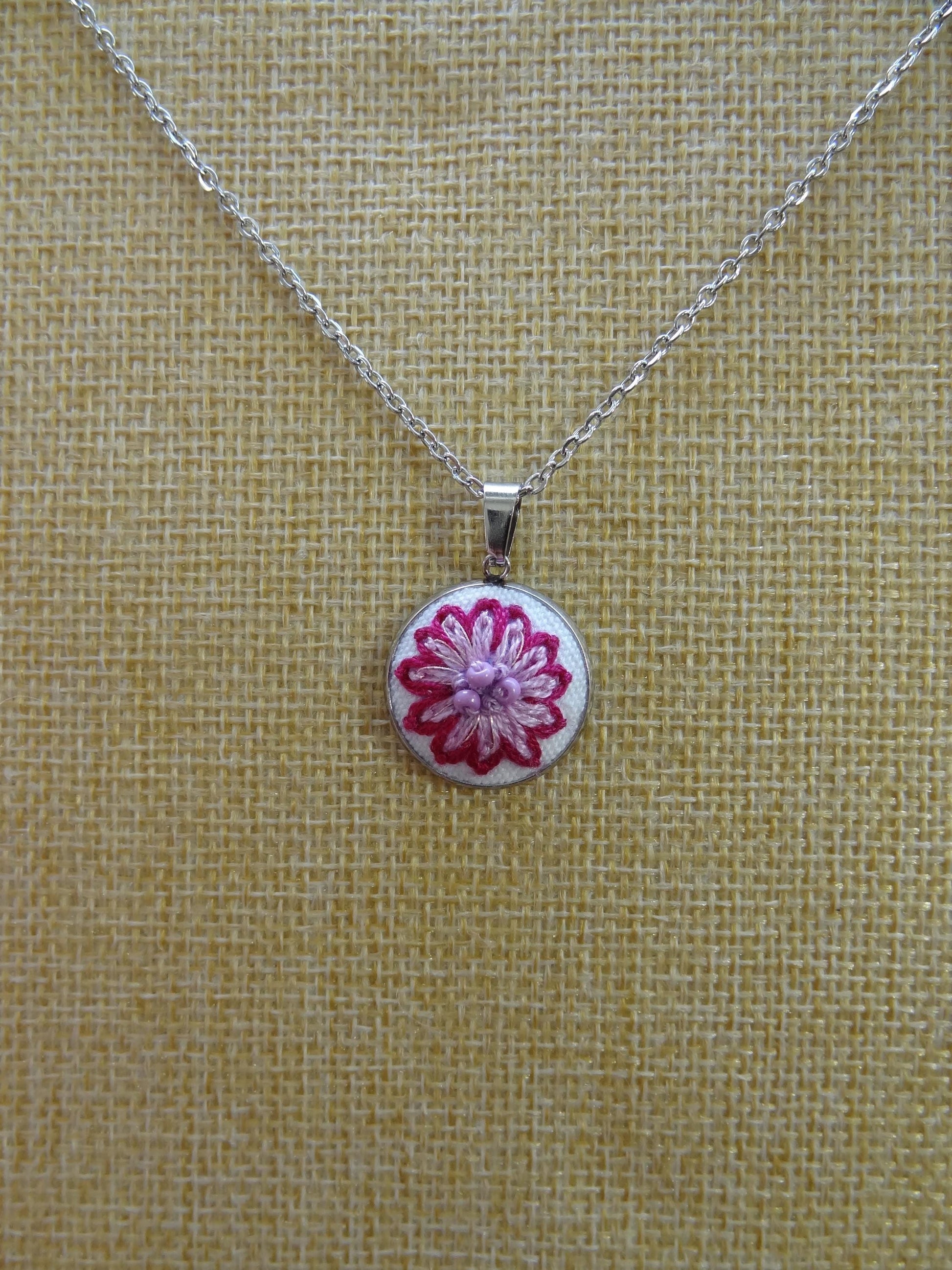Collier brodé à la main, broderie moderne, Fleur rose perlée