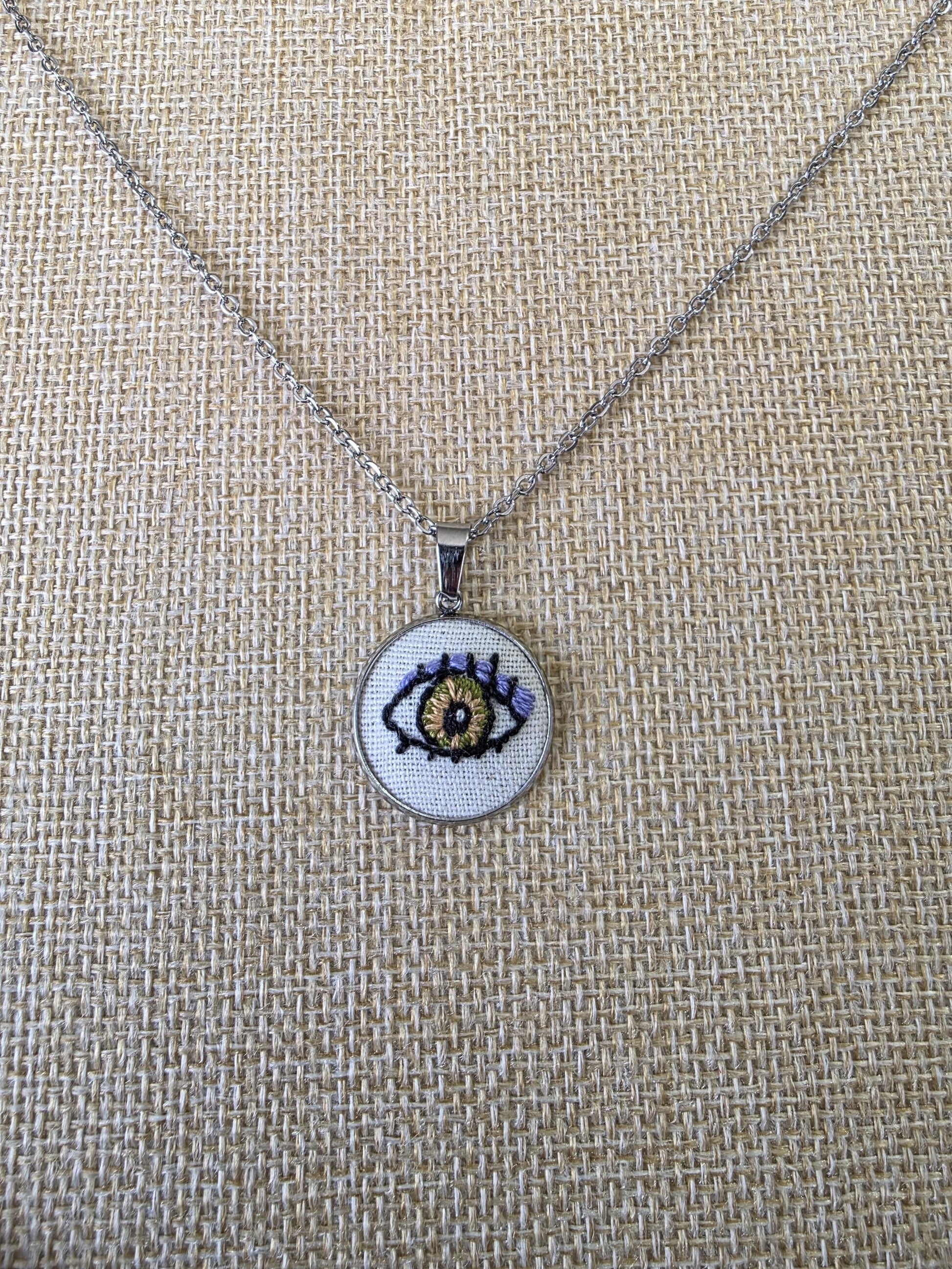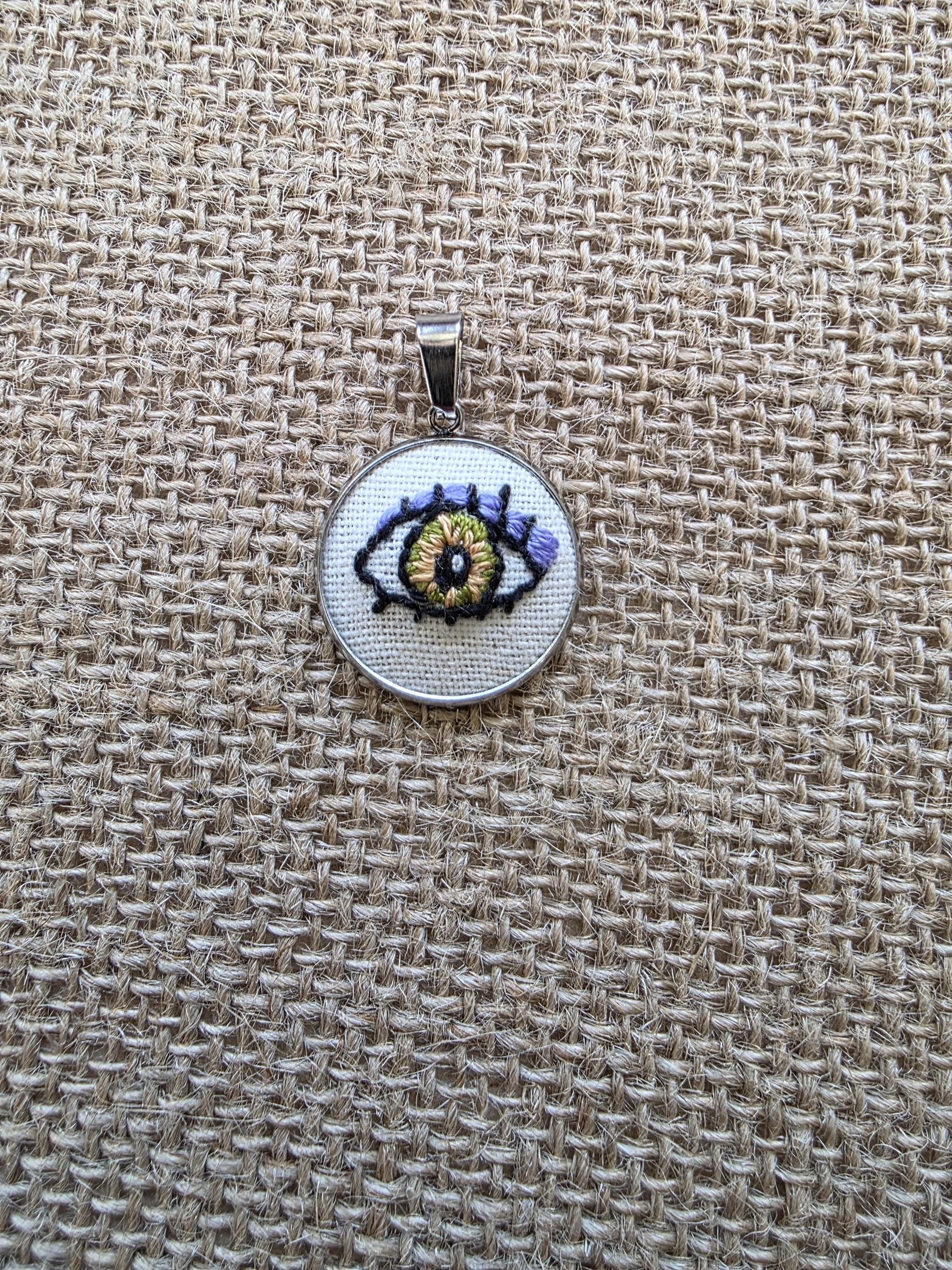 Collier brodé à la main, broderie moderne, Œil vert marron