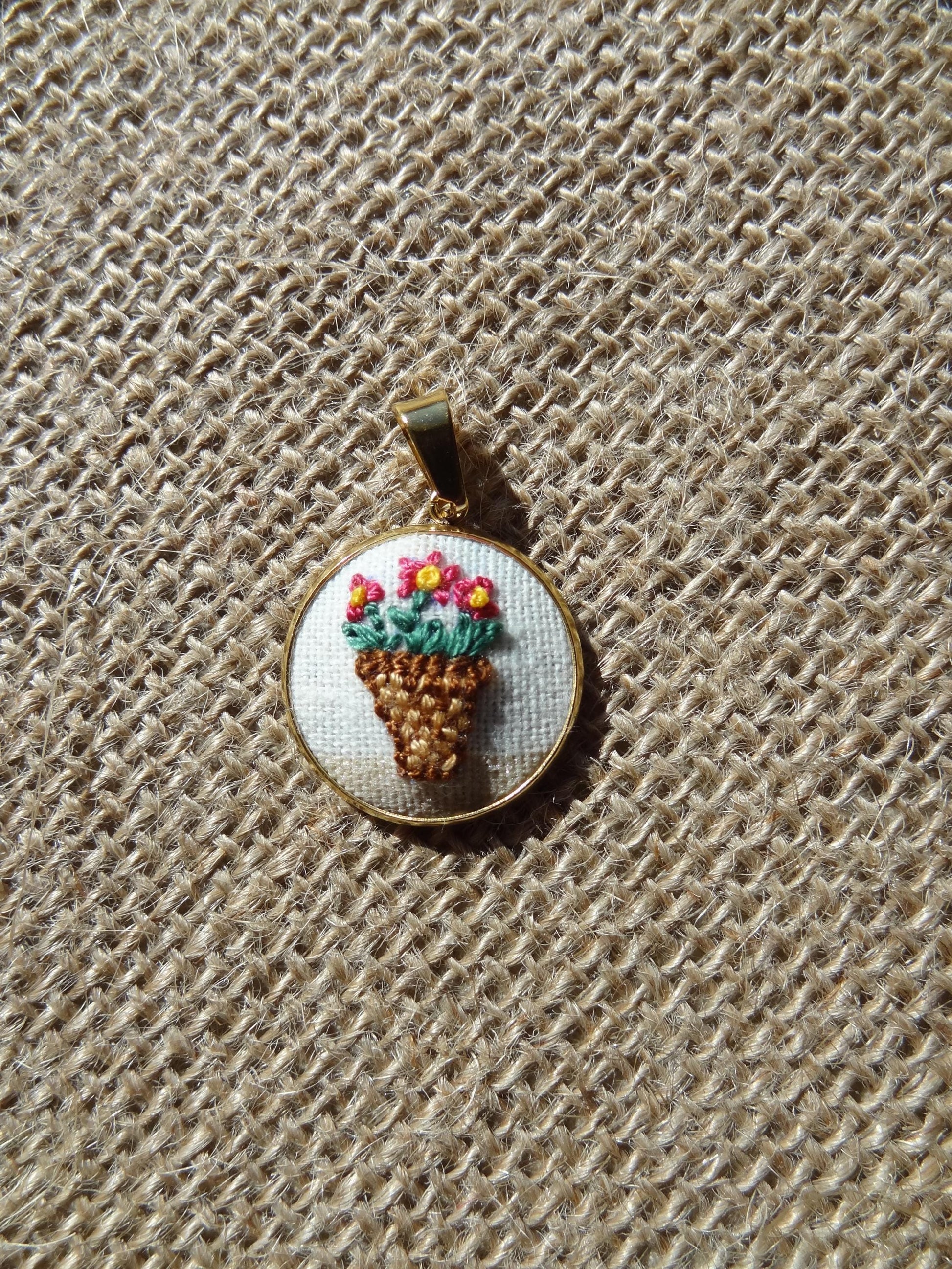 Collier brodé à la main, broderie moderne, Pot de fleurs