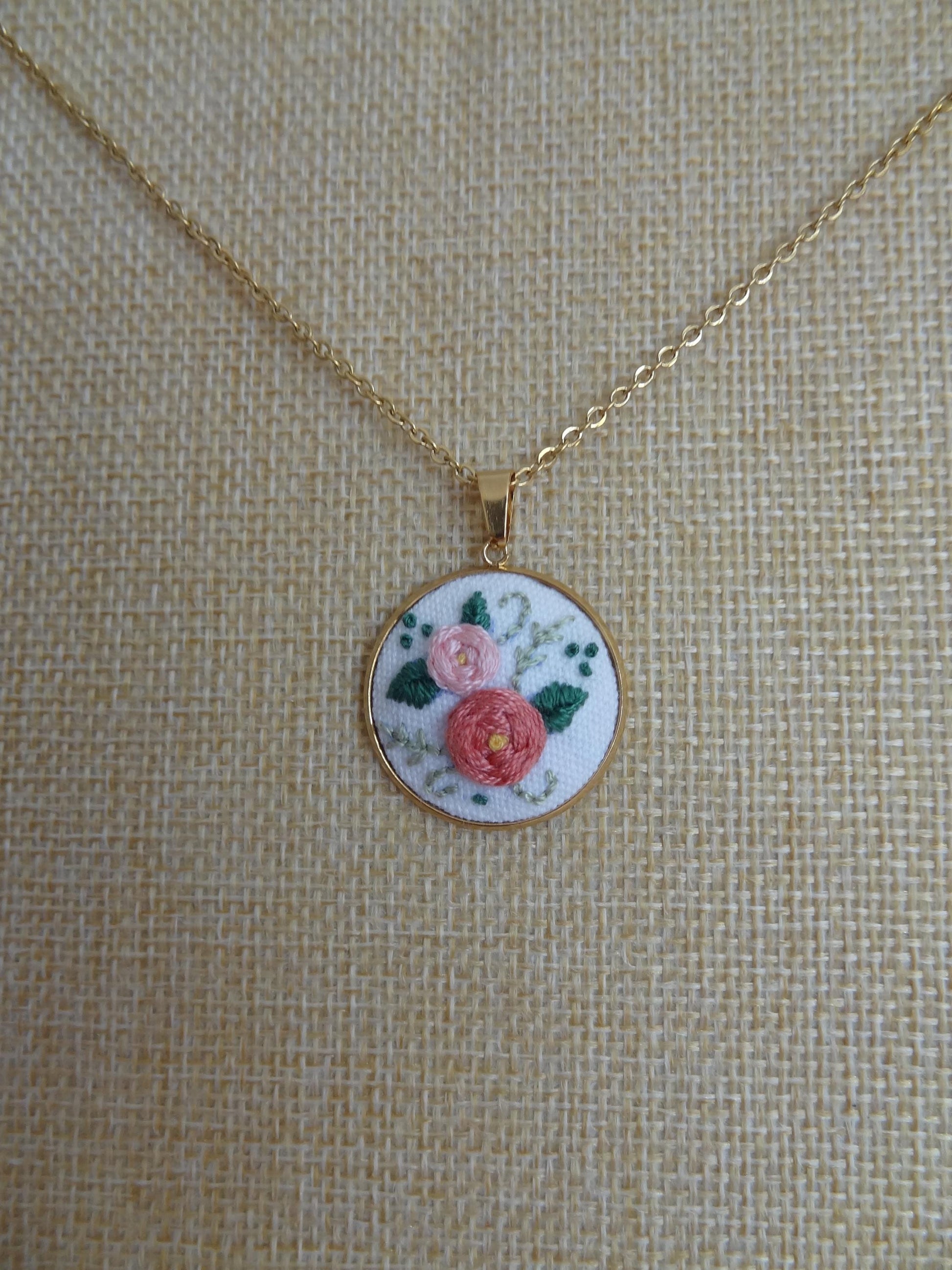 Collier brodé à la main, broderie moderne, Roses