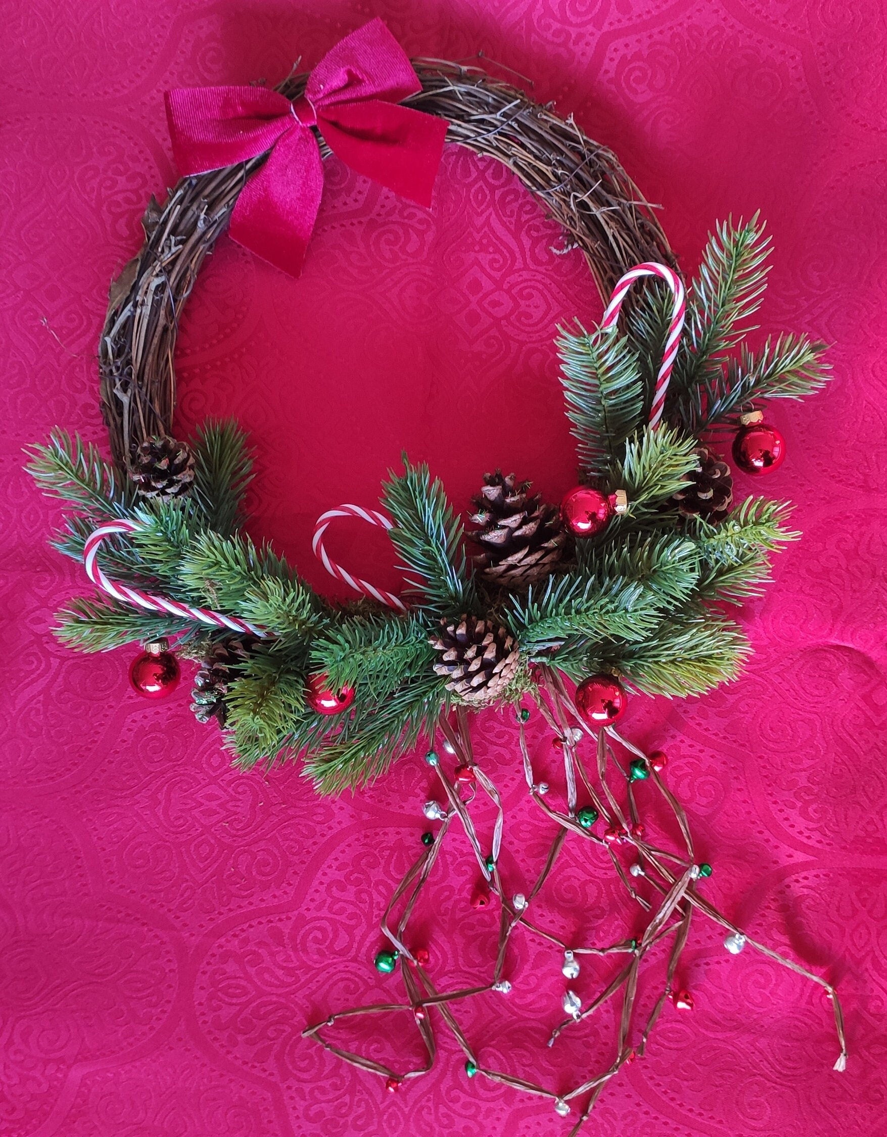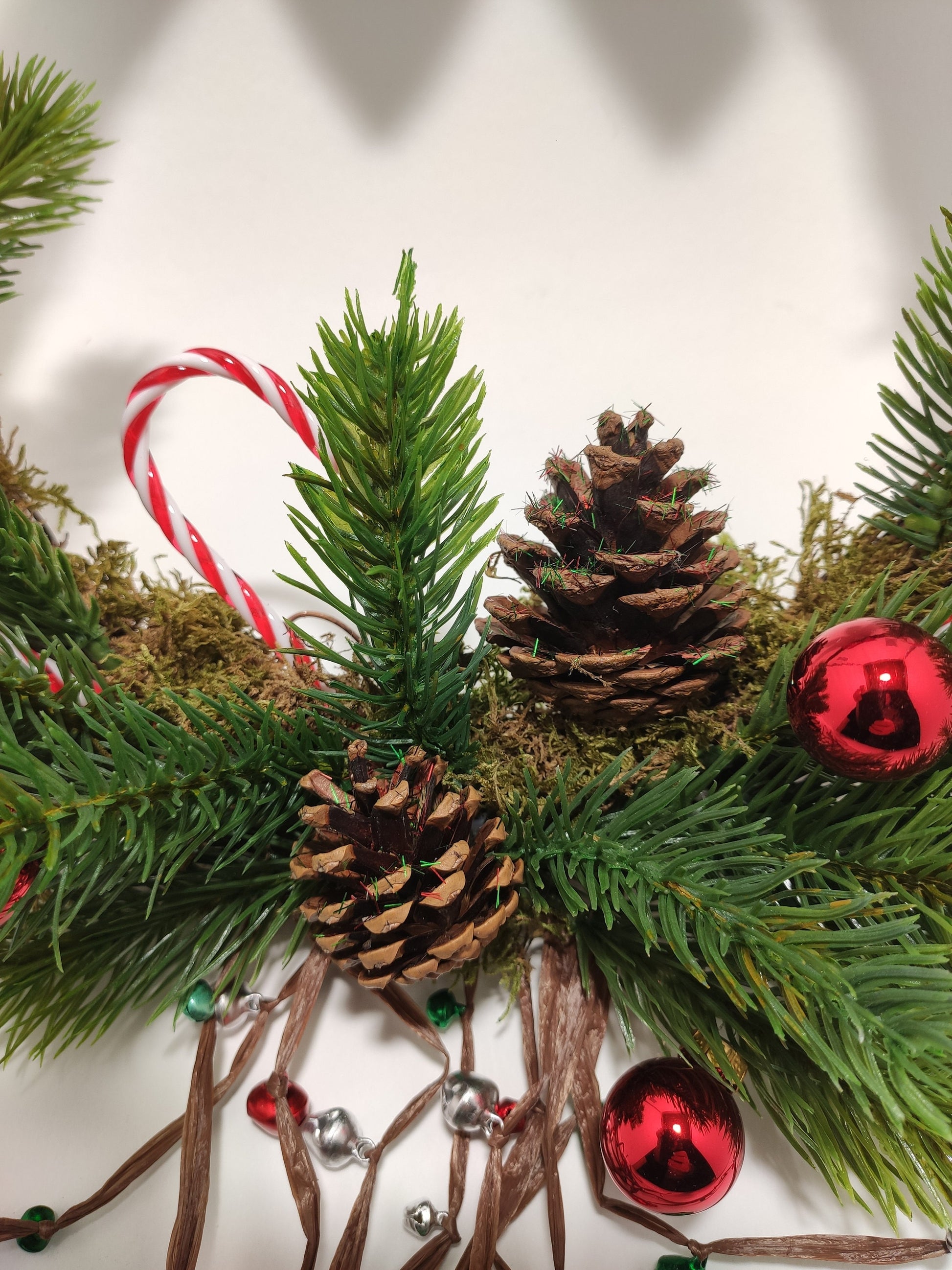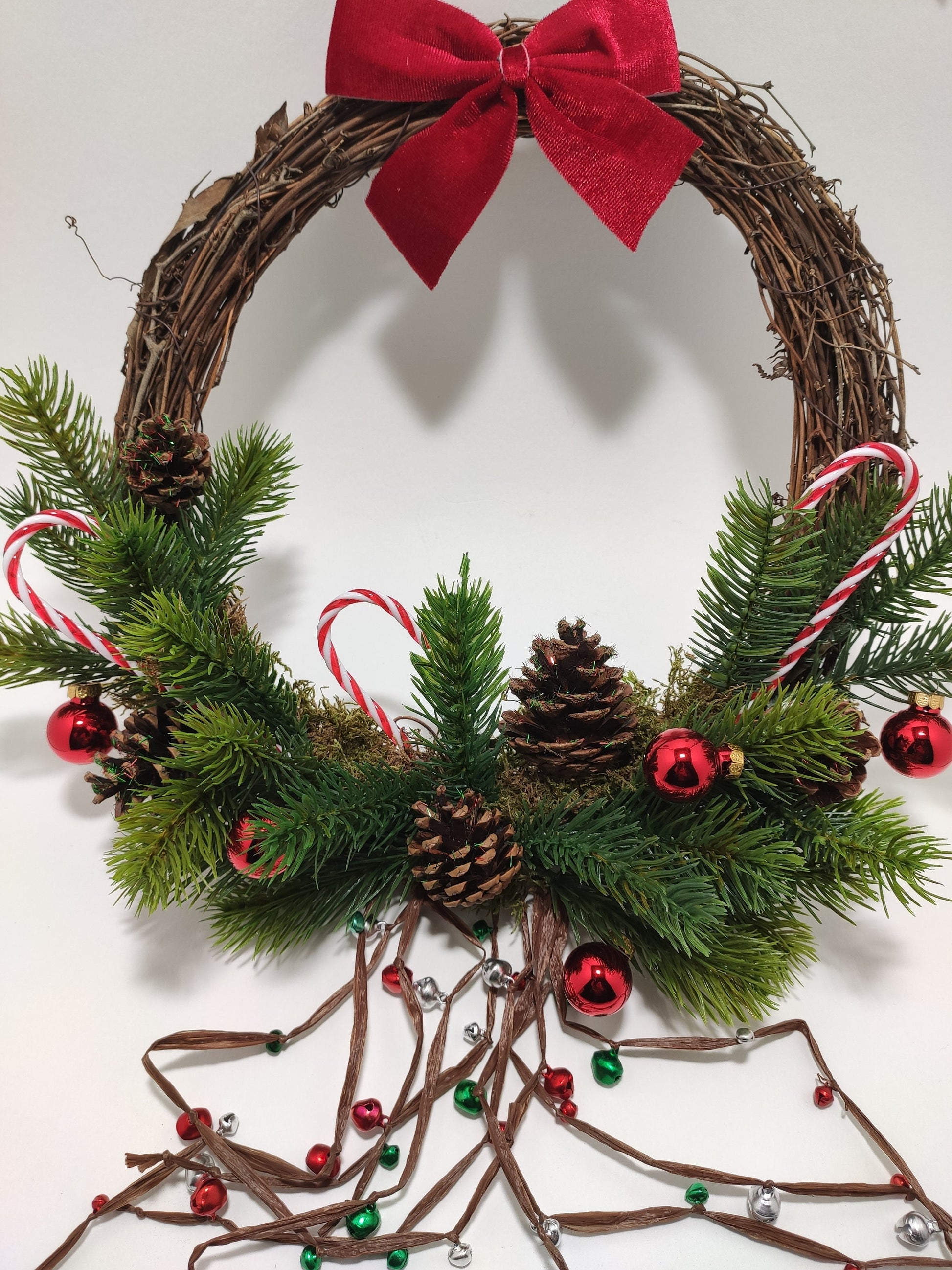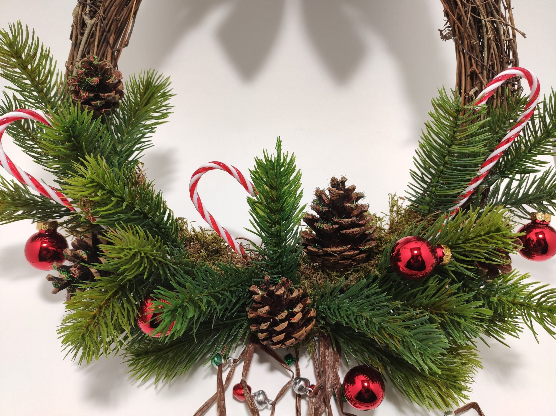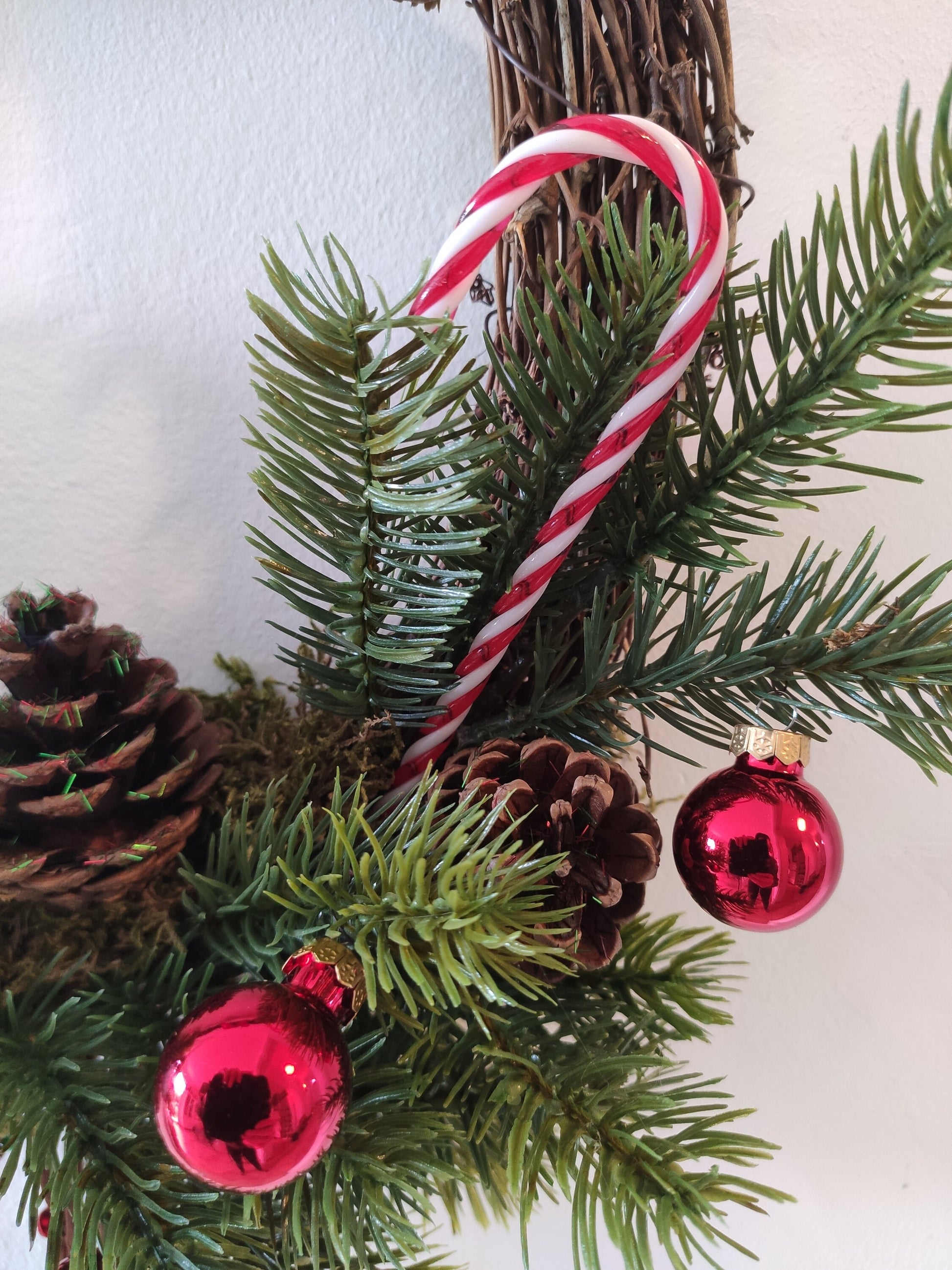 Couronne décorative en sarments de vigne, composée d'éléments naturels (pommes de pin, mousse séchée) de végétaux artificiels pour plus de tenue dans le temps (sapin), de sucres d'orge en plastique et de boules de Noël rouges. Le haut de la couronne est agrémenté d'un gros nœud rouge. Le bas de la couronne est lui orné de raphia synthétique sur lequel sont accrochés des petits grelots aux couleurs de Noël.