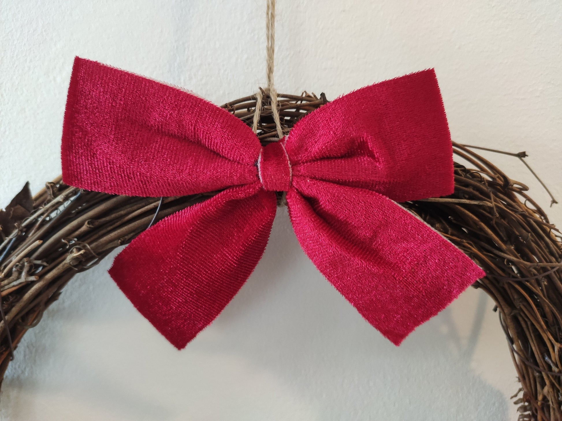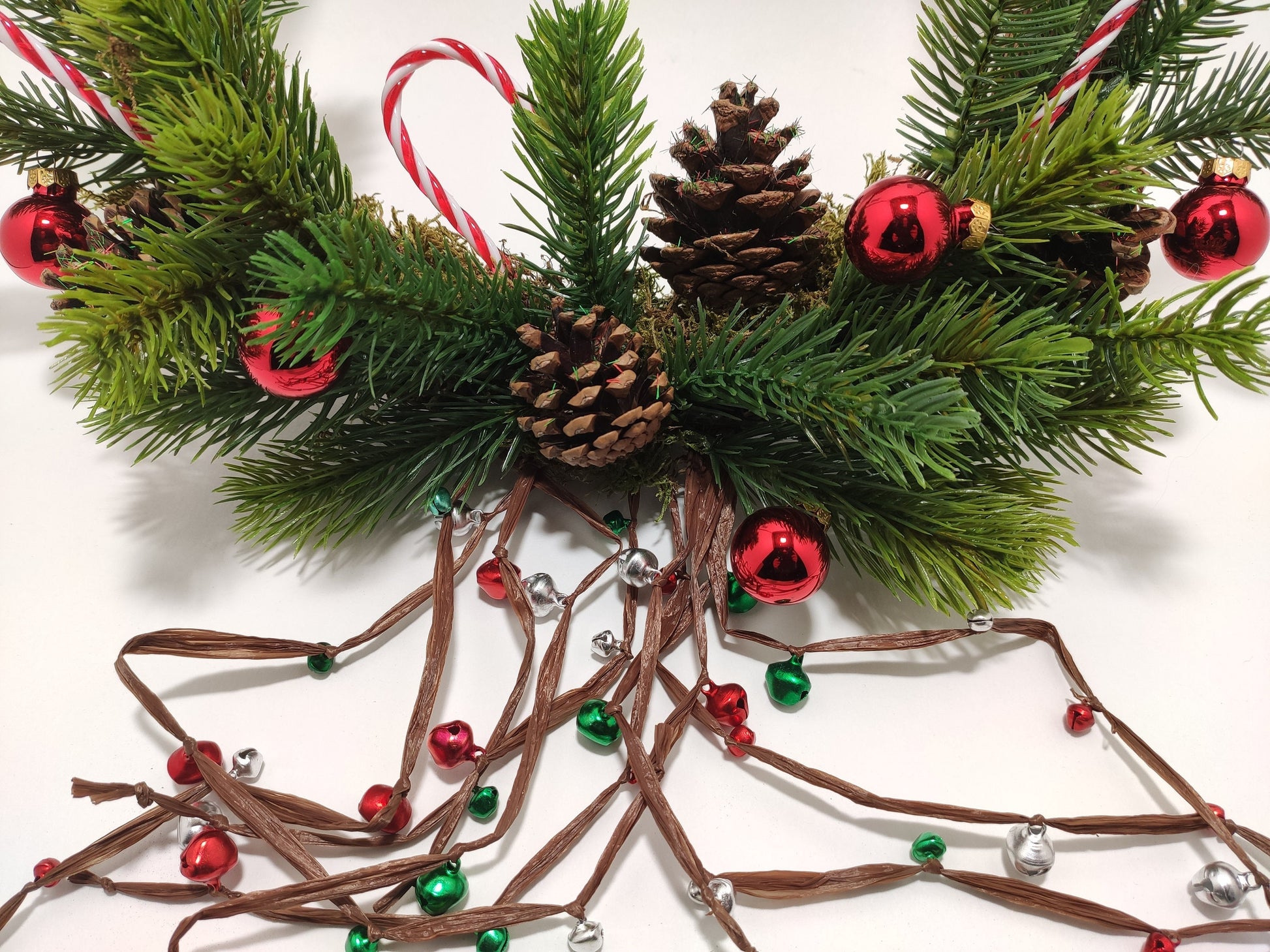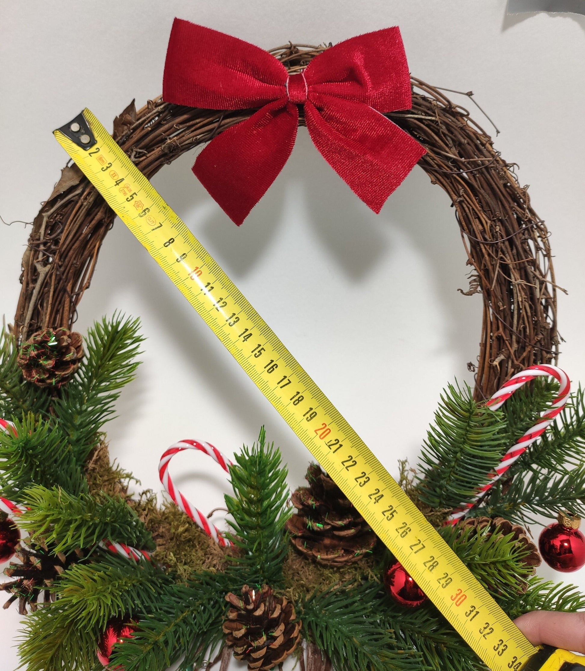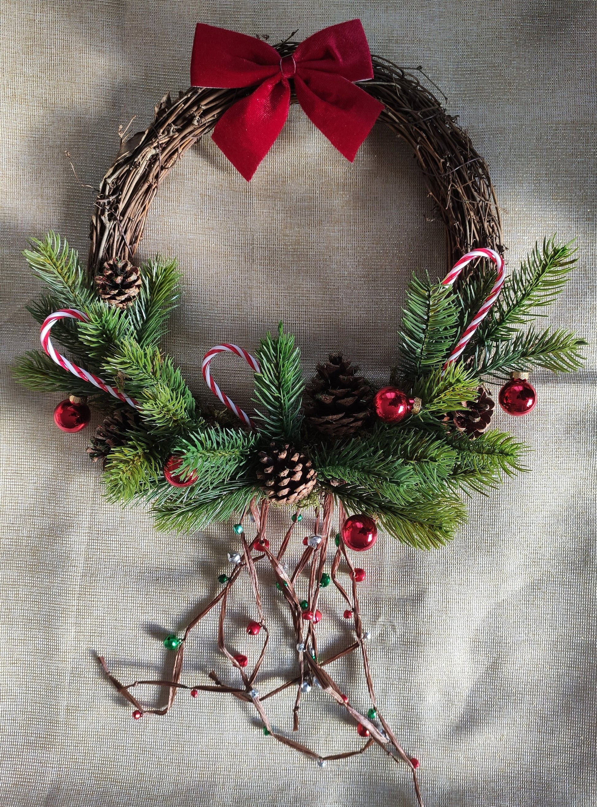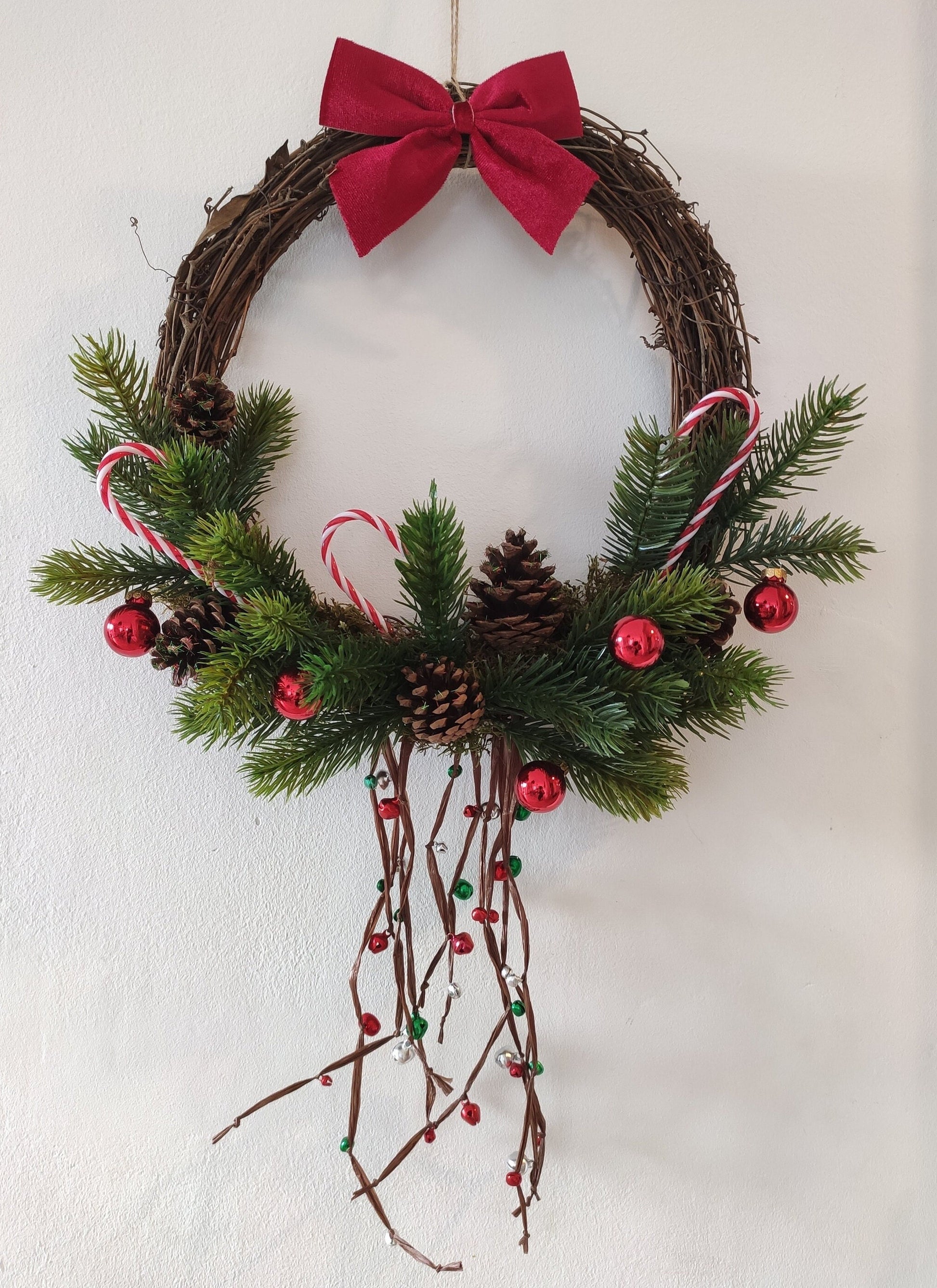 Couronne décorative en sarments de vigne, composée d'éléments naturels (pommes de pin, mousse séchée) de végétaux artificiels pour plus de tenue dans le temps (sapin), de sucres d'orge en plastique et de boules de Noël rouges. Le haut de la couronne est agrémenté d'un gros nœud rouge. Le bas de la couronne est lui orné de raphia synthétique sur lequel sont accrochés des petits grelots aux couleurs de Noël.