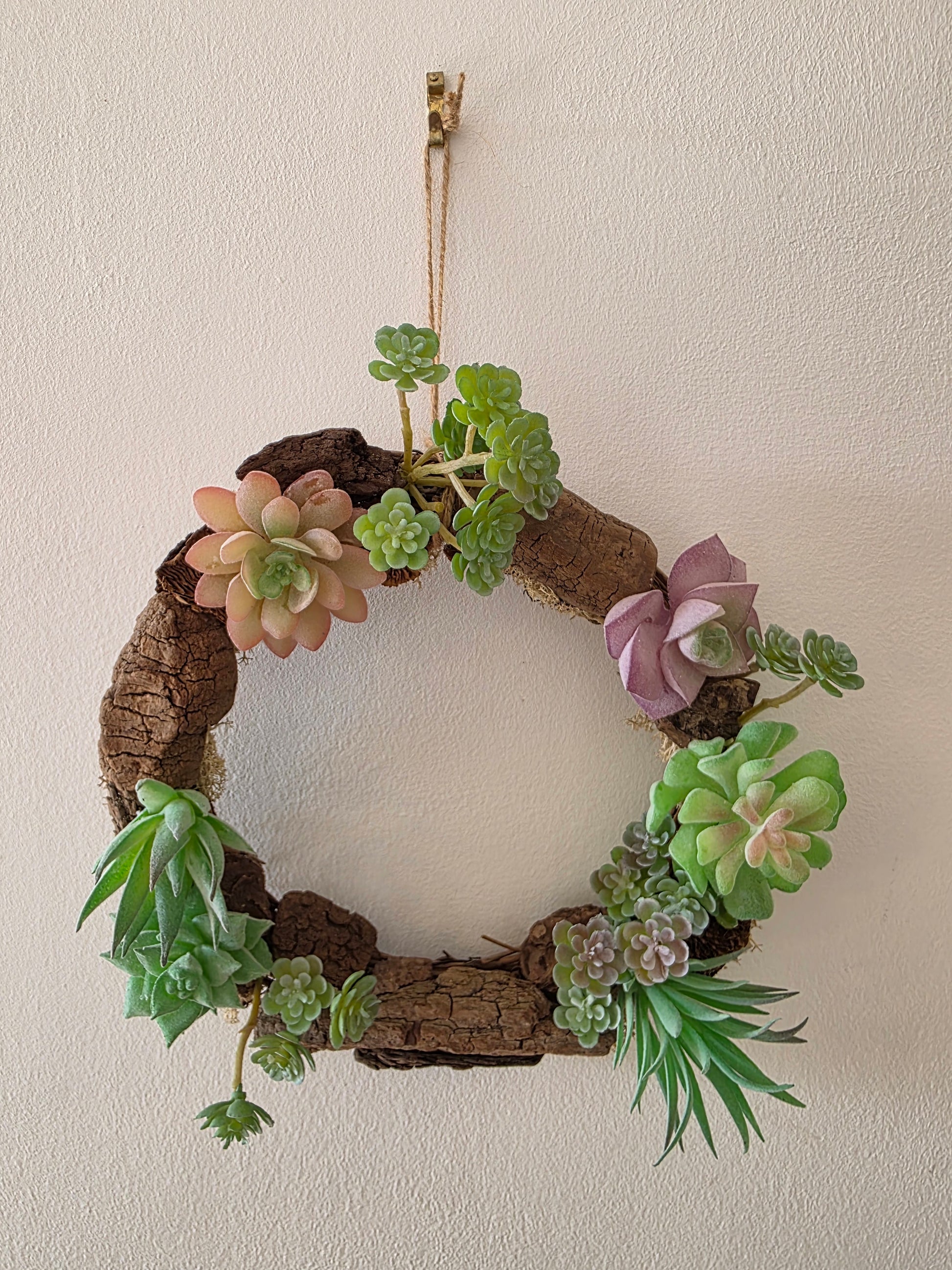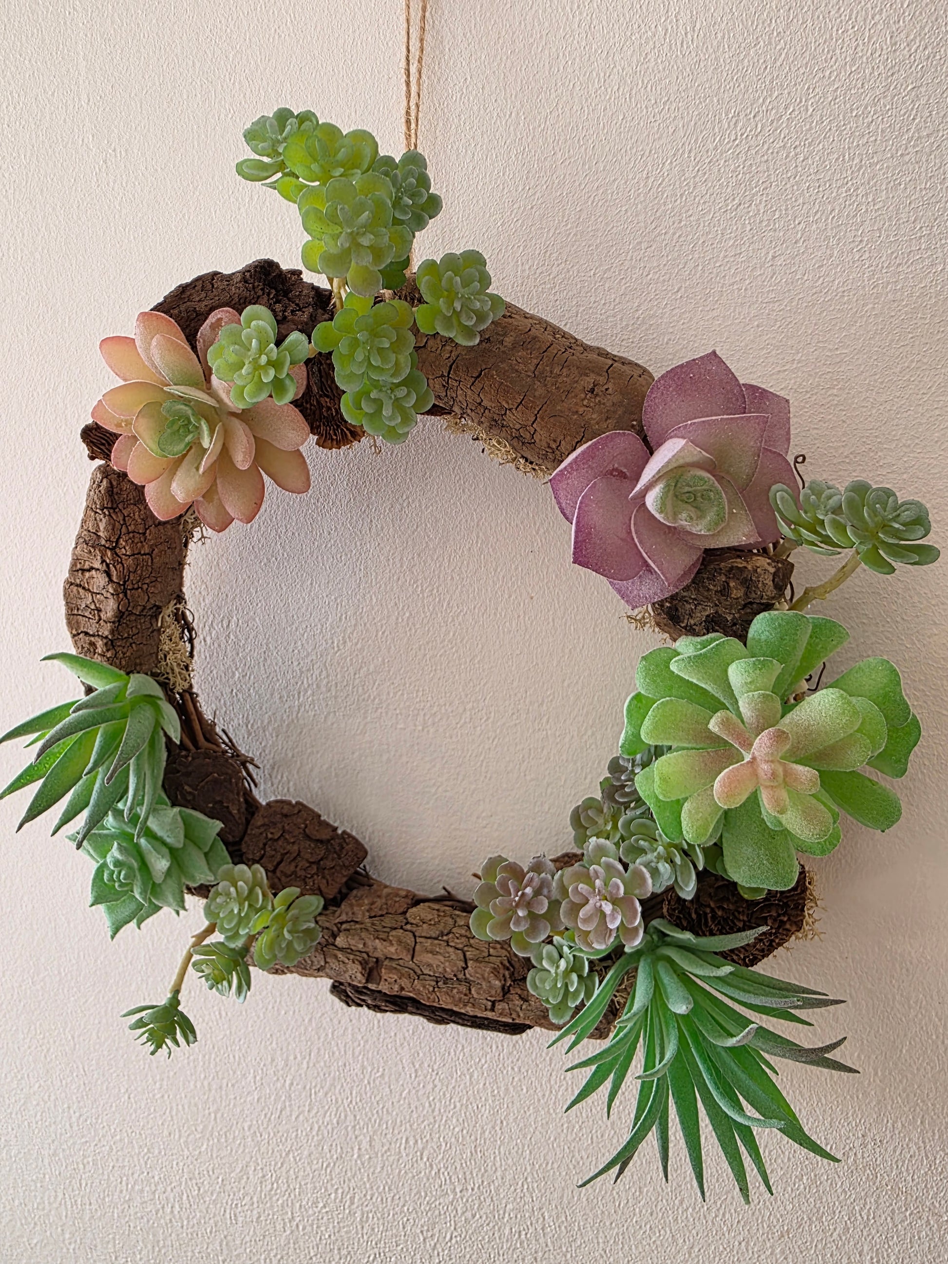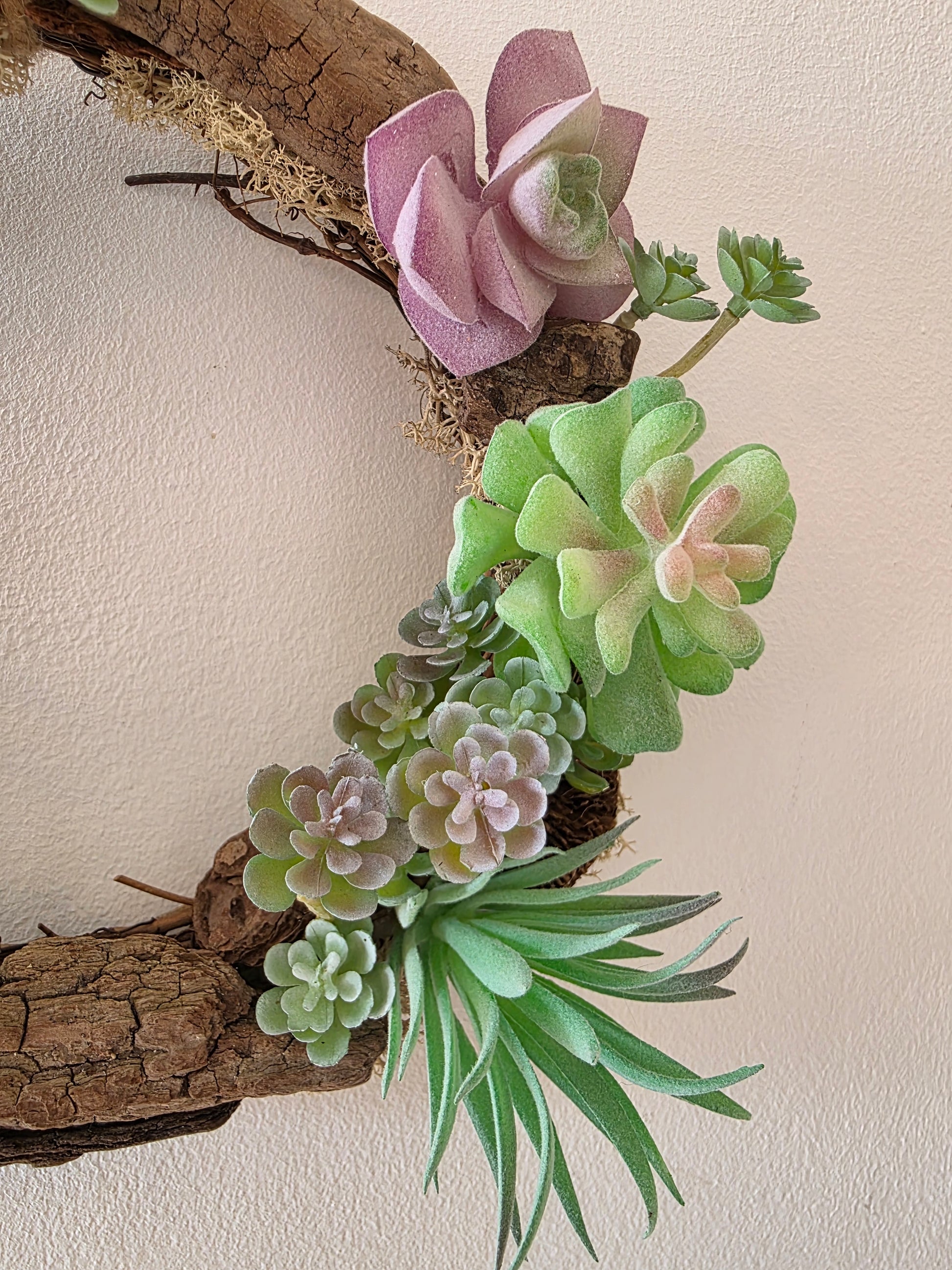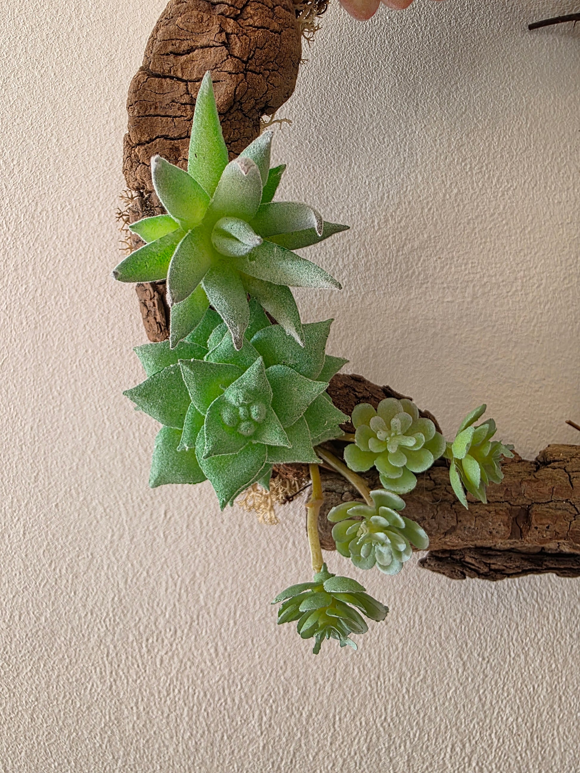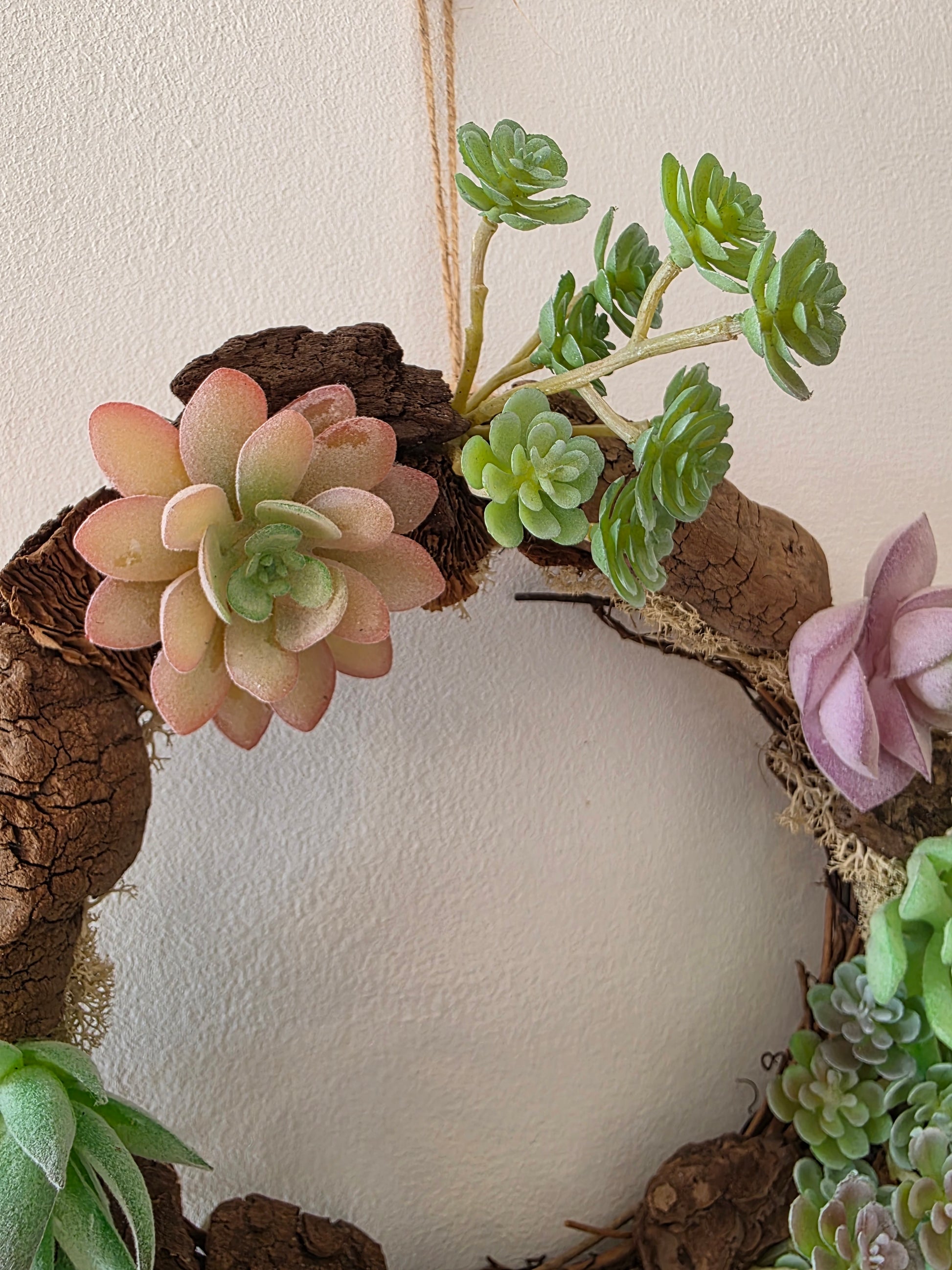 Avec ses succulentes artificielles soigneusement disposées et ses éléments naturels, cette couronne évoque un petit monde minéral et vivant.