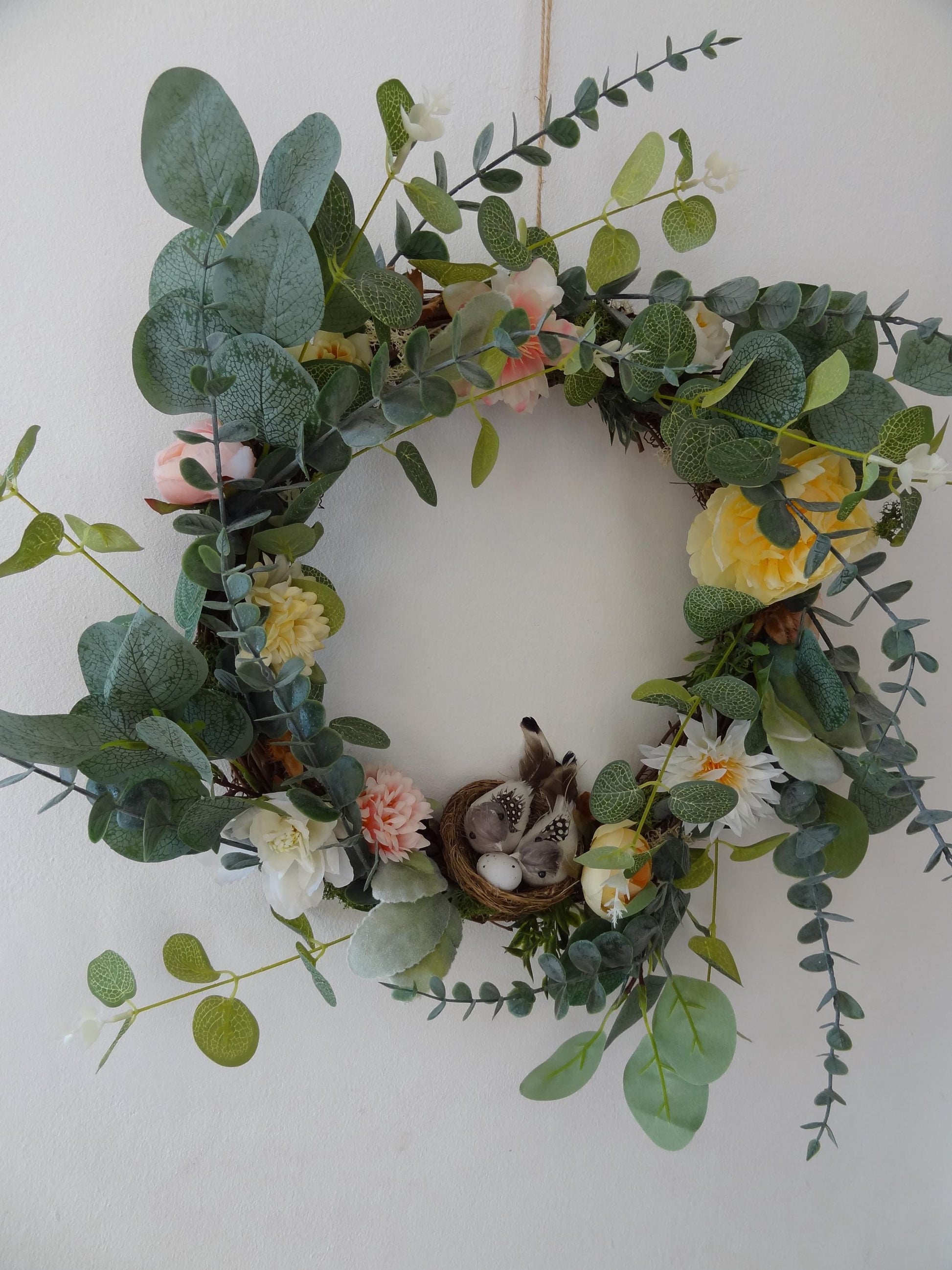 Couronne décorative en sarments de vigne, agrémentée de végétaux artificiels pour plus de tenue dans le temps (fleurs diverses, feuilles d'eucalyptus, ...), d'un petit nid d'oiseau et de lichen stabilisé. Le nid abrite deux oiseaux et un petit œuf artificiel.