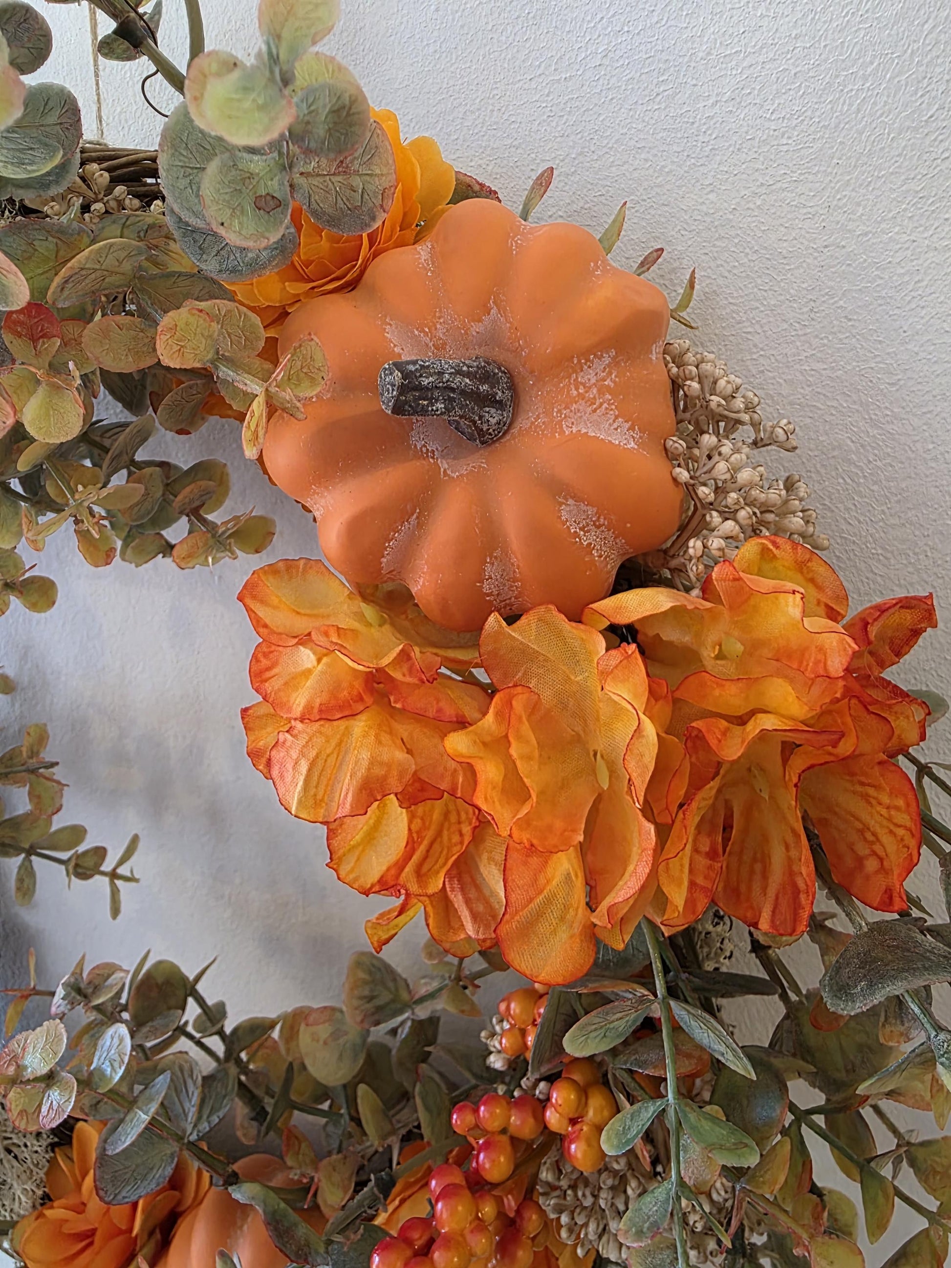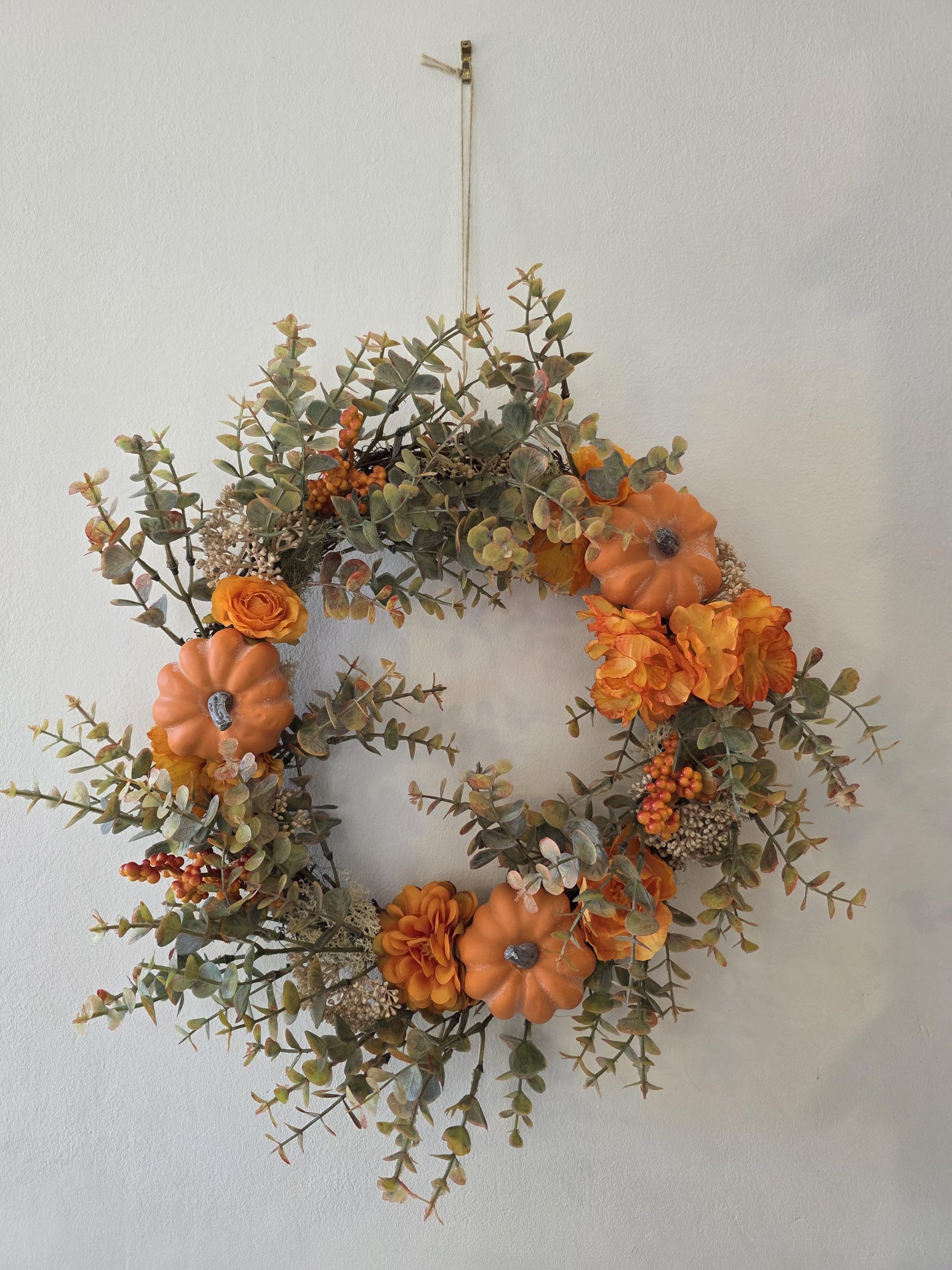 Apportez une touche de chaleur à votre intérieur avec la couronne Éclat d’Automne. Réalisée sur une base en sarment naturel, elle s’illumine de branches d’eucalyptus synthétiques aux nuances vertes et orangées, de baies lumineuses, de fleurs aux tons chaleureux et de petites citrouilles miniatures. Quelques touches de lichen stabilisé viennent parfaire cette création aux textures douces et naturelles.