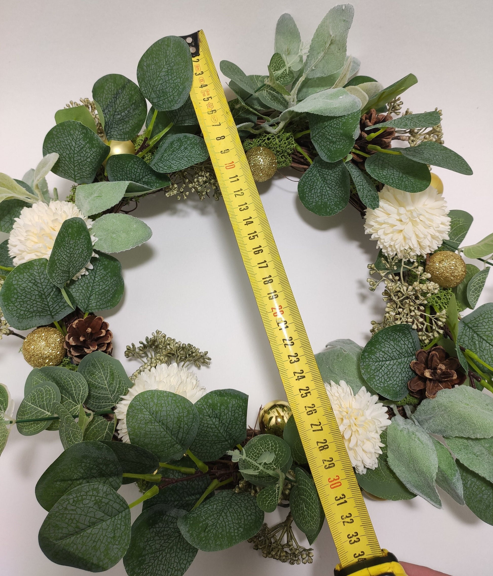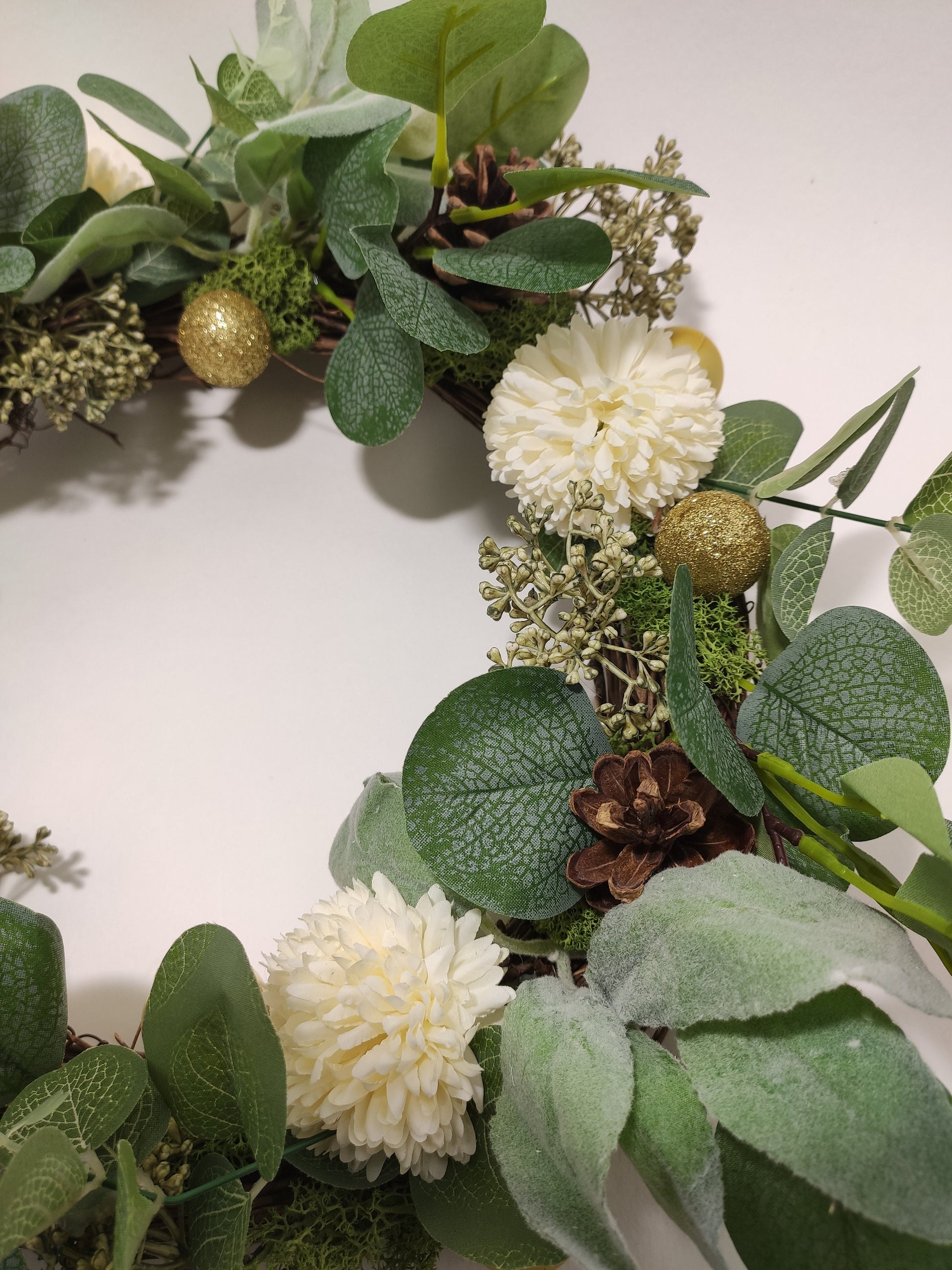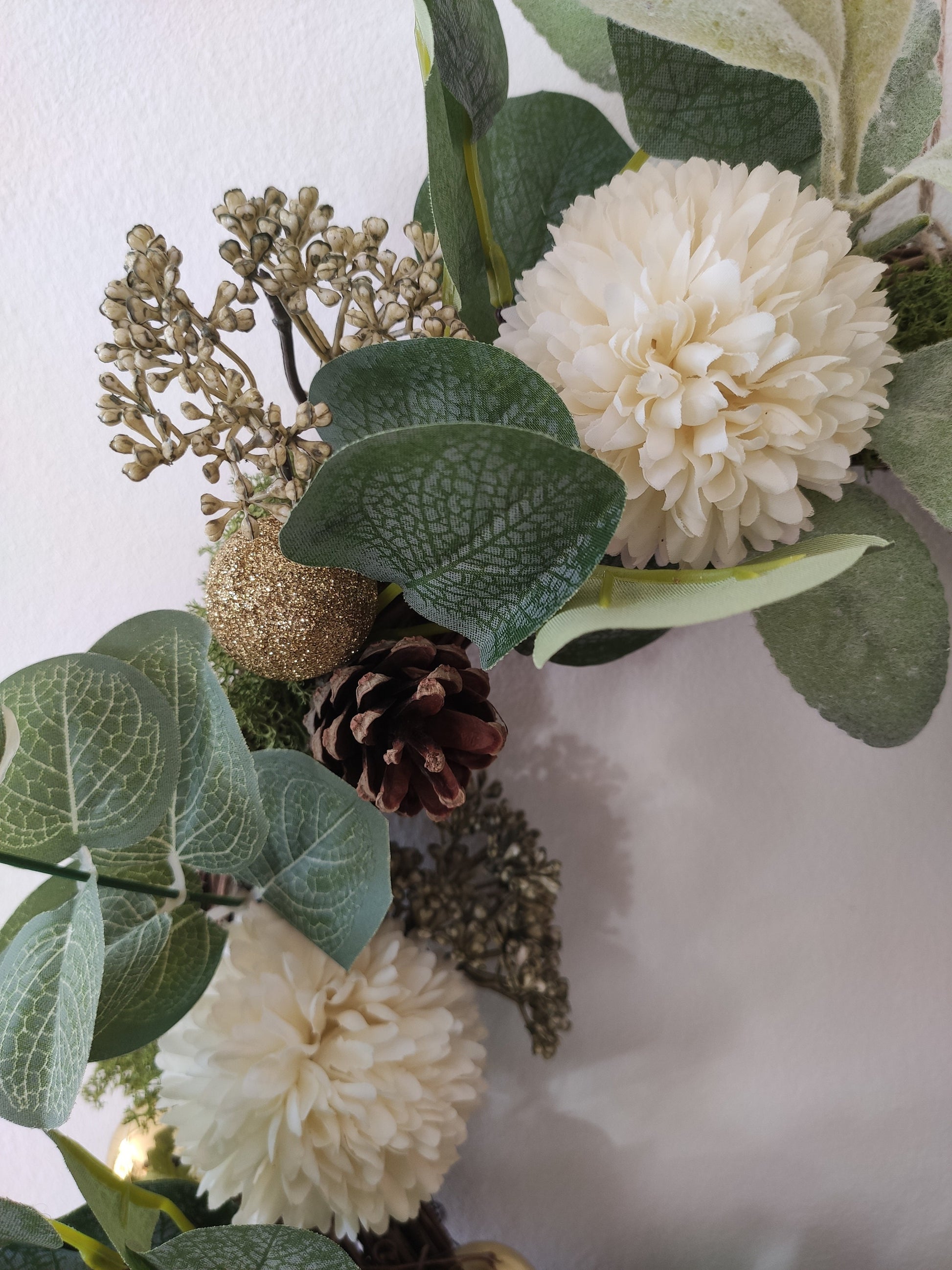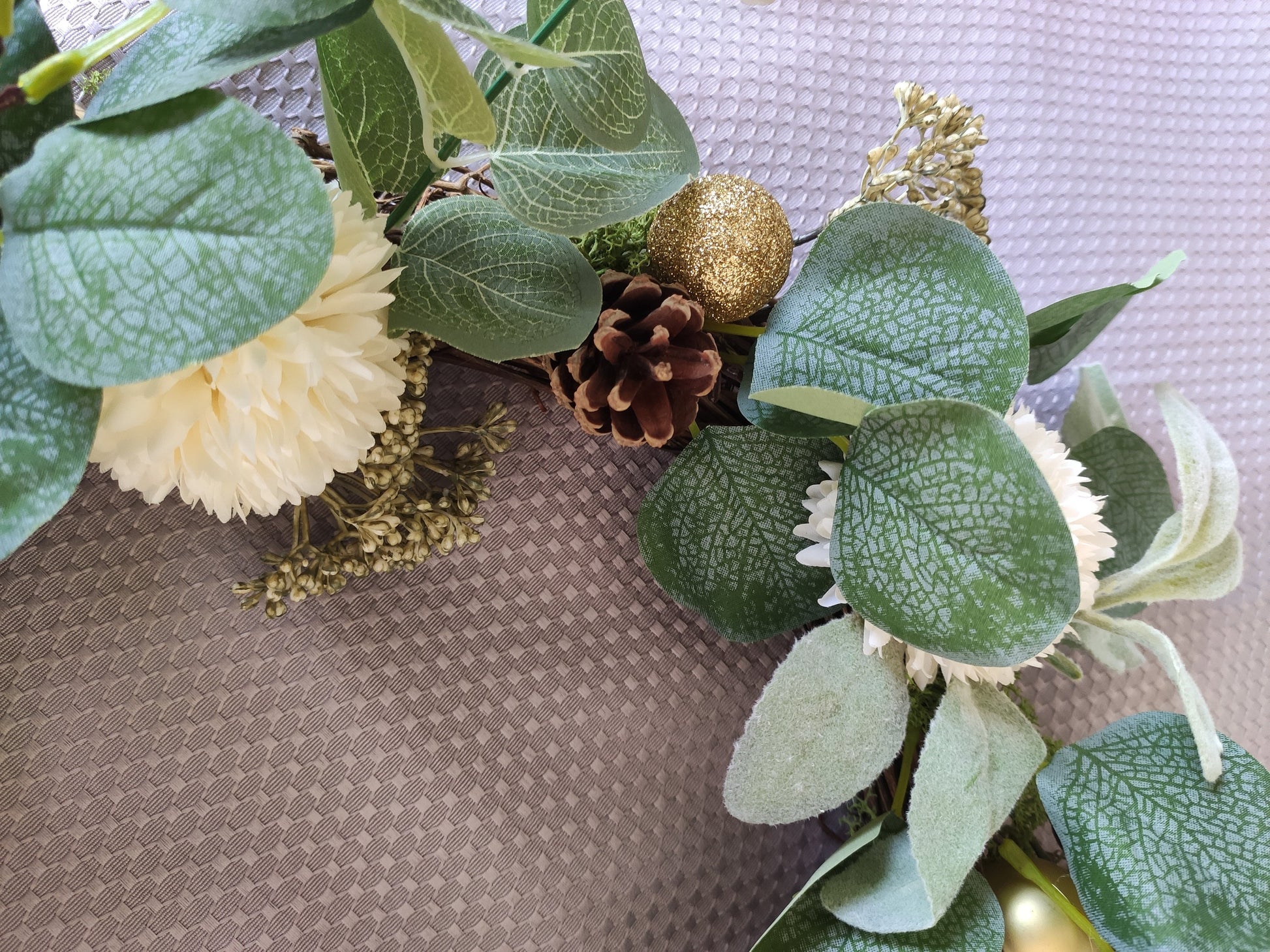 Avec cette couronne faites entrer l'esprit de Noël dans votre foyer. Avec ses couleurs classiques et intemporelles elle traversera les années avec charme. Elle sera d'ailleurs parfaite pour toutes saisons et toutes occasions (Mariage, baptême,...)