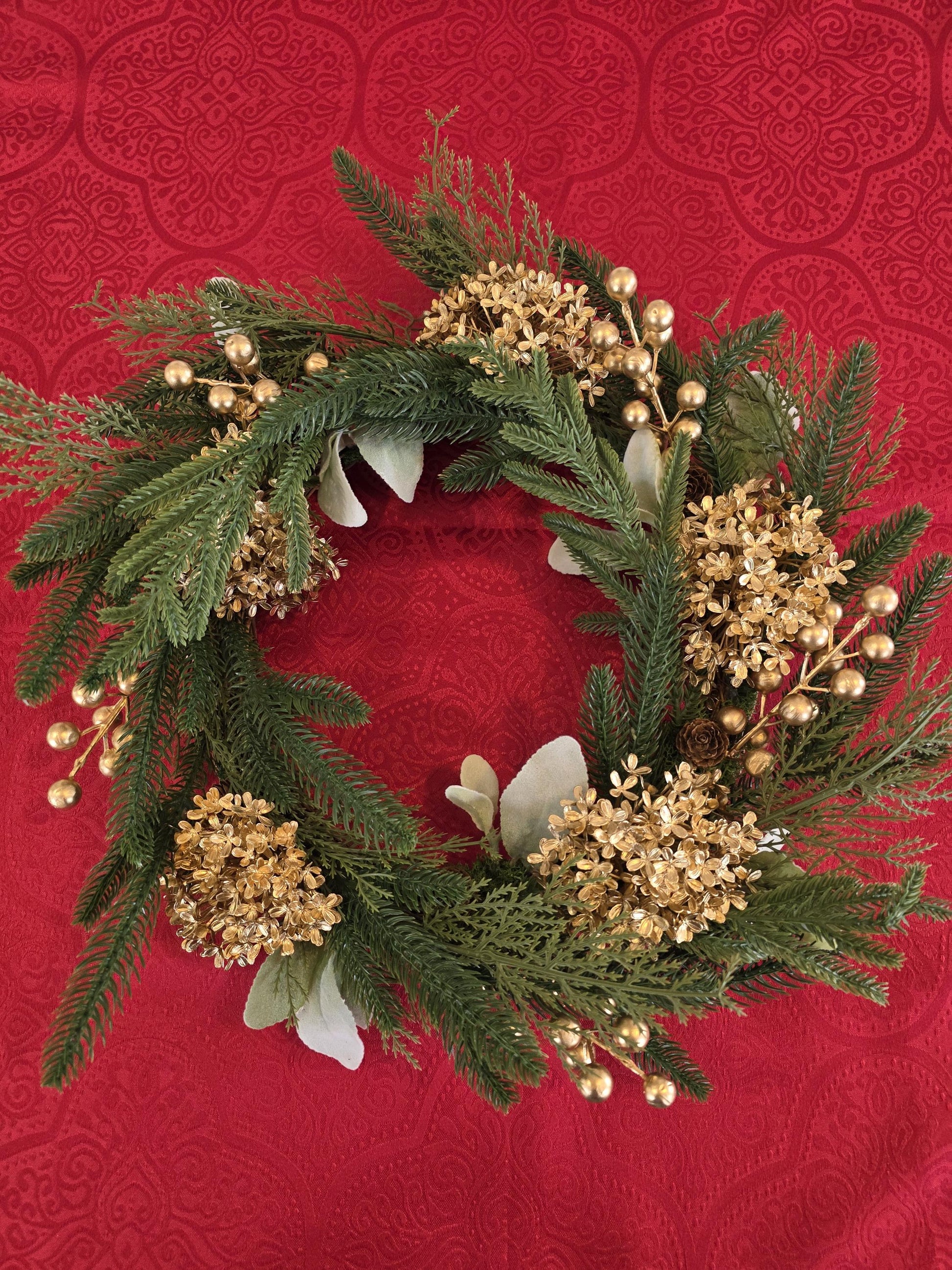 Apportez une touche raffinée et lumineuse à votre décoration avec Hortense, une couronne de Noël unique, entièrement réalisée à la main en France. Sa base en sarments naturels est habillée de branchages variés artificiels, de baies dorées, de pommes de pin et de délicates têtes d’hortensia dorées, créant un équilibre parfait entre élégance et féérie hivernale.